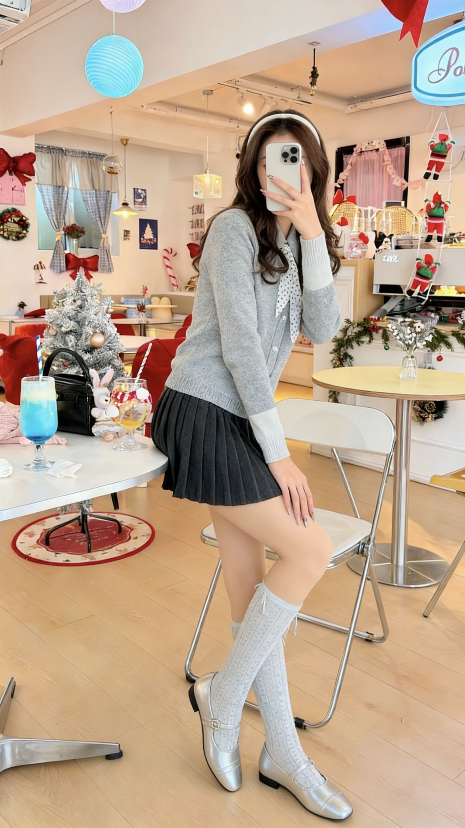 今天在圣诞氛围满满的小店拍了这组图,一整个甜住了 ✨ 搭配思路 浅灰色针织开衫自带温柔滤镜,配上同色系蕾丝中筒袜,把“韩系甜妹”的松弛感焊在身上。 百褶裙+光腿神器的组合,既藏住了肉肉,又让腿部线条看起来纤细又自然。 银色小皮鞋是点睛之笔,让整体造型多了几分精致感。 💡 氛围加分项 白色发箍和波点领结呼应了整套穿搭的浅色系,细节感直接拉满。 在充满圣诞装饰的店里随便一拍,都像韩剧女主角出街! 🌞...