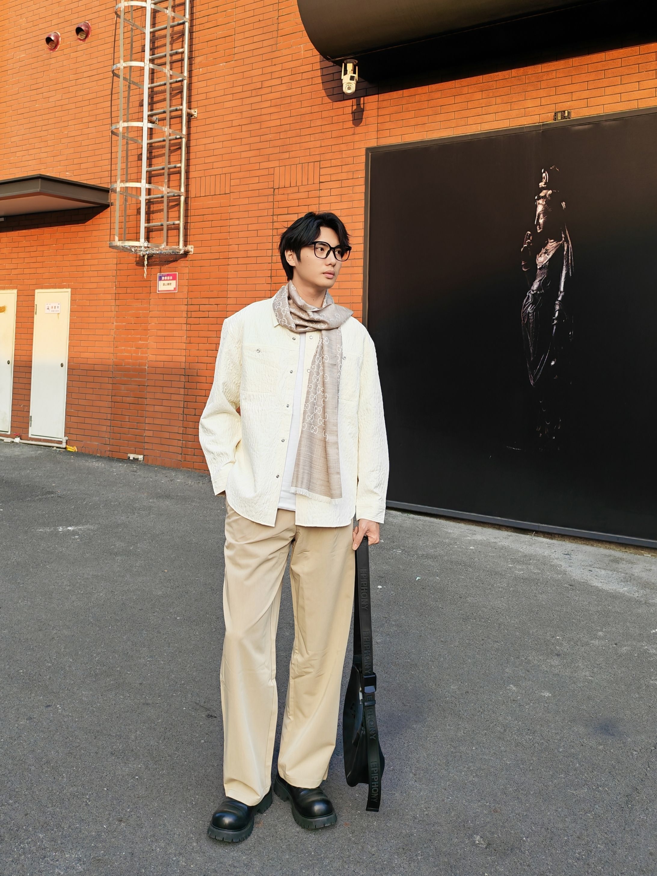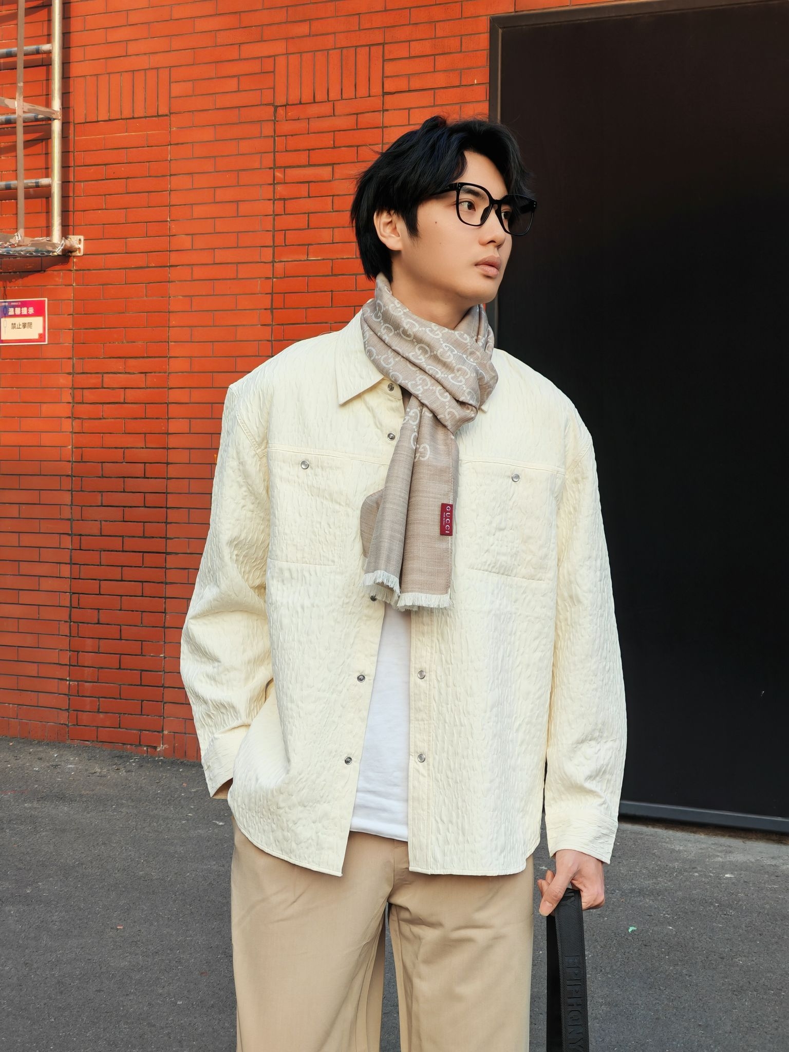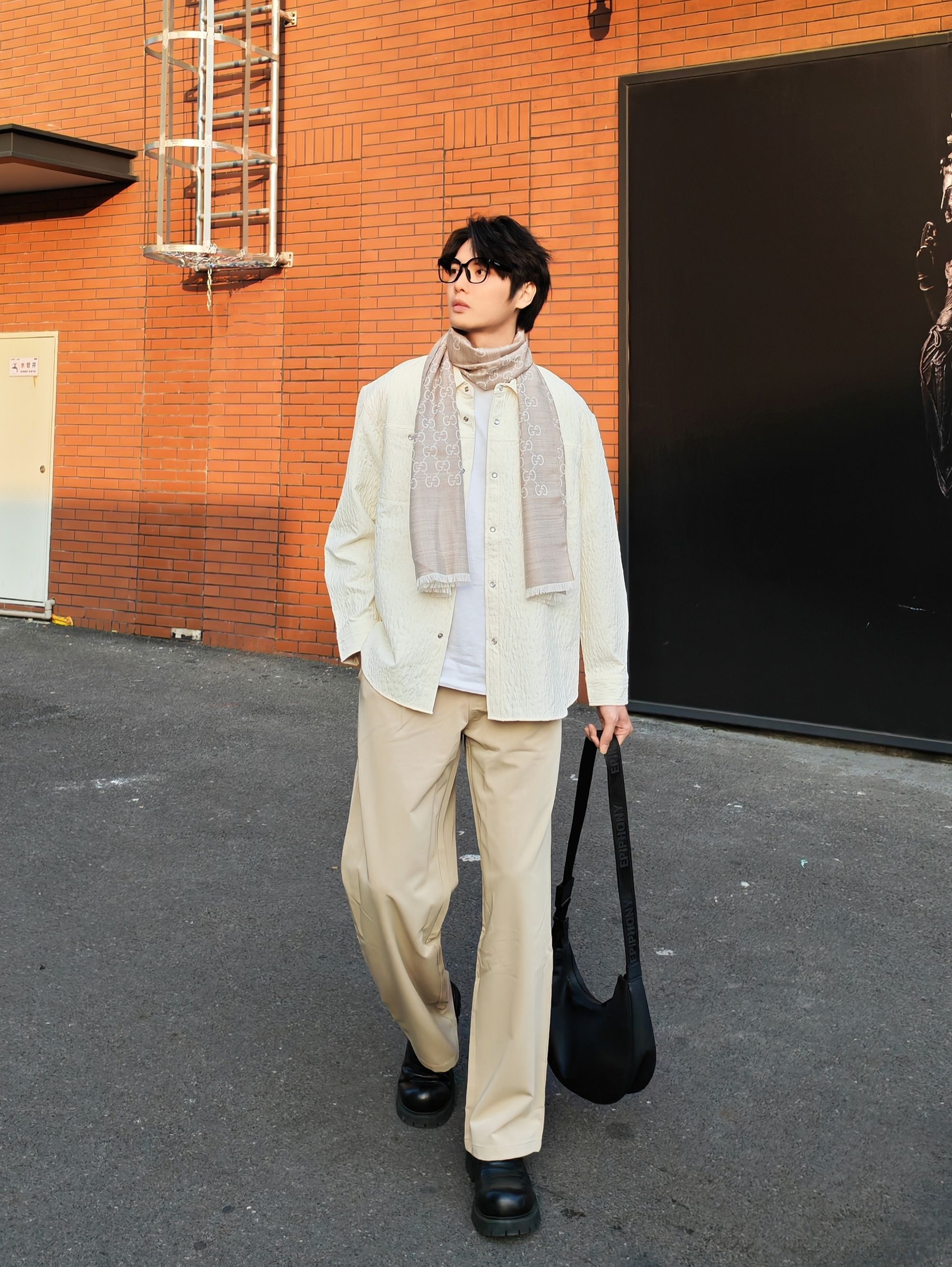今天这套是低饱和度的米白+浅卡其配色,真的温柔又显气质! 上衣选了一件肌理感米白衬衫,宽松版型自带慵懒感,叠穿白T就很有层次 浅卡其阔腿裤垂感绝了,一秒拉长比例,高个子穿直接封神! 点睛之笔是这条#GUCCI 浅灰老花围巾,韩系学长氛围感直接拉满 搭配黑色厚底鞋和大容量单肩包,松弛又不失精致感 ☀️ 下午四点的阳光和红砖墙太配了,随便拍都很出片! 喜欢这种干净温柔风格的男生可以直...