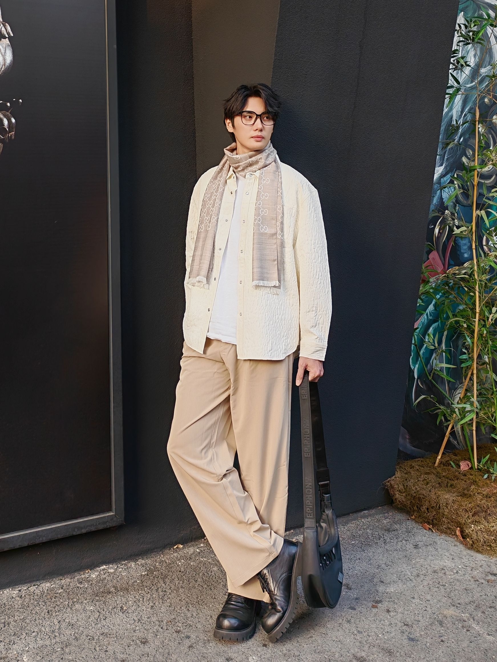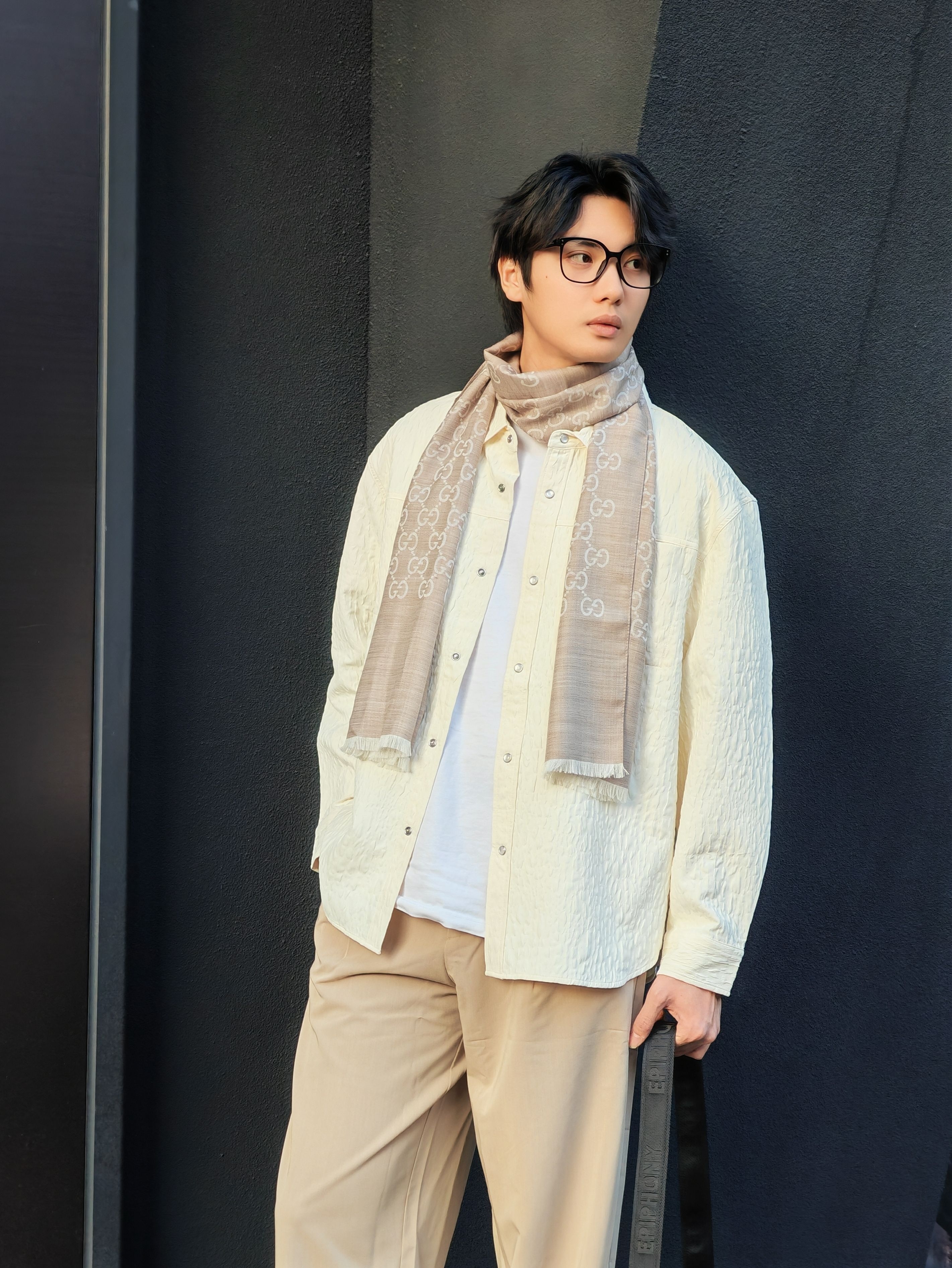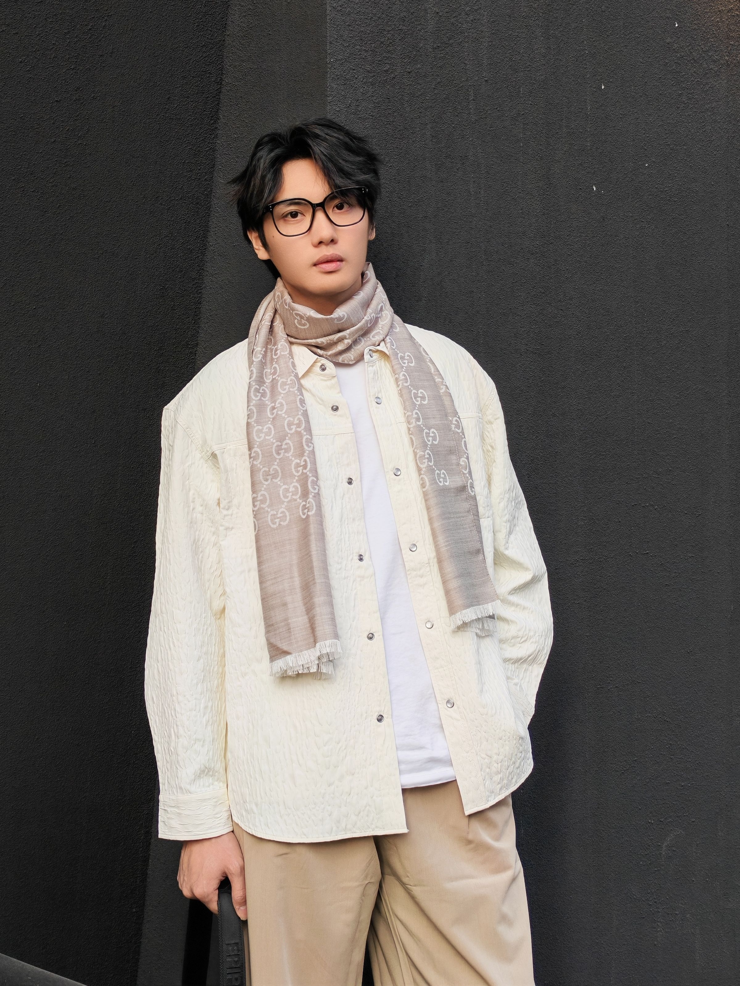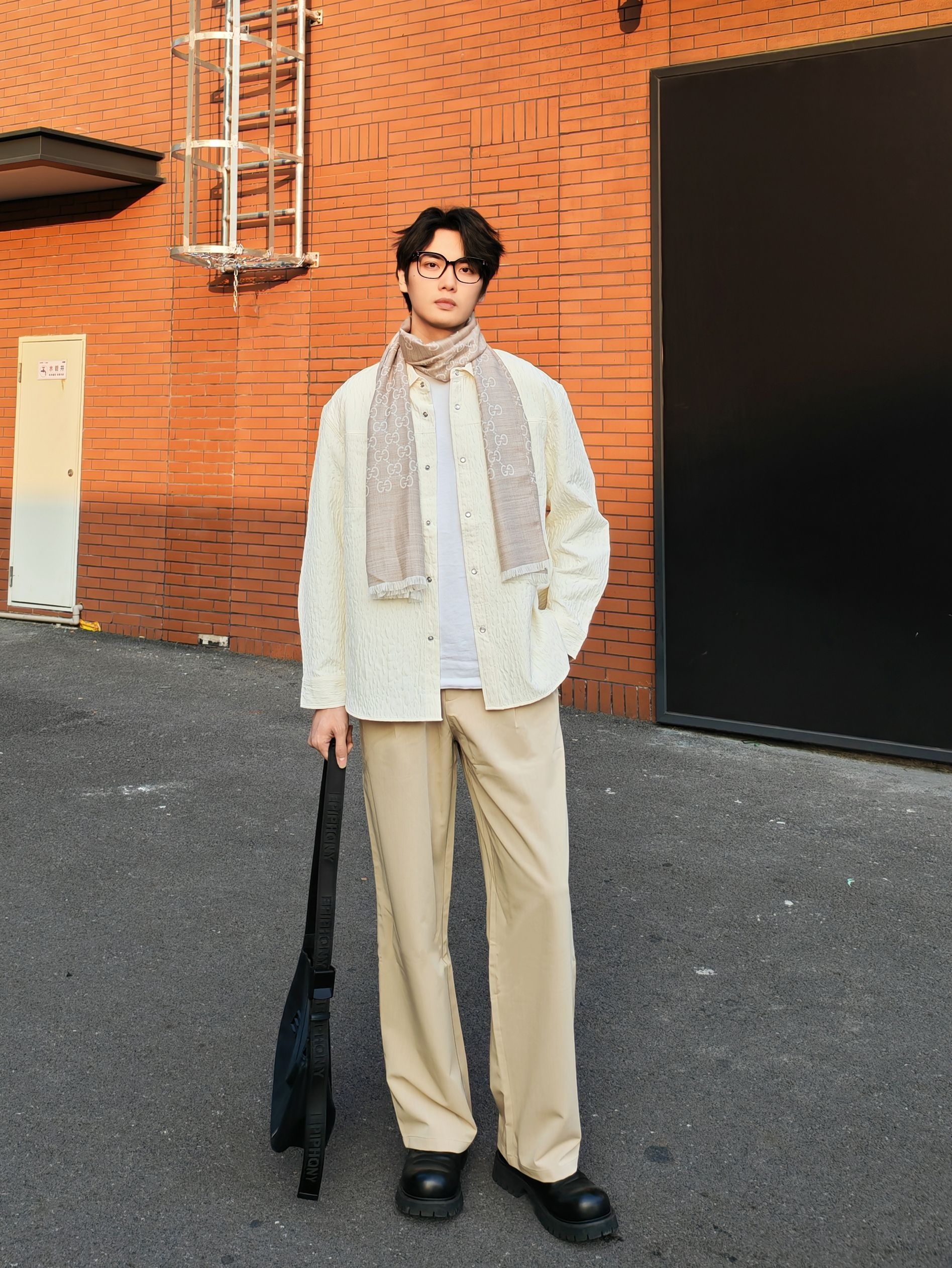 今天这套是低饱和度的米白+浅卡其配色,真的温柔又显气质! 上衣选了一件肌理感米白衬衫,宽松版型自带慵懒感,叠穿白T就很有层次 浅卡其阔腿裤垂感绝了,一秒拉长比例,高个子穿直接封神! 点睛之笔是这条#GUCCI 浅灰老花围巾,韩系学长氛围感直接拉满 搭配黑色厚底鞋和大容量单肩包,松弛又不失精致感 ☀️ 下午四点的阳光和红砖墙太配了,随便拍都很出片! 喜欢这种干净温柔风格的男生可以直...