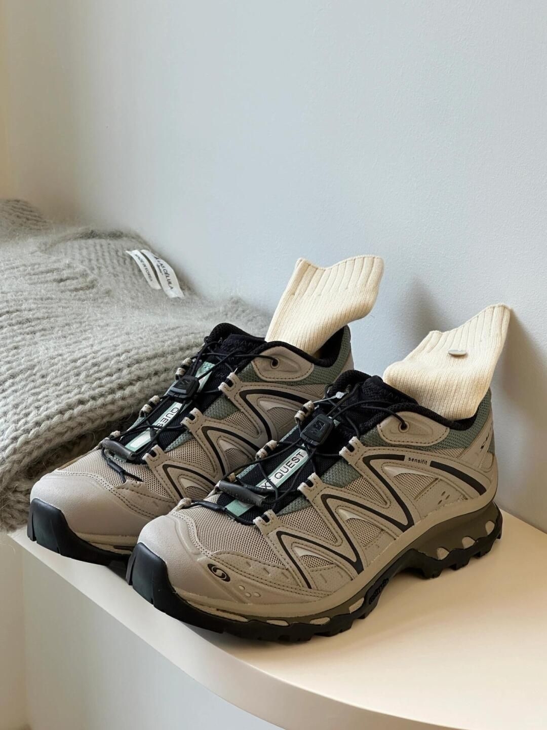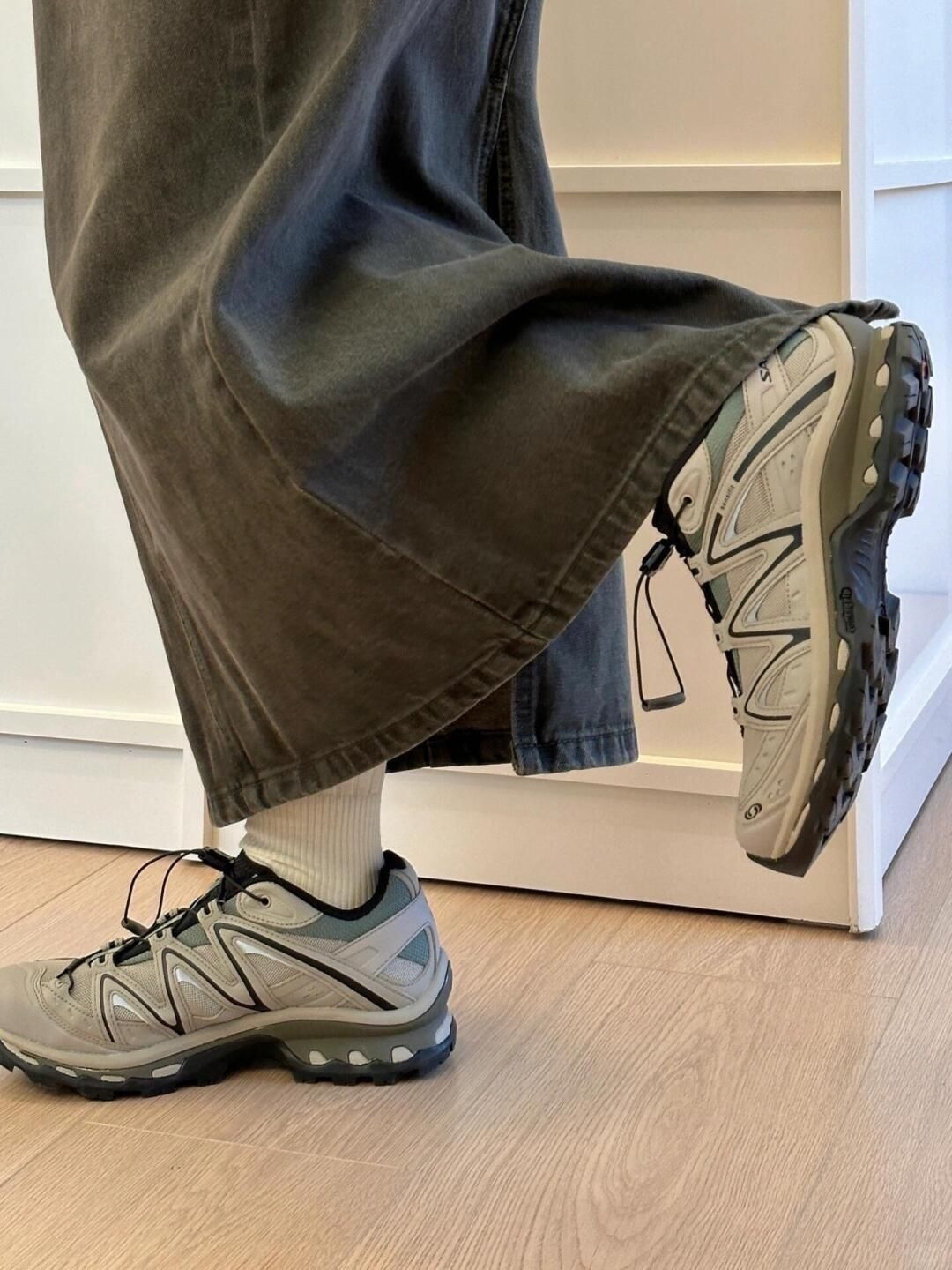 Salomon xt quest 尊嘟爱了 是那种又有机能风 又时髦 又复古 而且脚踝挖口度我很喜欢 显得脚细 前掌的位置要比xt6宽一点 稍微圆钝一点~ 复古的棕绿色系 山系穿搭必备单品 实物尊嘟好看~ 很ins感,又干净清爽 准备下次搭配个燕麦色袜套~