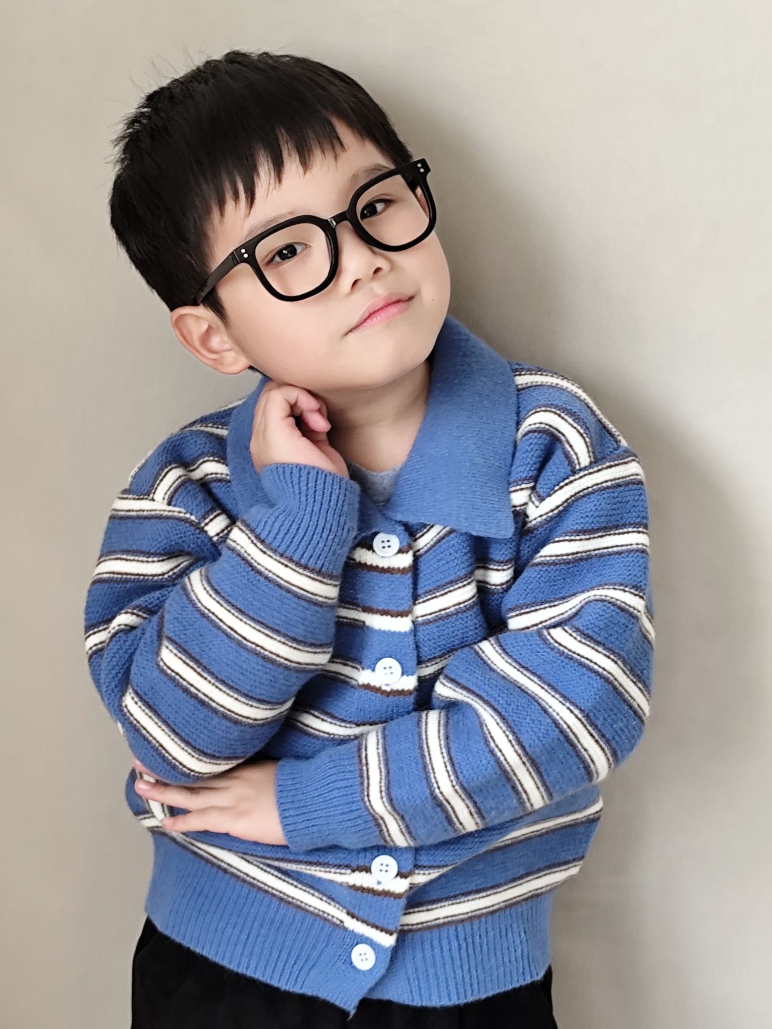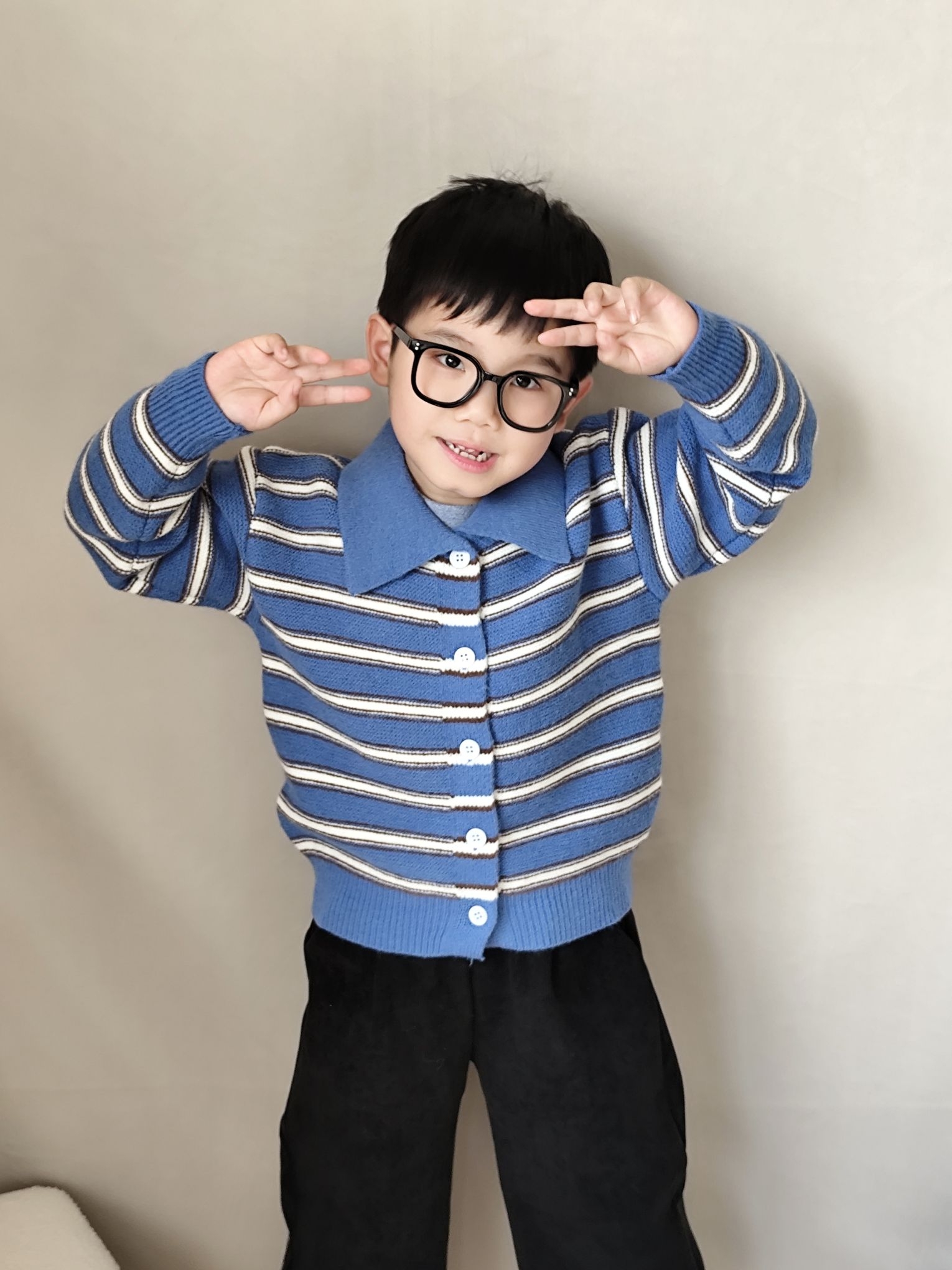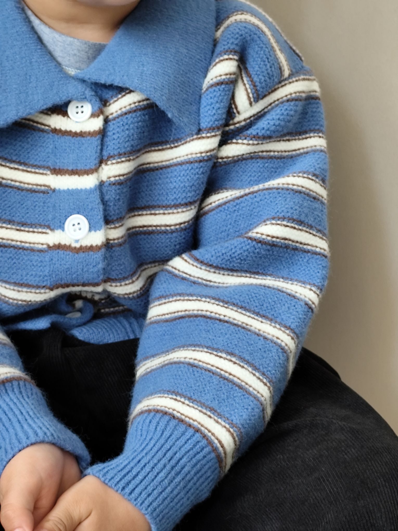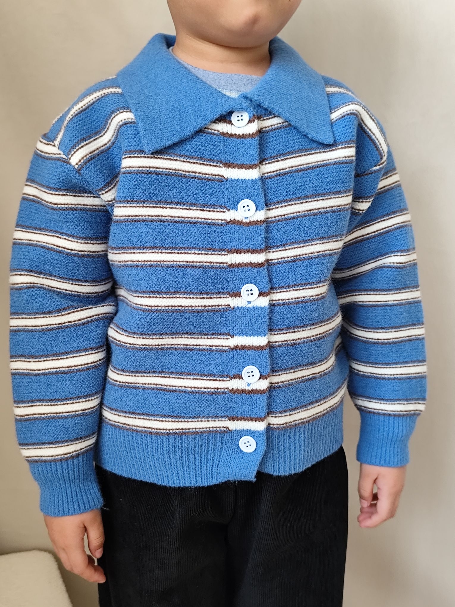 给宸宝搭的这套蓝条纹针织开衫也太出片了!软糯的针织面料贴身穿不扎,软乎乎的材质太适合秋冬了,无论是单穿还是当内搭穿都可以😄😄😄翻领设计还带点小复古,配条宽松版型黑色灯芯绒裤子,休闲又有层次感,娃跑跳不勒腿!小男孩穿蓝调真的超显白~宸宝自己也说穿的舒服不想脱😂😂😂宸宝身高120,买的120码刚刚好✌✌✌