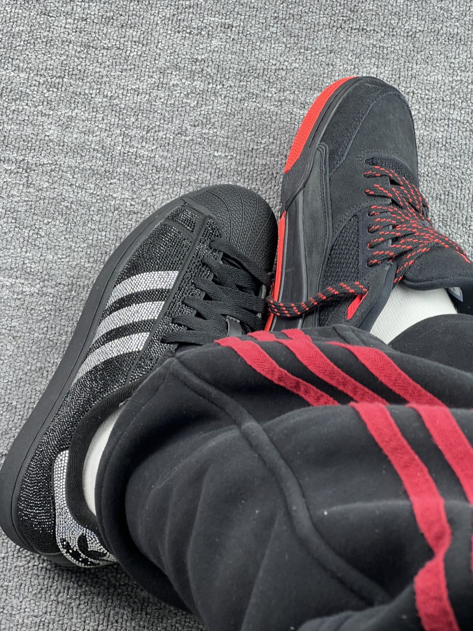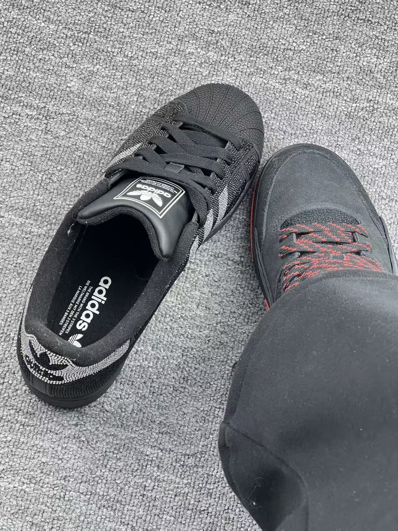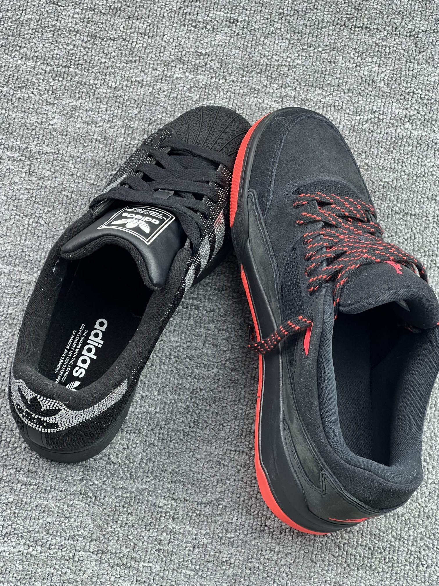 左边:Adidas黑银钻纹贝壳头 拿到手第一感觉就是闪到犯规✨ 黑底铺满银钻纹路,三条纹和后跟的Logo都用钻饰点缀,低调中带着贵气,完全不廉价。 黑银配色巨百搭,配黑裤、牛仔裤都能直接出门,不用想搭配这点我太爱了💯 脚感是经典板鞋的偏硬质感,好在鞋型贴合度不错,日常通勤走路完全没问题。 但缺点也很明显: - 夏天穿会有点闷脚,透气性一般 - 钻纹部分如果碰到硬物可能勾丝,需要小心...