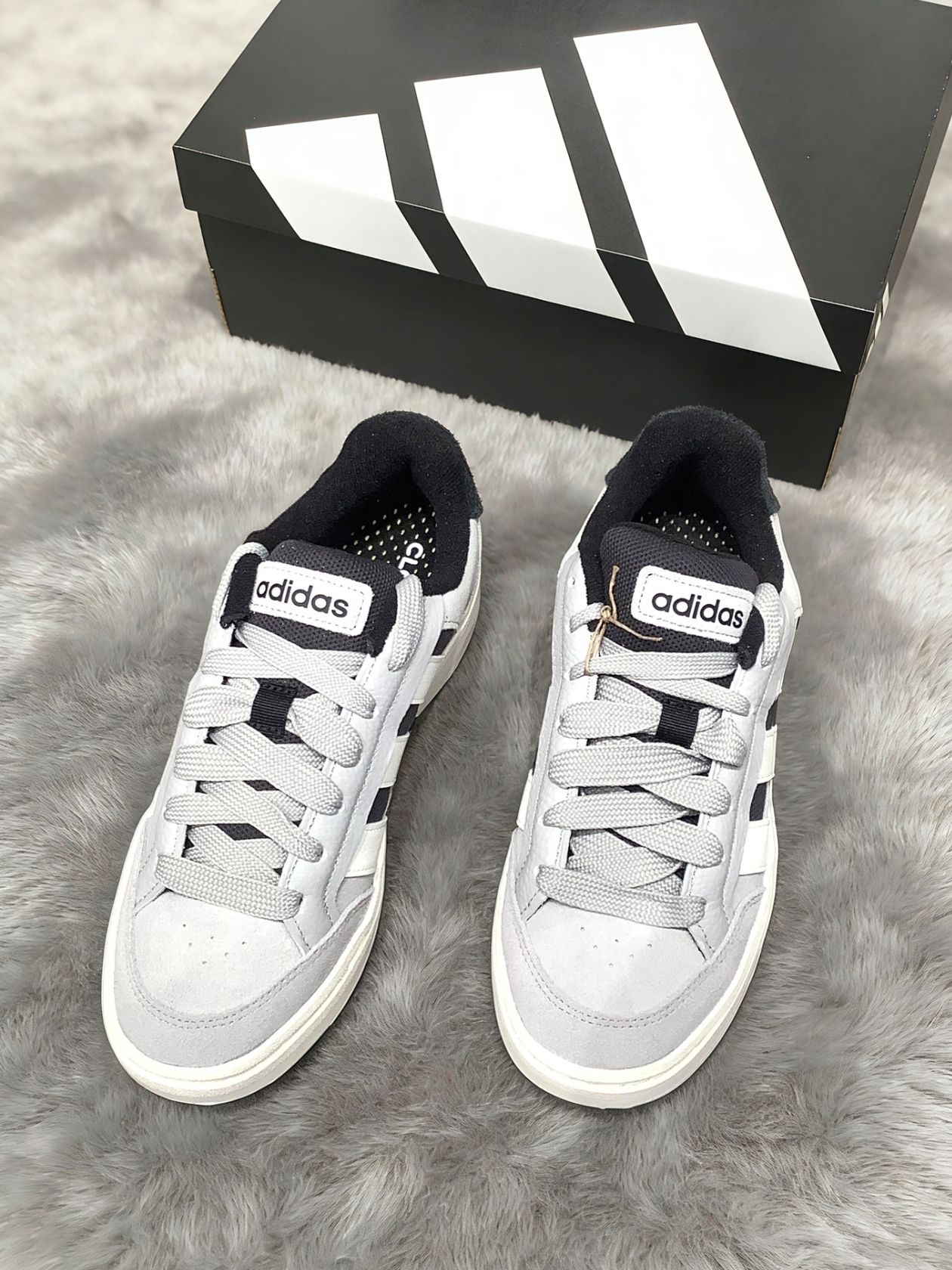 它的灰黑配色很低调百搭,牛仔裤、运动裤都能搭出松弛感。鞋身用的是翻毛皮+网布拼接,触感柔软又透气,南方开春穿也不会闷脚。鞋舌的adidas小标简约不张扬,鞋型是微微宽楦的设计,对脚宽的人很友好。 上脚踩感偏软弹,走路久了也不累,鞋边的做旧细节还带点复古感,日常随便穿穿都很舒服。