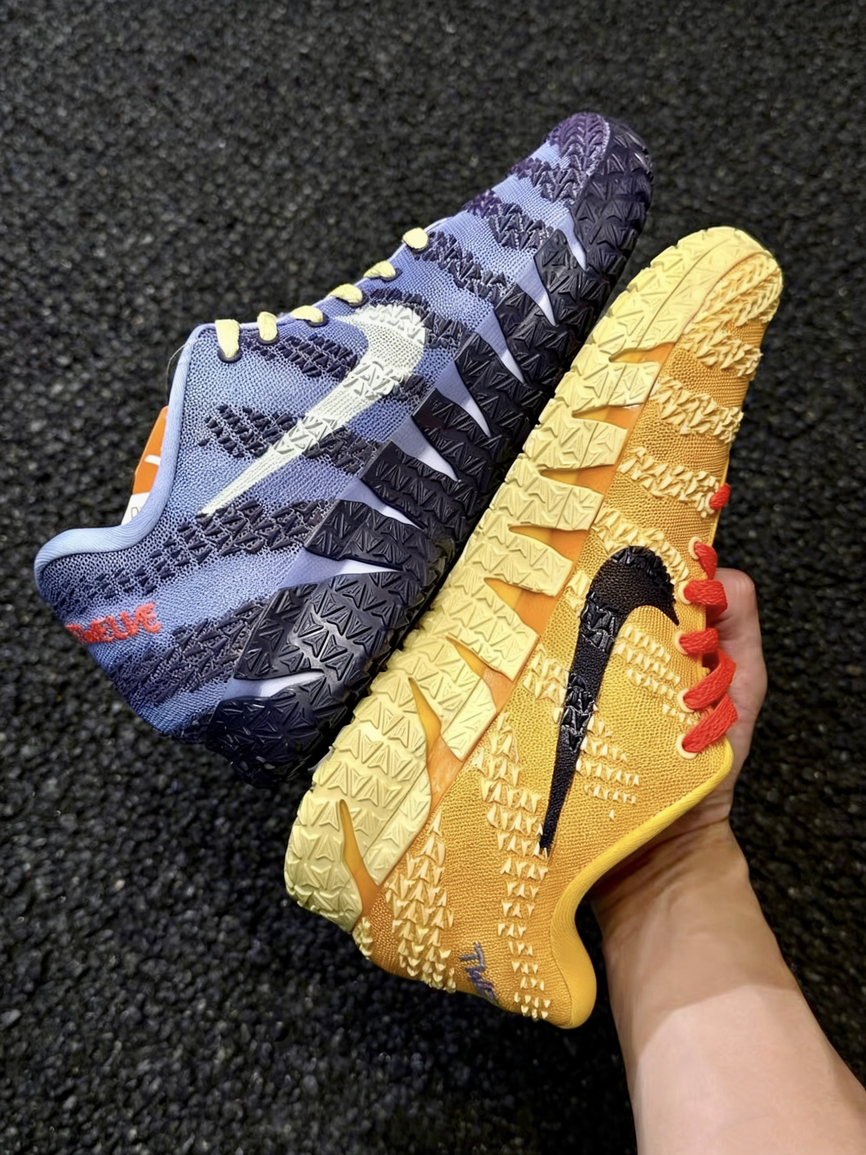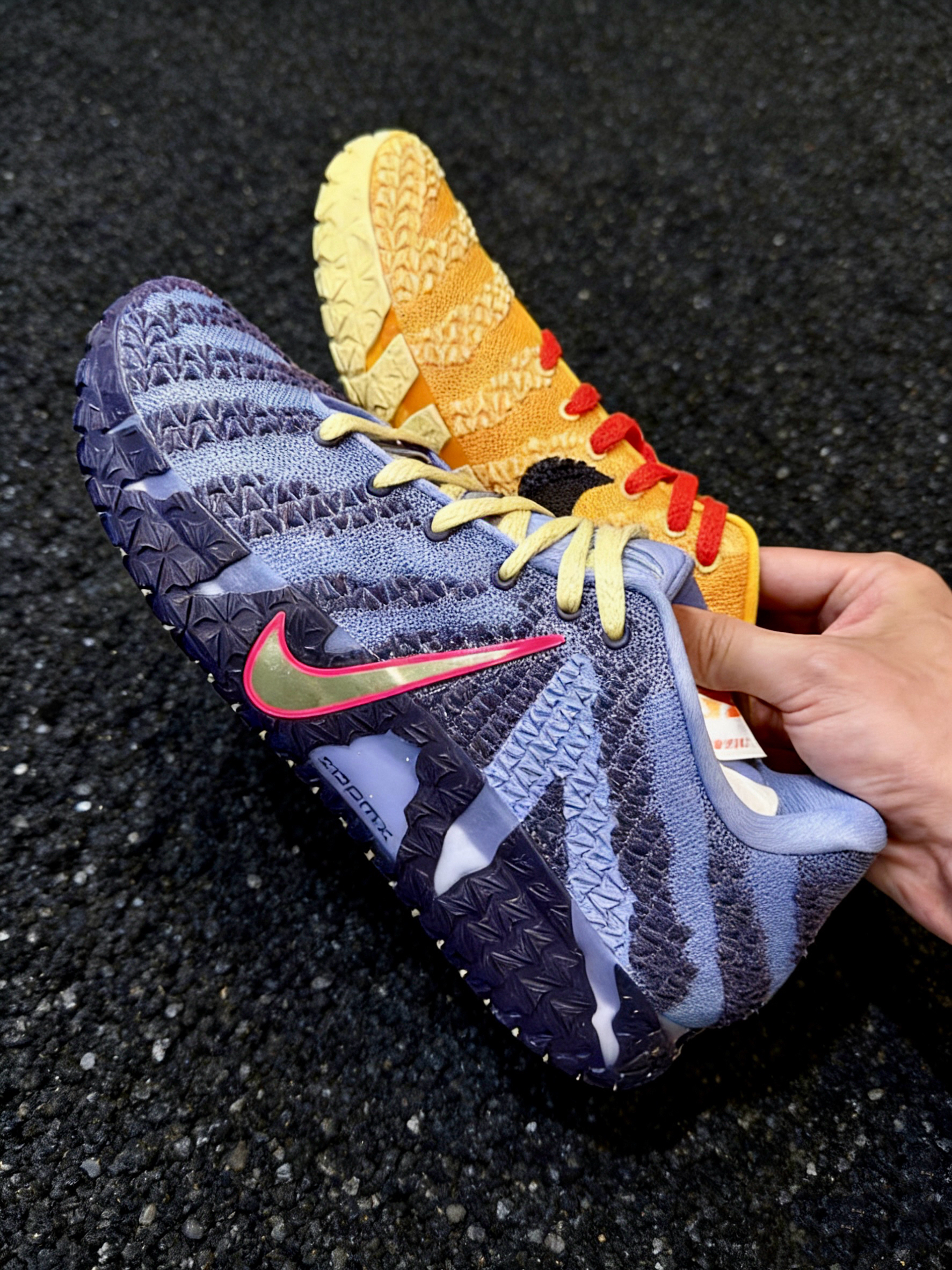 🎨 设计解读:天生焦点,为高光时刻而生 这可能是为莫兰特性格量身打造的最张扬配色之一。其设计灵感直接来源于孟菲斯灰熊队的标志性配色,以及球场边时刻准备记录精彩瞬间的媒体摄影背心。左右脚采用非对称的亮蓝色与明黄色对撞,视觉冲击力极强,无论静态摆放还是动态跑动,都自带高光滤镜。鞋面采用可再生材料打造,配合侧身标志性的撕裂感TPU骨架,将环保理念与前卫设计融为一体,辨识度直接拉满。 ⚙️ 核心科技:...