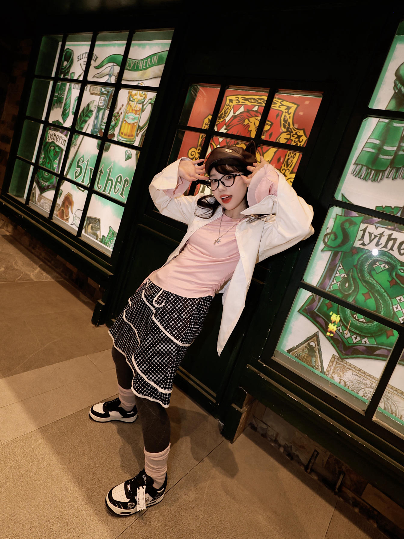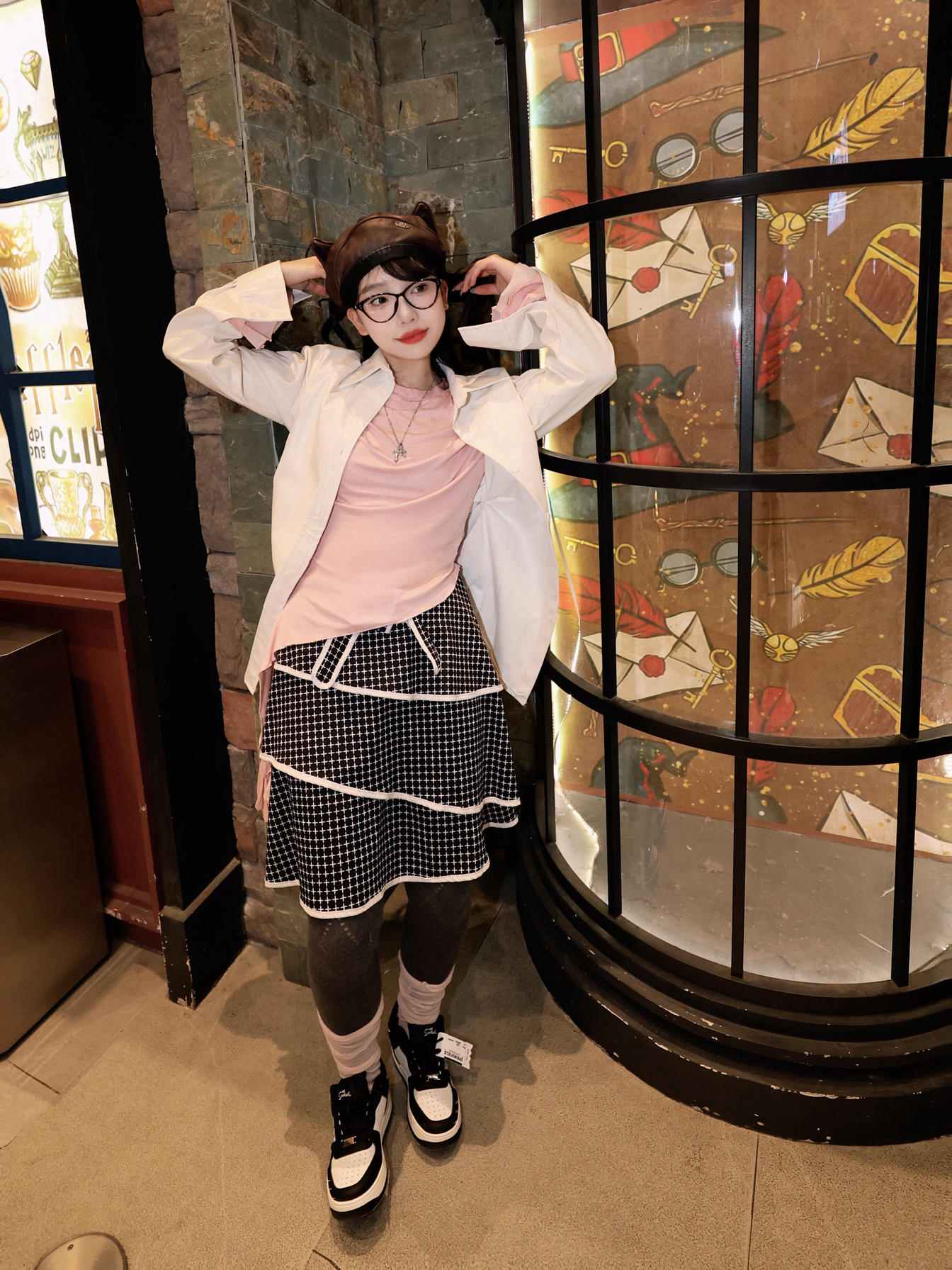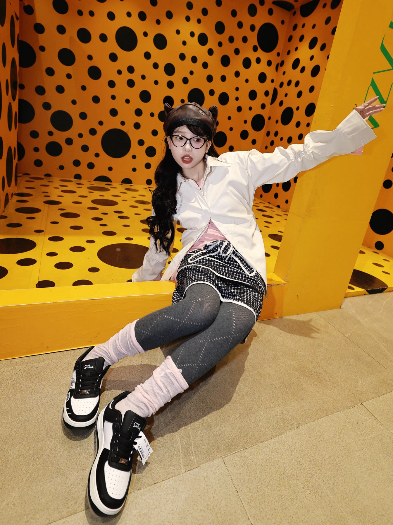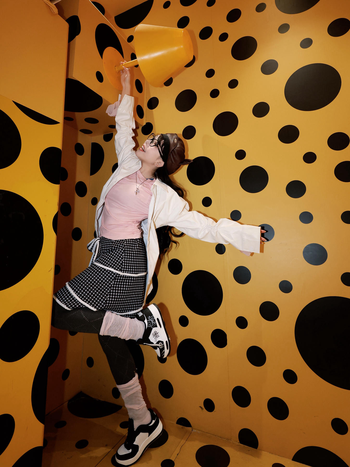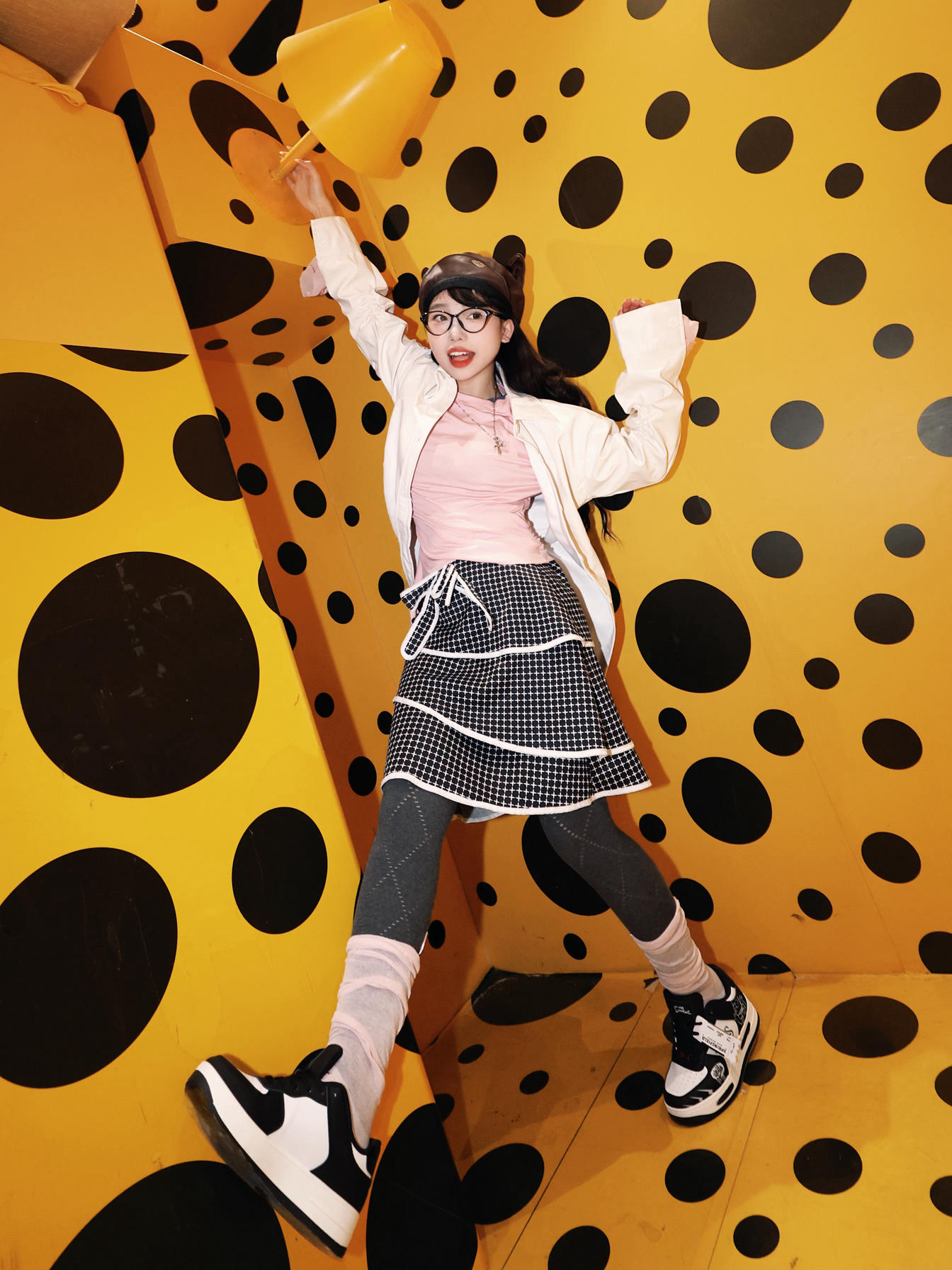 钻进满是波点的房间,感觉自己也成了画里的一部分 今天穿的有点可爱 粉色内搭 + 宽松白衬衫 叠上百褶短裙和打底袜 松弛又有甜美感 这身📷酷酷出片!