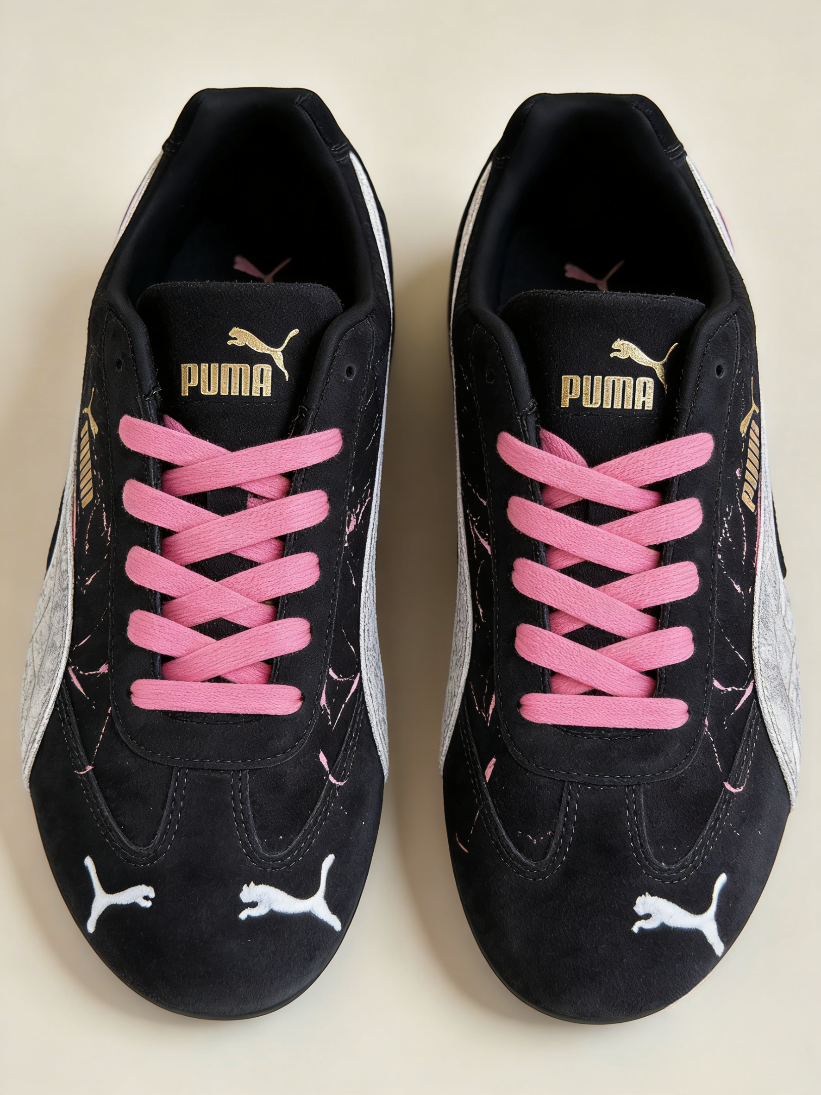 黑粉配色直接戳中我的心巴💖 经典黑麂皮+泼墨涂鸦设计,又甜又拽 粉色鞋带一换,甜酷感直接拉满 上脚是复古赛车鞋型,贴脚显腿细 麂皮材质软乎乎的,暴走一天都不累 配短裙是辣妹,配工装裤是酷姐 一鞋两穿,风格随便切换! 春天就靠这双鞋出片了,谁穿谁是甜酷天花板!✨