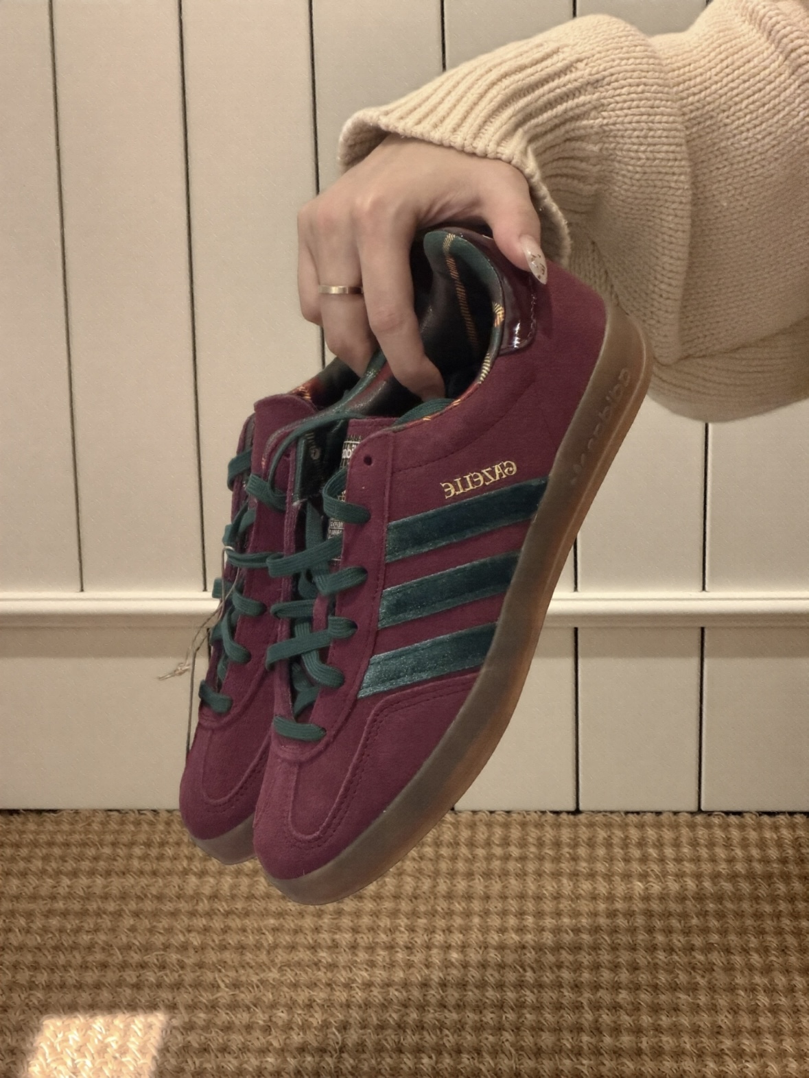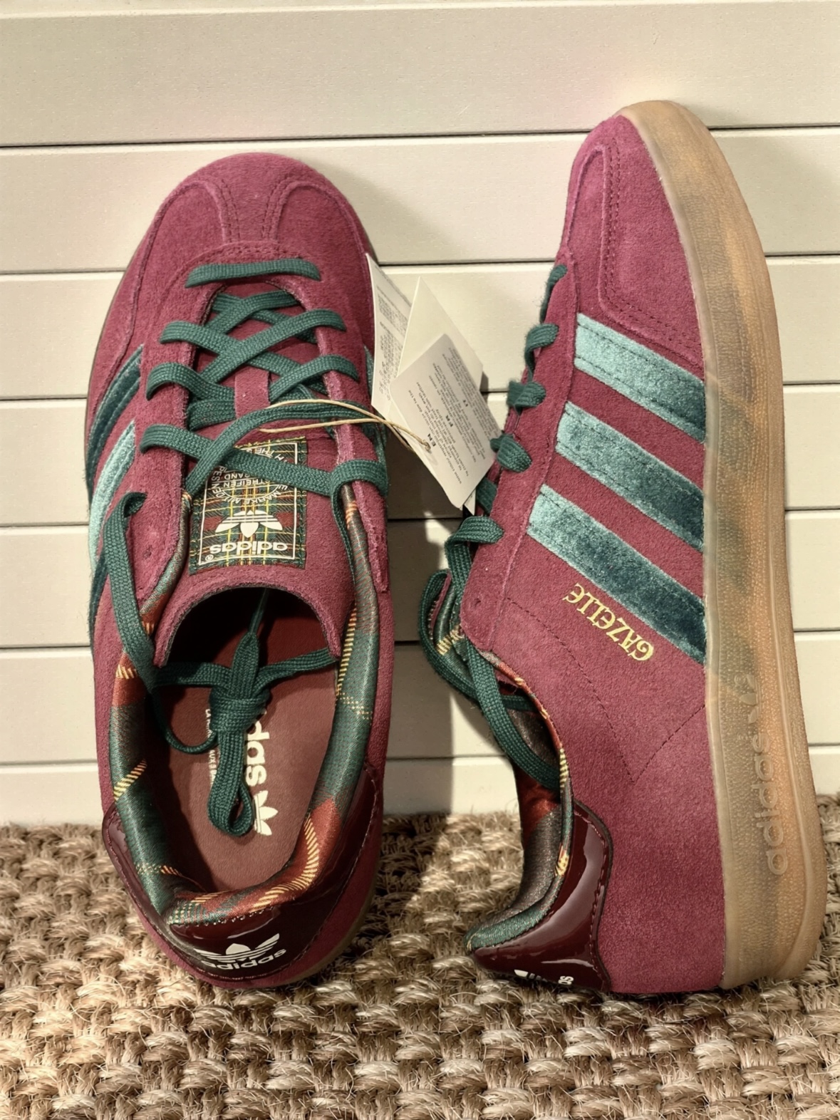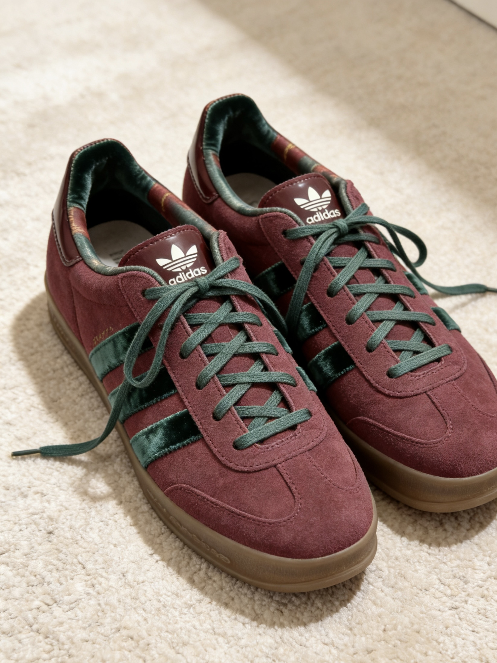 穿上这双阿迪达斯GAZELLE泰开心了,墨绿色丝绒三条杠看着就复古。麂皮鞋面摸着泰舒服,同色鞋带系个死结随性又自在。最惊喜的是内衬格子纹路,细节到位。随便穿穿有型!👟