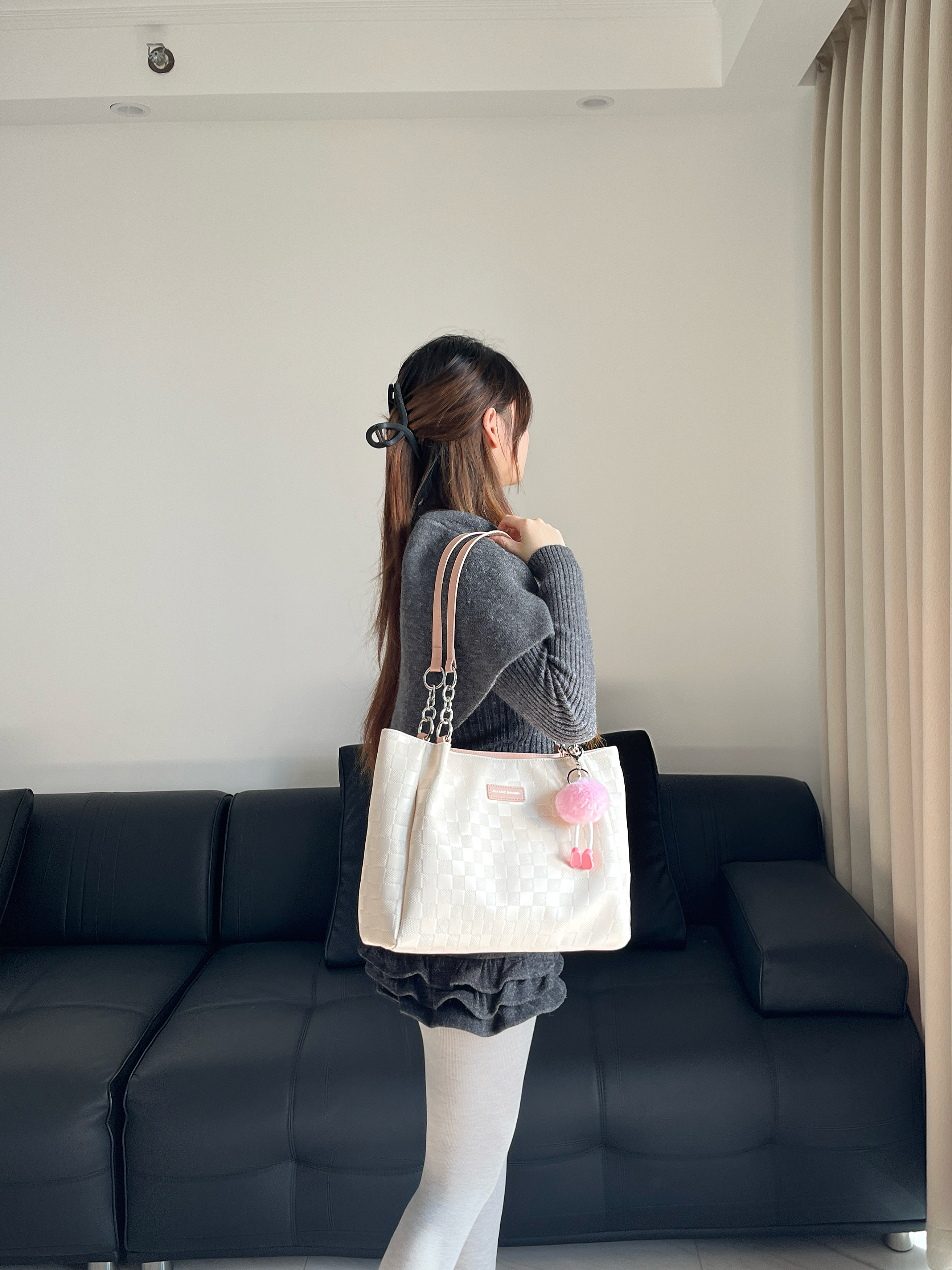 最近新入的Crtnzo Kroez托特包真的太懂我了!米白拼粉的配色温柔又显质感,棋盘格纹设计简约又带点小精致,不管搭毛衣还是西装都很适配。 最惊喜的是它的容量,日常通勤装得下电脑、水杯和补妆包,甚至还能塞下一把遮阳伞,对打工人来说真的太实用了!肩带的长度刚好,单肩背不会滑,也不会压肩膀,背一天都很舒服。这个春天就靠它承包我的所有出门场景啦~