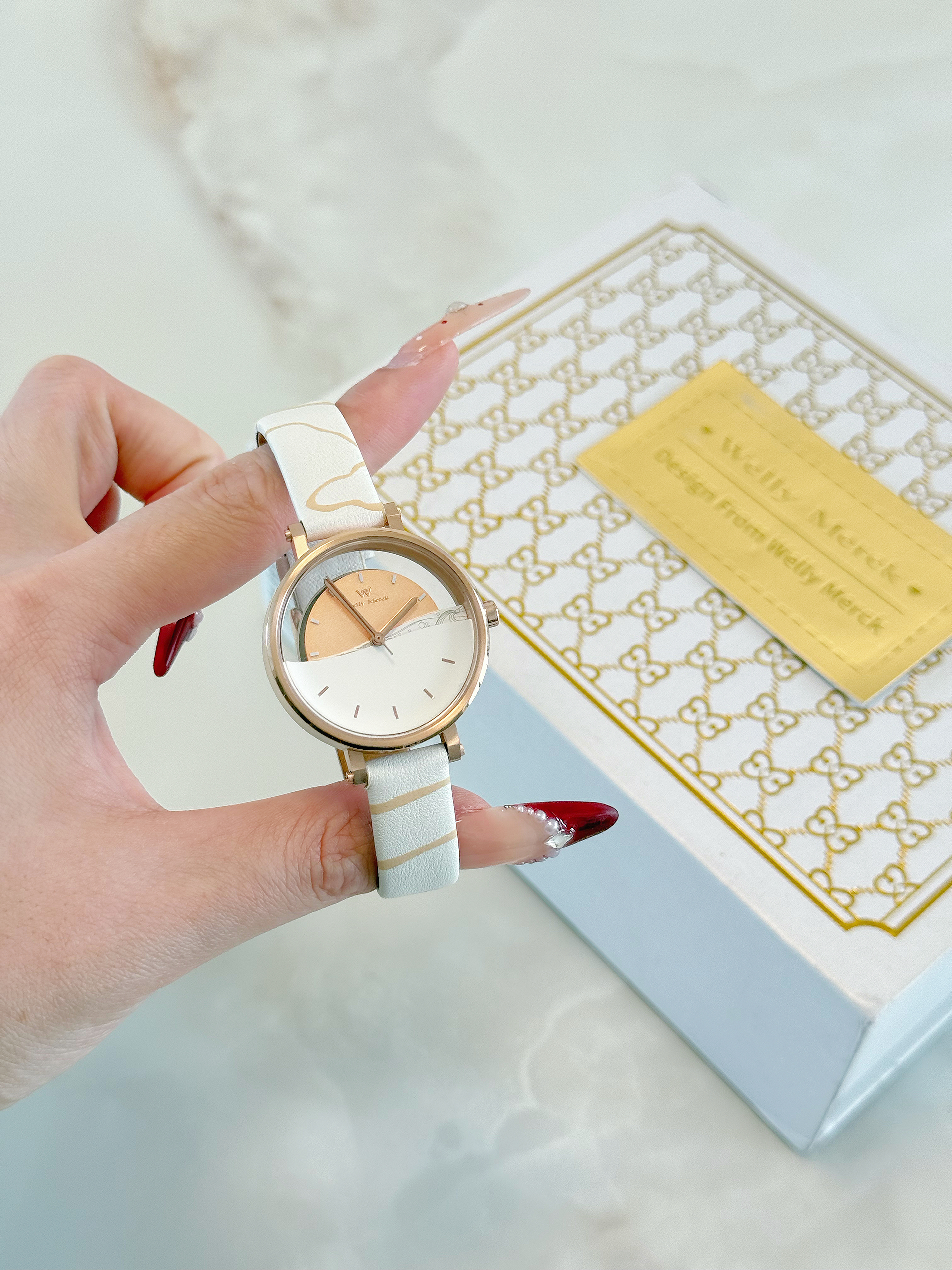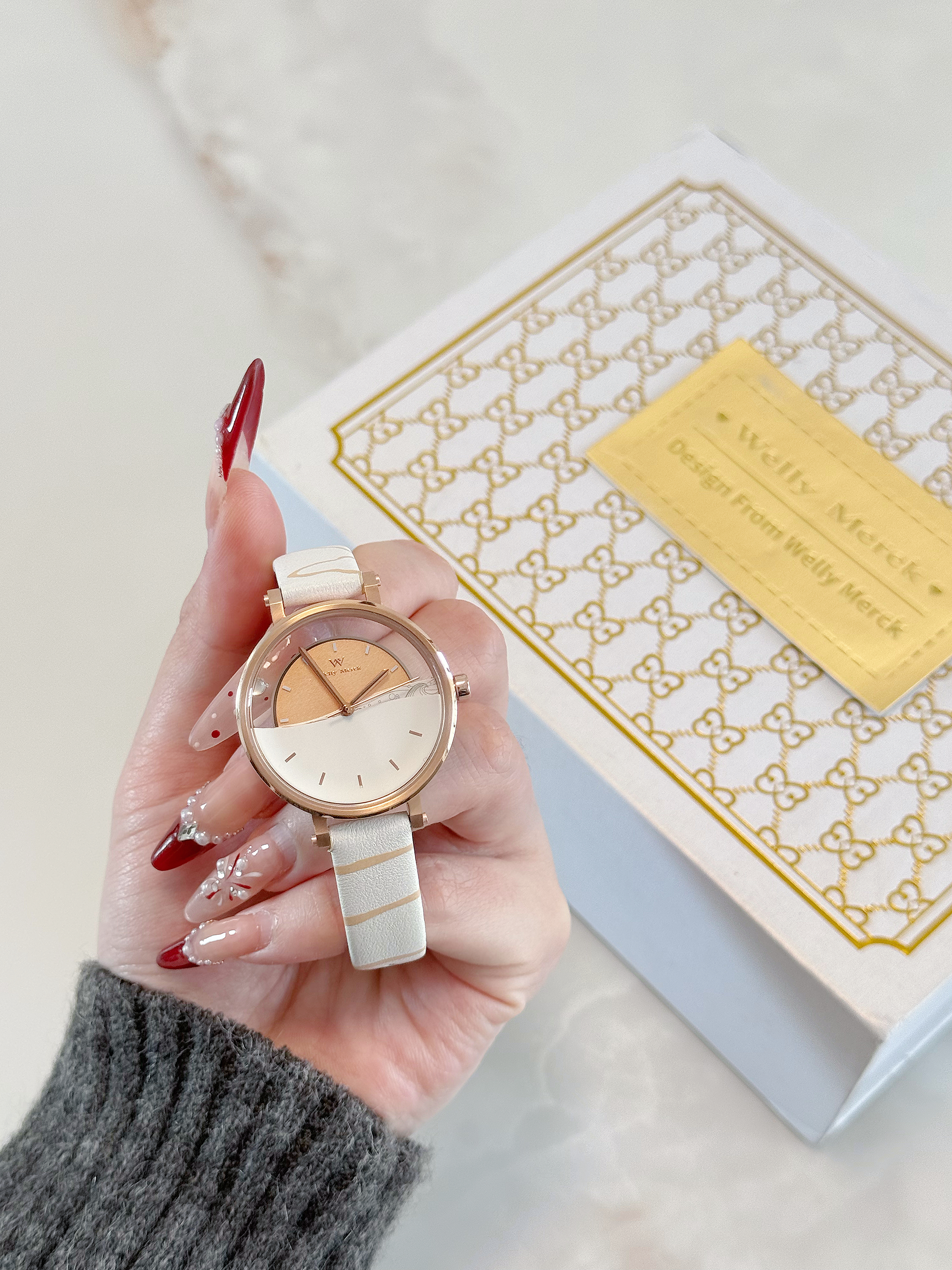 最近新入的威利默克双面半镂空手表,真的成了我出门的标配!玫瑰金的边框配上白纹皮带,温柔又精致,半镂空的设计带点小心机,在光下看特别有质感。 今天穿的这套灰色针织衫+裙裤,走的是温柔松弛感路线,配上这块表直接氛围感拉满!表盘大小刚好贴合手腕,不会笨重,日常洗手不用摘,50米防水对我这种懒人来说太友好了。 戴了快一周,走时很准,质感也在线,学生党和刚上班的姐妹都能冲,百元价位能有这品质真的很惊喜~