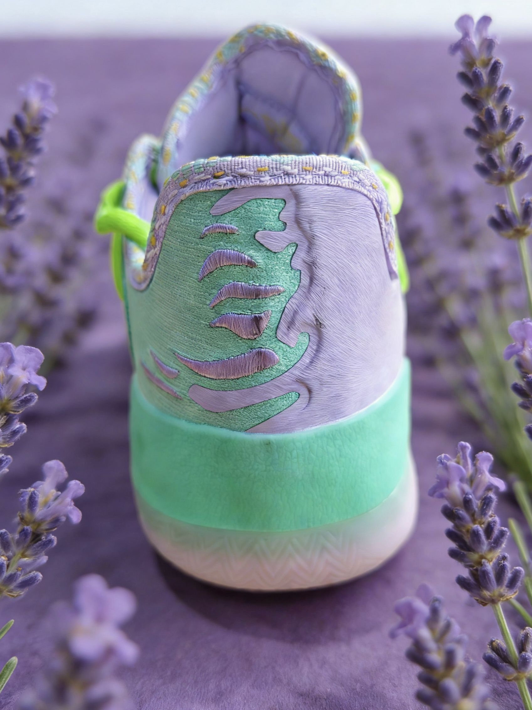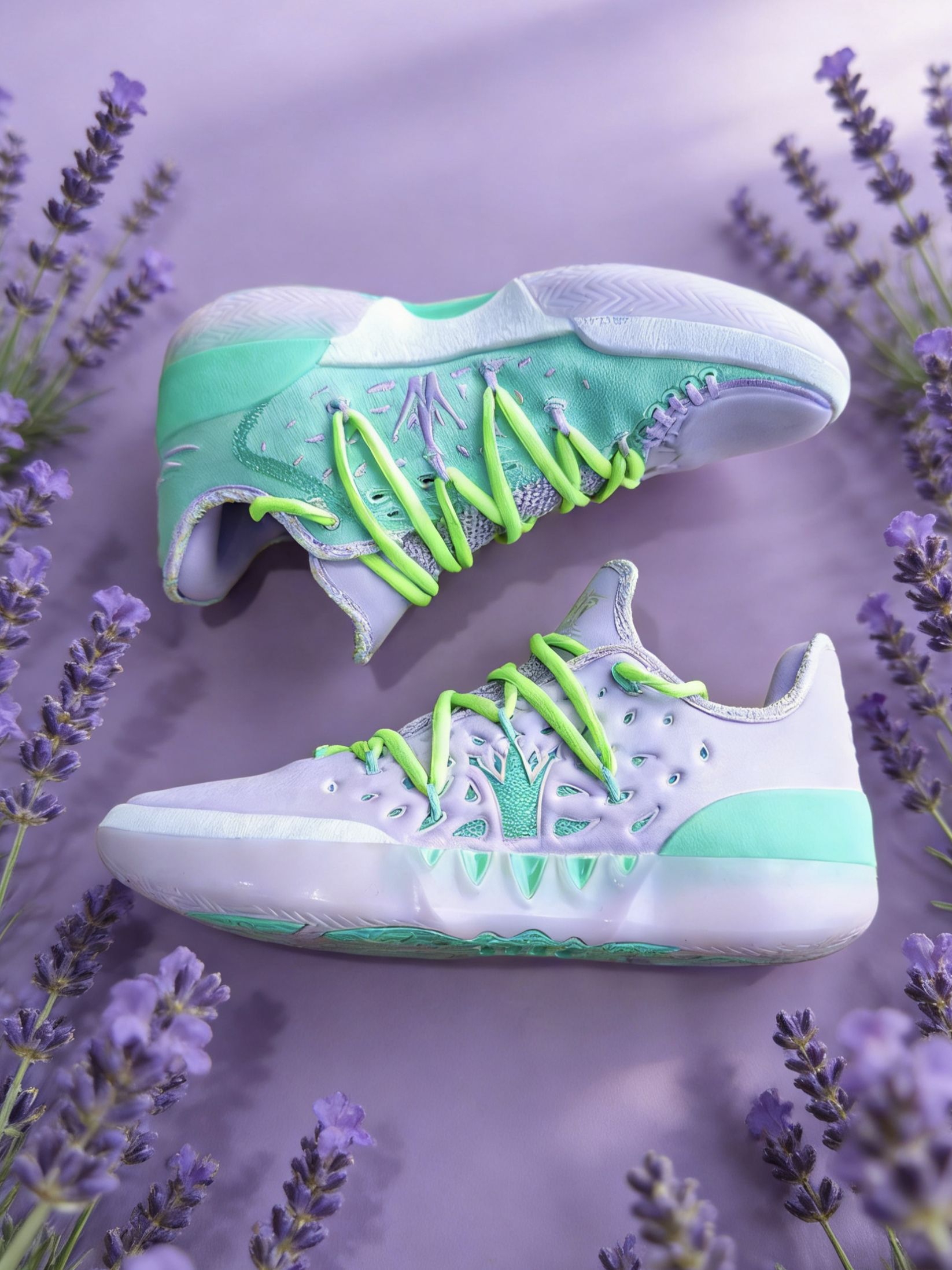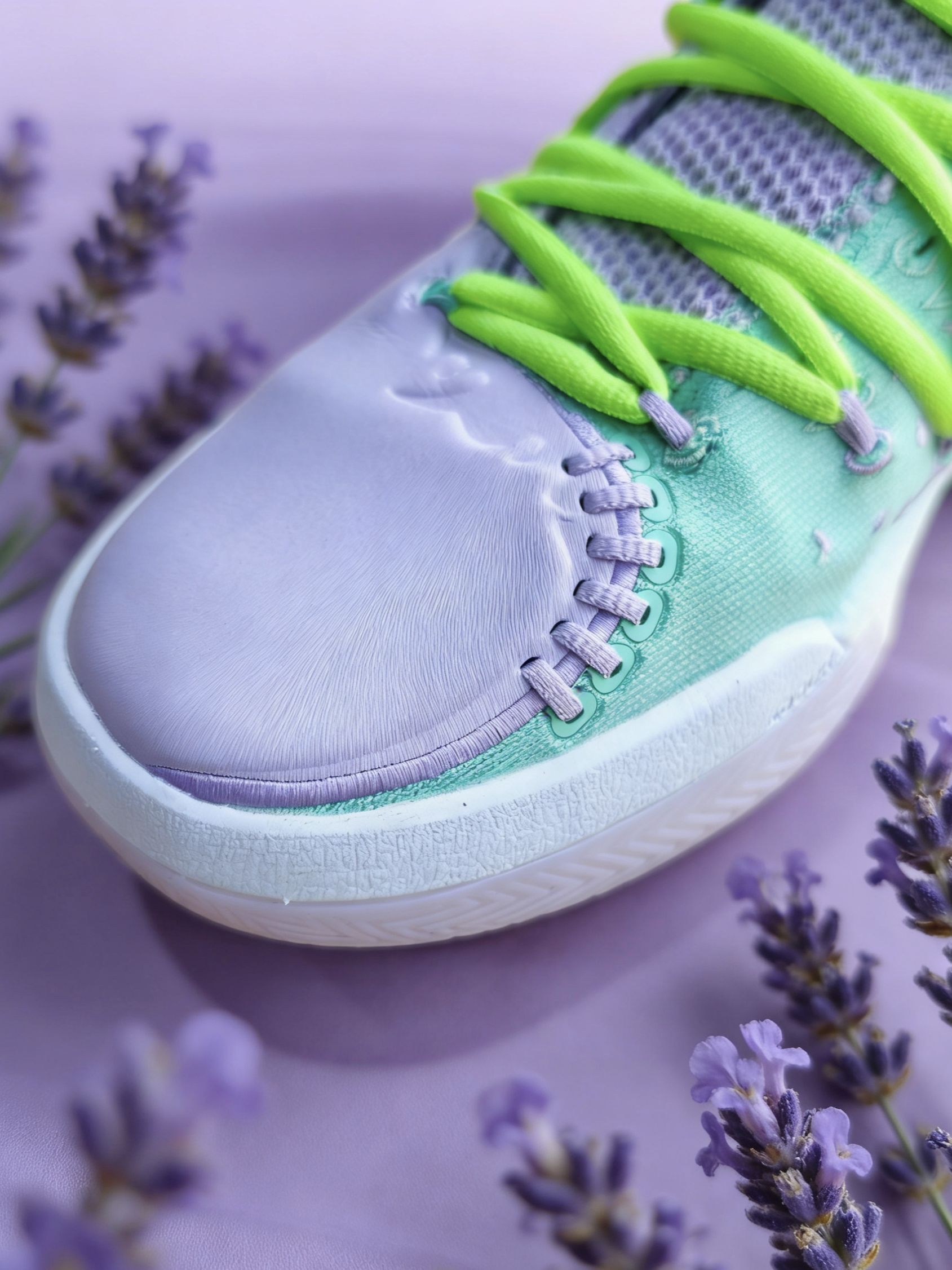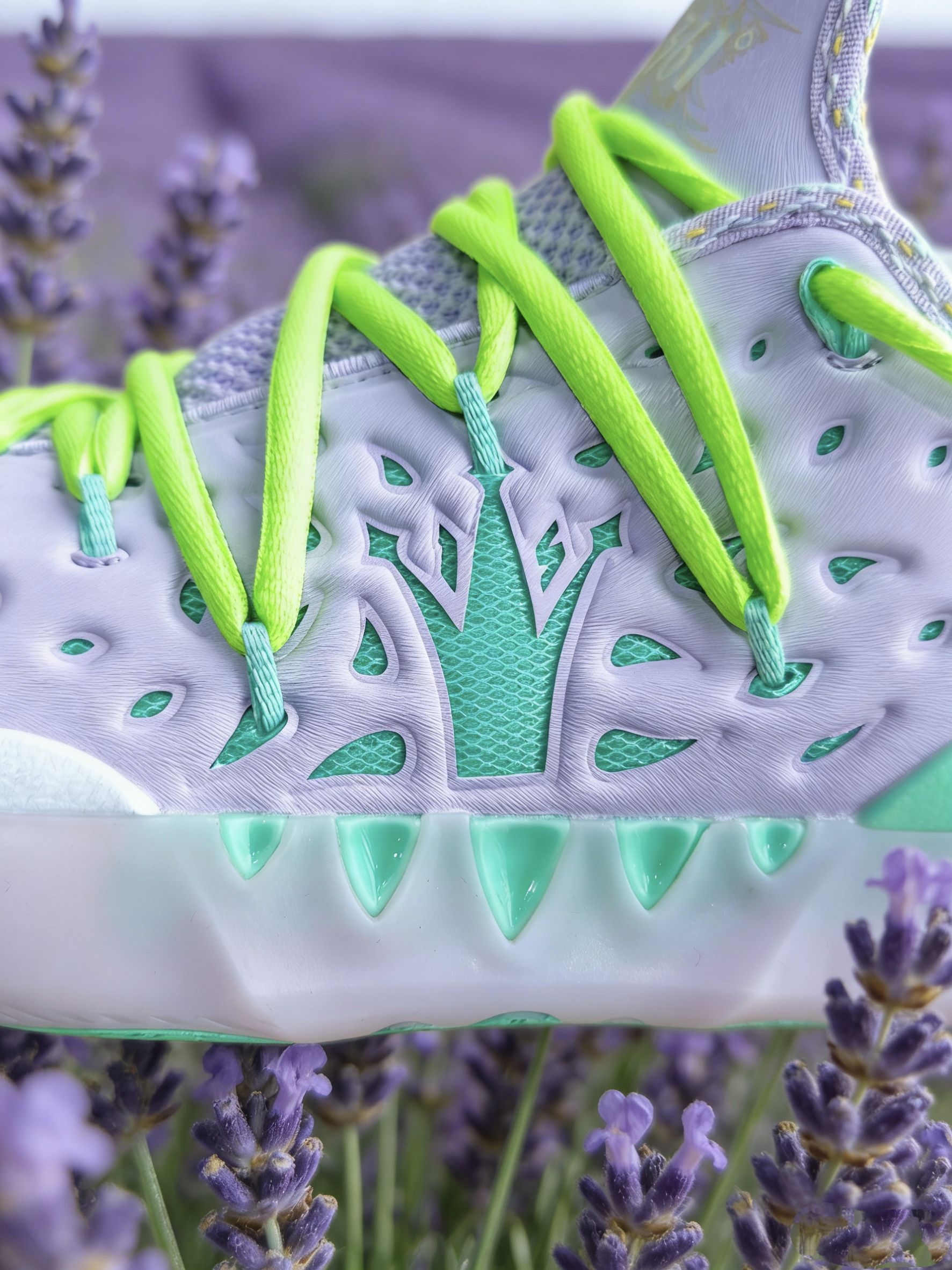 刚拆开快递箱就被这抹淡紫撞薄荷绿的清新感戳中!淡紫色合成革鞋头搭配薄荷绿网布鞋身,荧光绿鞋带瞬间点亮整体色调,像把普罗旺斯的薰衣草田穿在了脚上。 鞋面的树状纹理TPU模块暗藏巧思,后跟的渐变刺绣纹路呼应约基奇的球场风格,鞋舌上的皇冠Logo与专属签名更是直接点明身份。摸起来软弹的中底和透气网布,既保证了支撑性又兼顾舒适感,已经迫不及待穿上它,去球场复刻约老师的梦幻脚步了! 要不要我再帮你写一个...