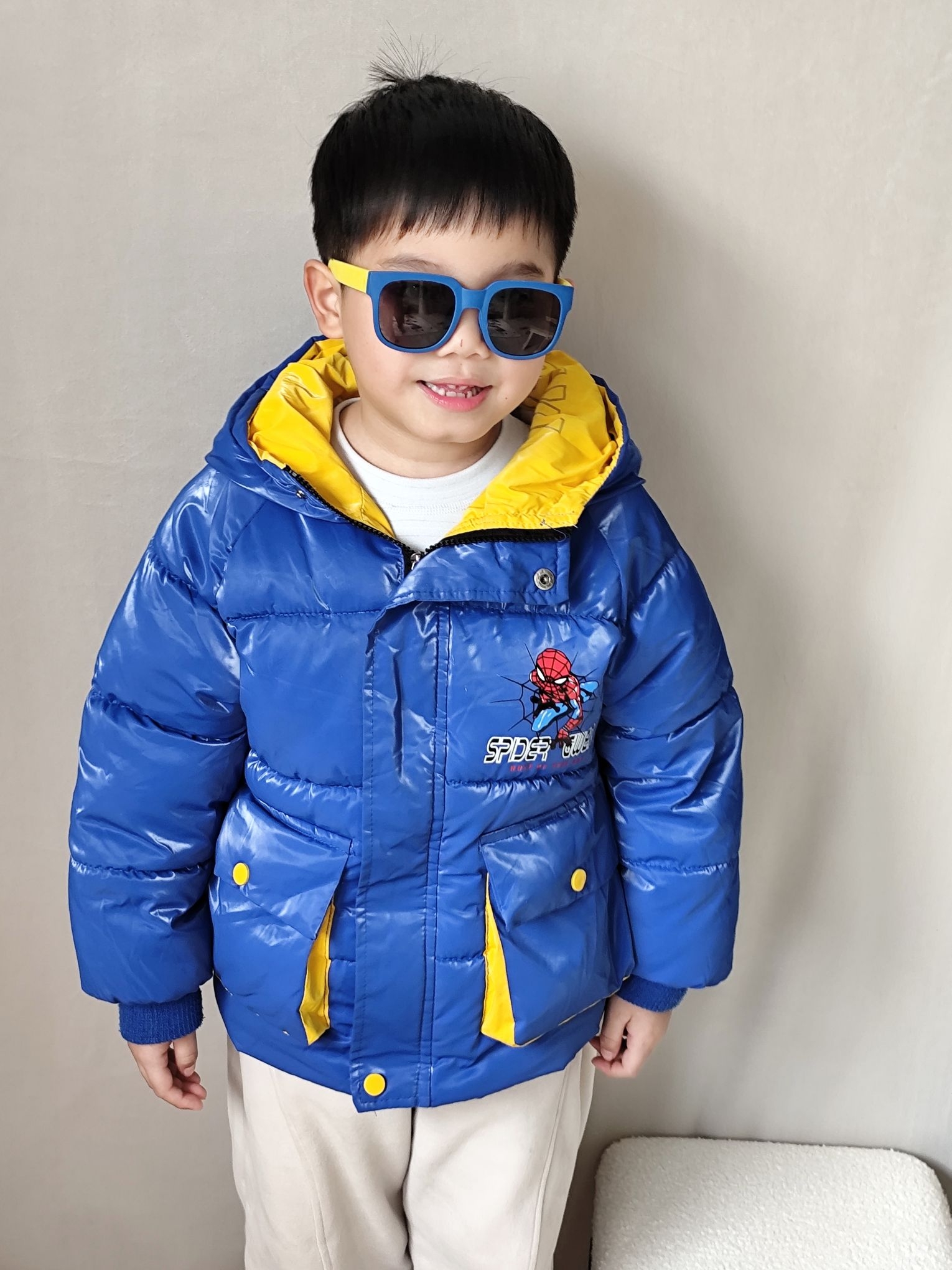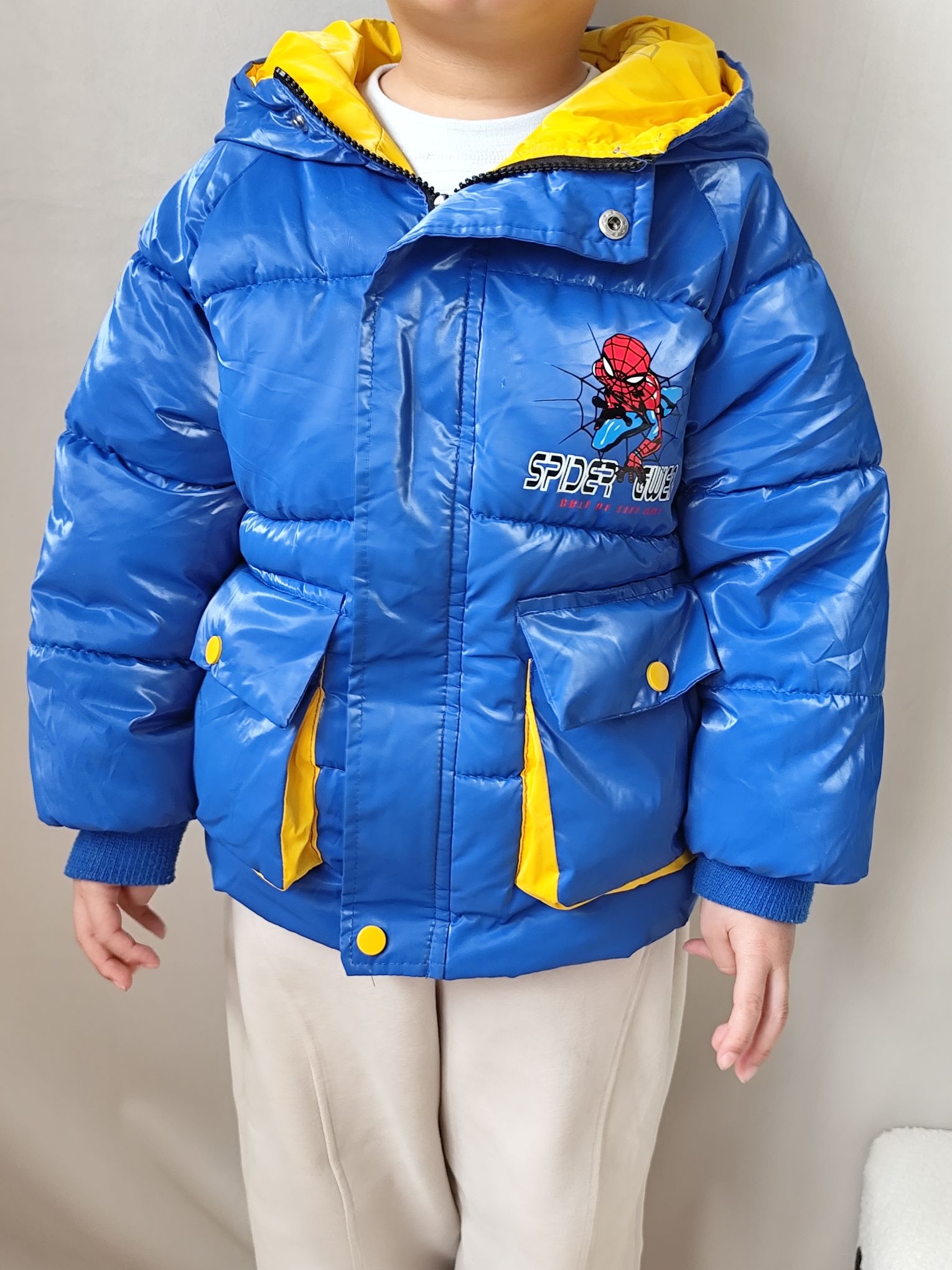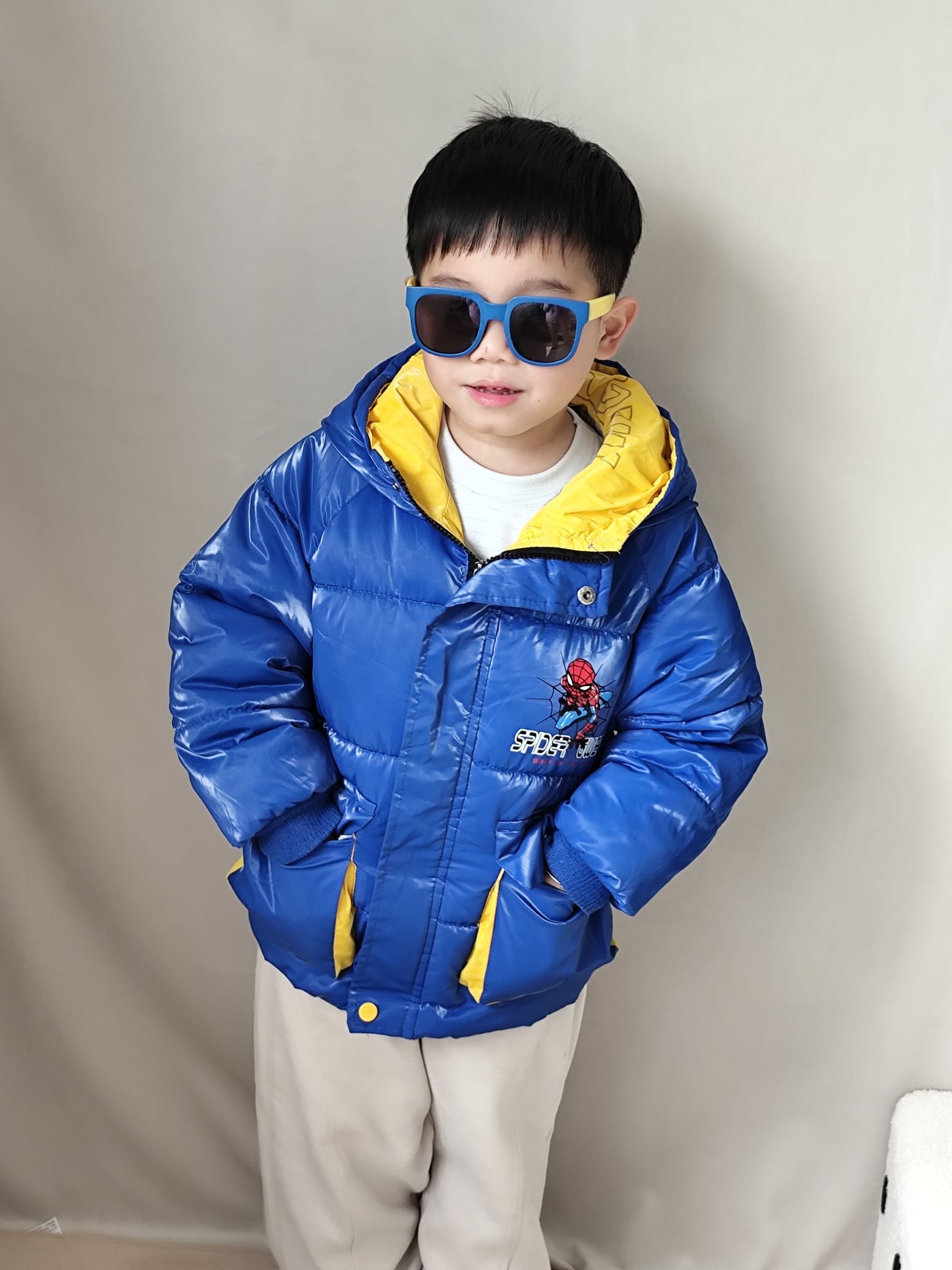 这两天南方真的是巨冷,冻的人瑟瑟发抖了,这两天给我家宸宝搭了一套超吸睛的冬日潮酷look👇 ✅ 羽绒服:这款亮面宝蓝色羽绒服真的太显白了,蜘蛛侠图案是他自己选的,穿上就不肯脱!亮面材质防水又耐脏,泼点奶茶、沾点灰一擦就干净,对调皮男孩太友好了。领口的黄色撞色设计特别出彩,让整体穿搭一下子活泼起来,保暖性也在线,零下5度出门完全不喊冷。 ✅ 裤子:米色加绒卫裤,裤脚是收口设计,防风又显腿型。面料软糯...