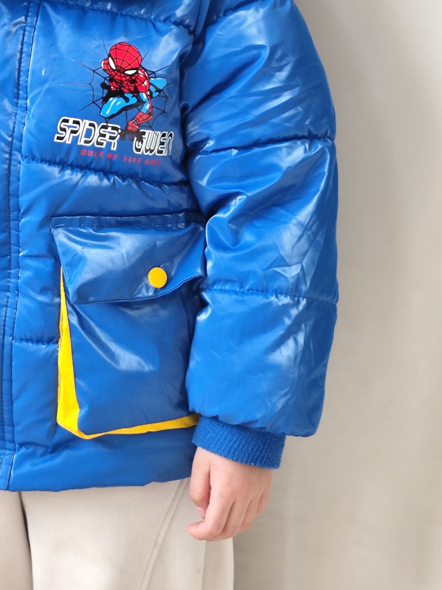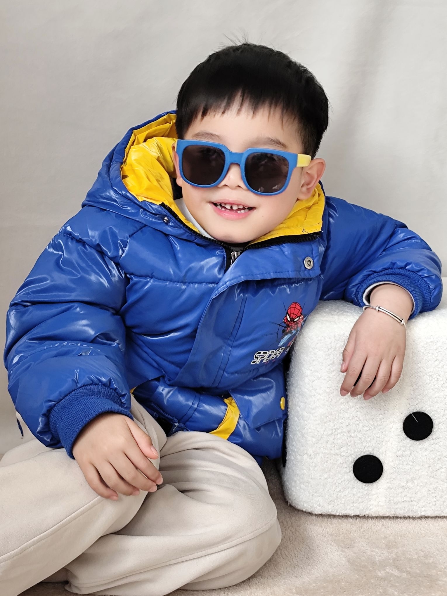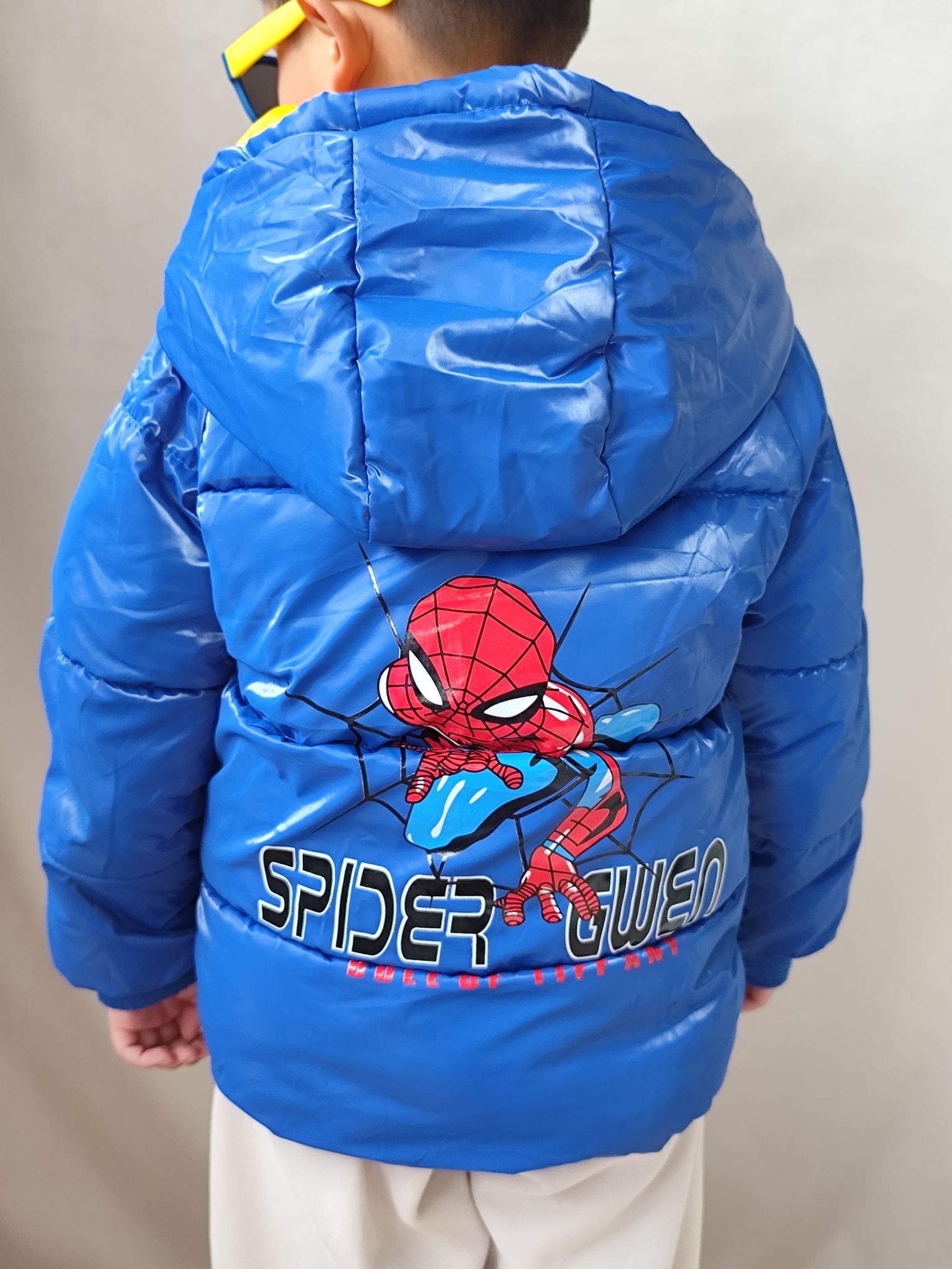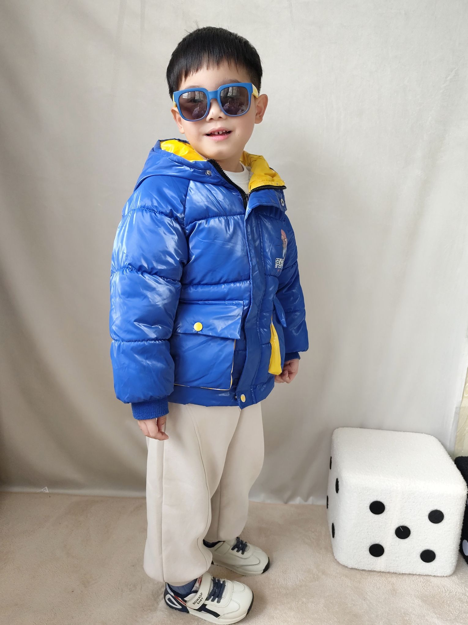 这两天南方真的是巨冷,冻的人瑟瑟发抖了,这两天给我家宸宝搭了一套超吸睛的冬日潮酷look👇 ✅ 羽绒服:这款亮面宝蓝色羽绒服真的太显白了,蜘蛛侠图案是他自己选的,穿上就不肯脱!亮面材质防水又耐脏,泼点奶茶、沾点灰一擦就干净,对调皮男孩太友好了。领口的黄色撞色设计特别出彩,让整体穿搭一下子活泼起来,保暖性也在线,零下5度出门完全不喊冷。 ✅ 裤子:米色加绒卫裤,裤脚是收口设计,防风又显腿型。面料软糯...