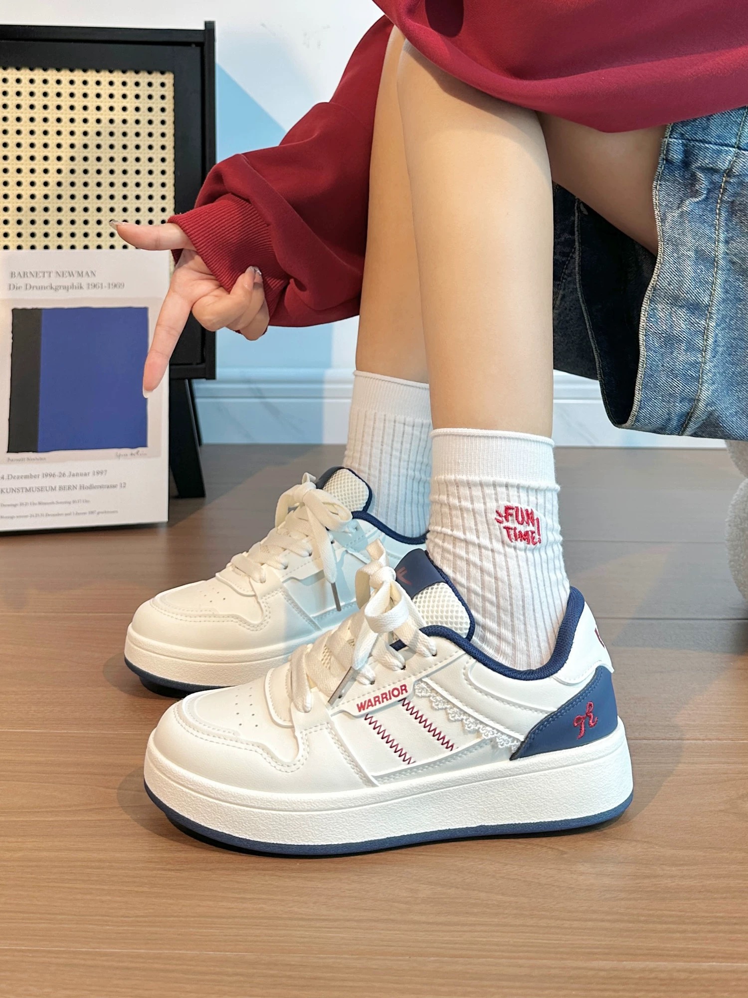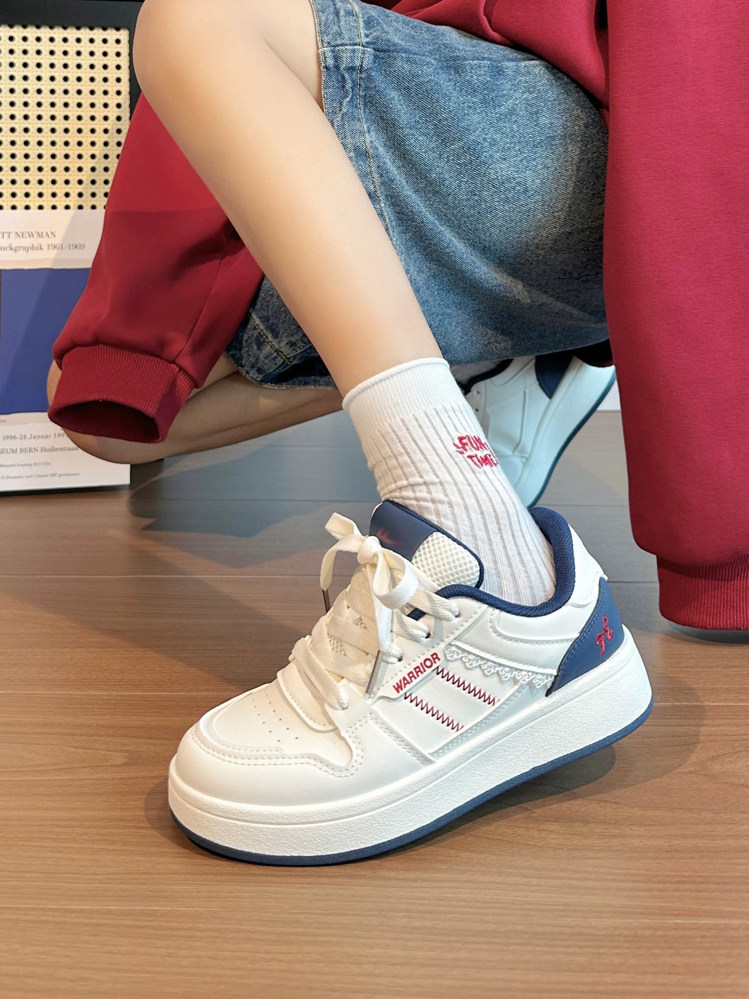一开始是冲着蓝白配色入的,拿到手比图片上看着更柔和一点✨ 上脚第一感觉是轻,鞋底有一点点厚度,但不是硬邦邦的那种,日常走路、逛半天街都不会累。 要说“缺点”,就是鞋头有点圆,脚特别瘦的人穿可能会有点空,但对我这种脚宽的人来说反而更包容,不会挤脚。 鞋身的缝线设计看着很特别,不会像普通小白鞋那么单调,配牛仔裤、运动裤都很搭。 唯一的小不足是白色部分有点容易沾灰,不过用湿巾擦两下就干净了,也算能接...