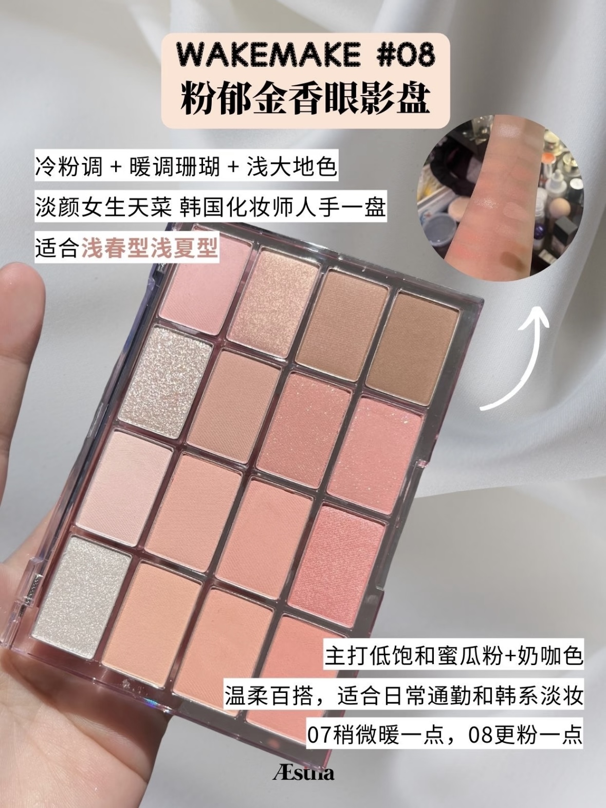 那一定是wakemake的08,淡颜真的很爱这种颜色的眼影盘,随便画也很好看,16种颜色没有一个踩雷的,可以当眼影,腮红,卧蚕提亮,高光,一盘画全脸,唯一不足的就是没有修容色,我特别喜欢用第二排第二个颜色当作卧蚕提亮色涂上超级明显的,卧蚕一整个就膨起来啦!!!