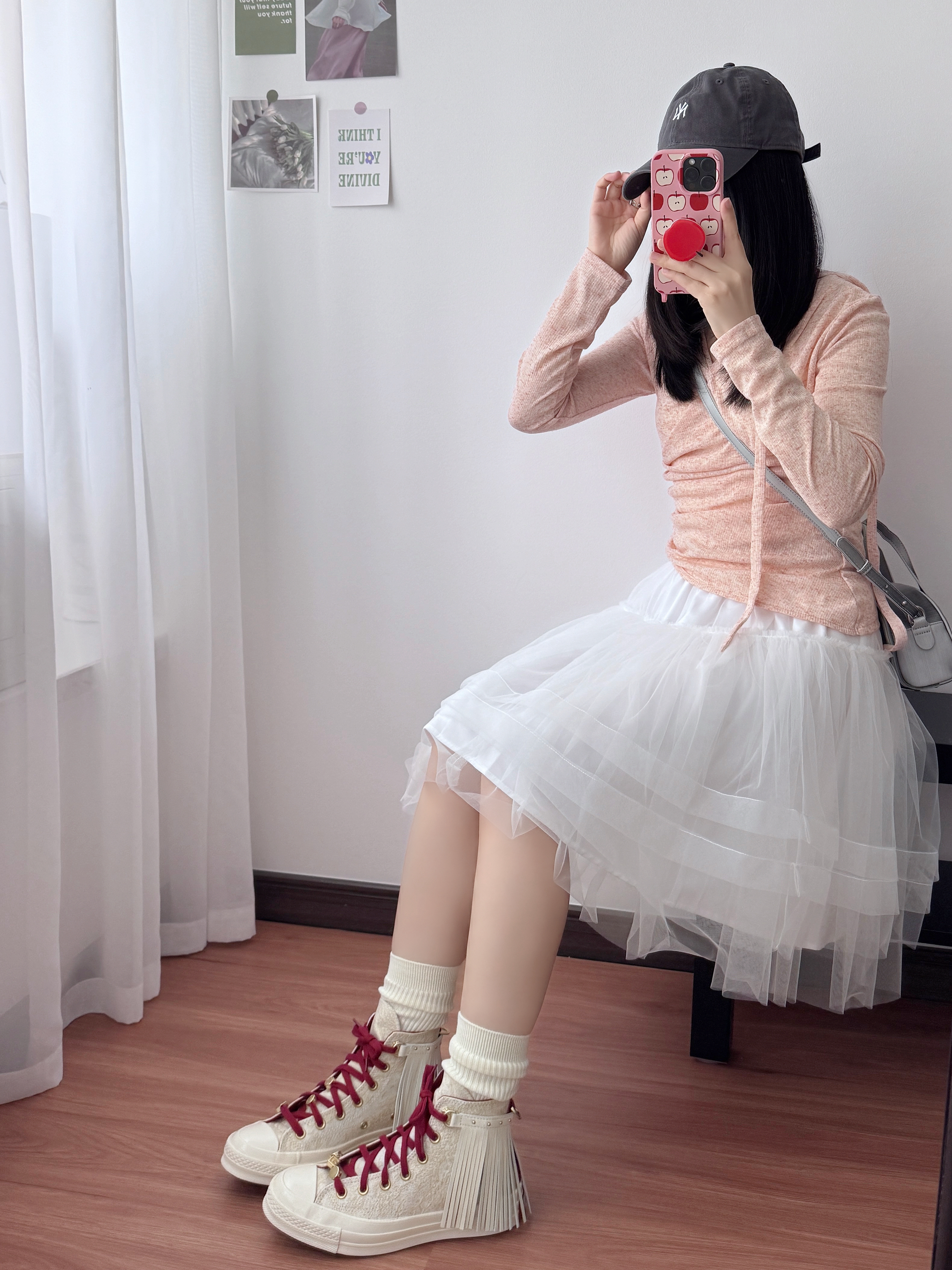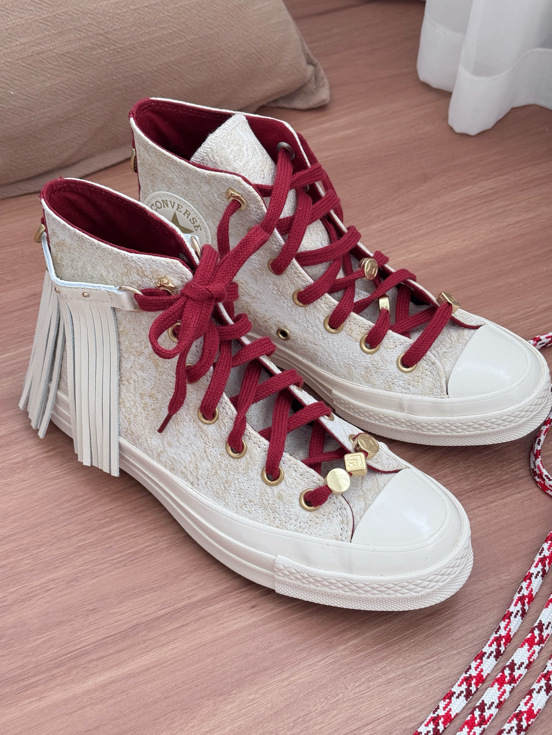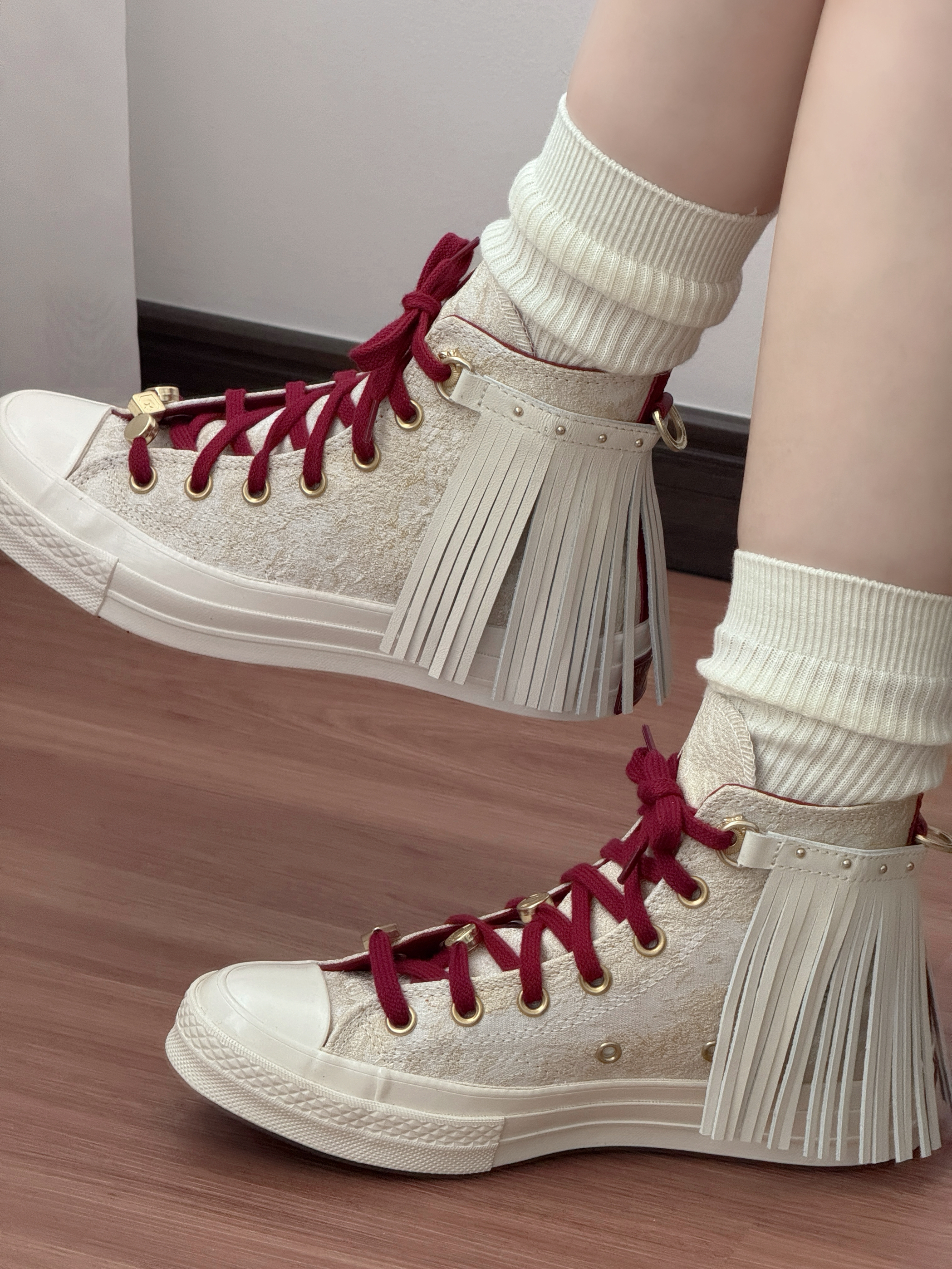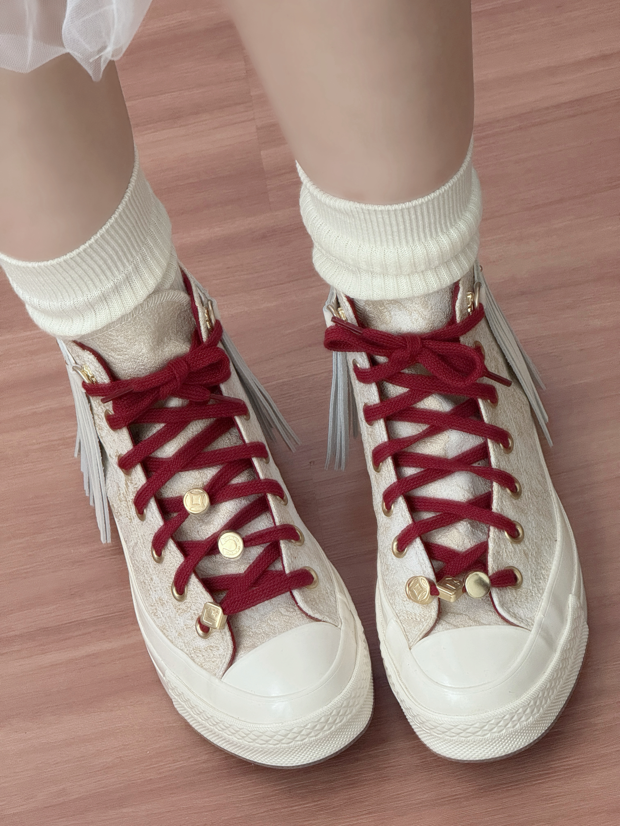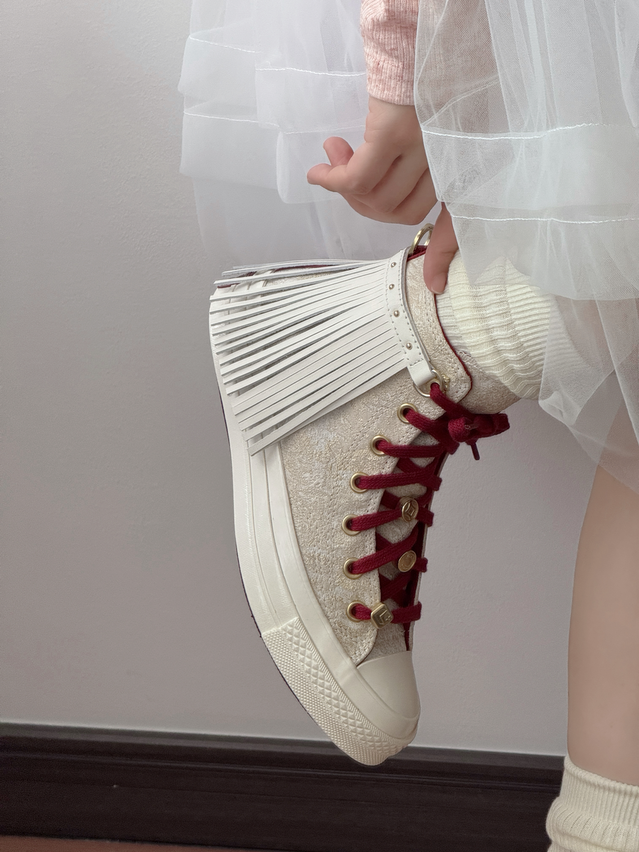 开春挖到的宝藏帆布鞋!👟 流苏+酒红鞋带的设计真的太戳我了! 本来以为这种甜酷风的鞋很难搭 结果配我的白纱裙居然意外和谐! 鞋底软软的很舒服,走一天都不累 甜妹开春就靠它撑场面了~ 日常配牛仔裤、短裙也都好看 百搭又吸睛,真的爱惨!