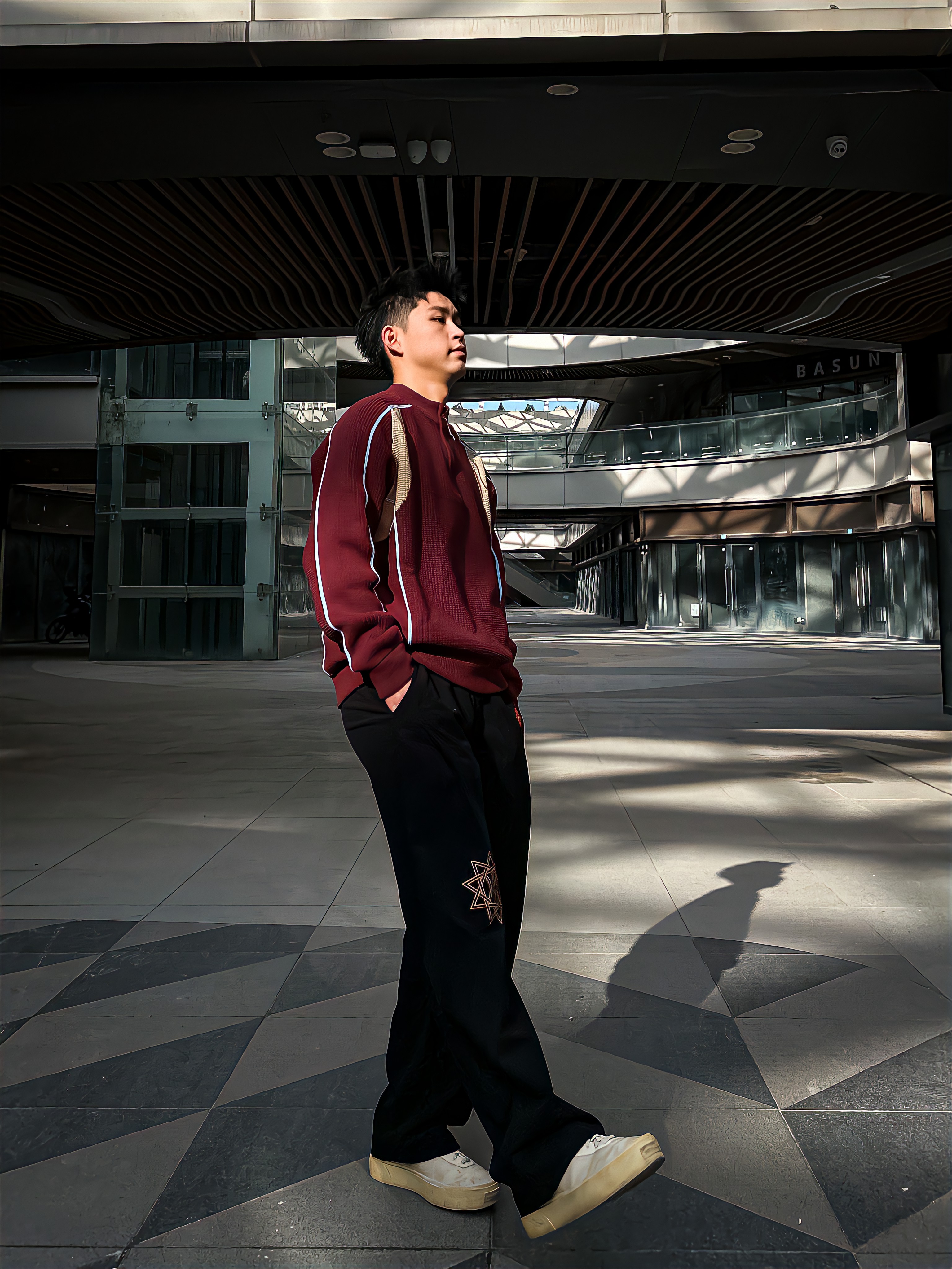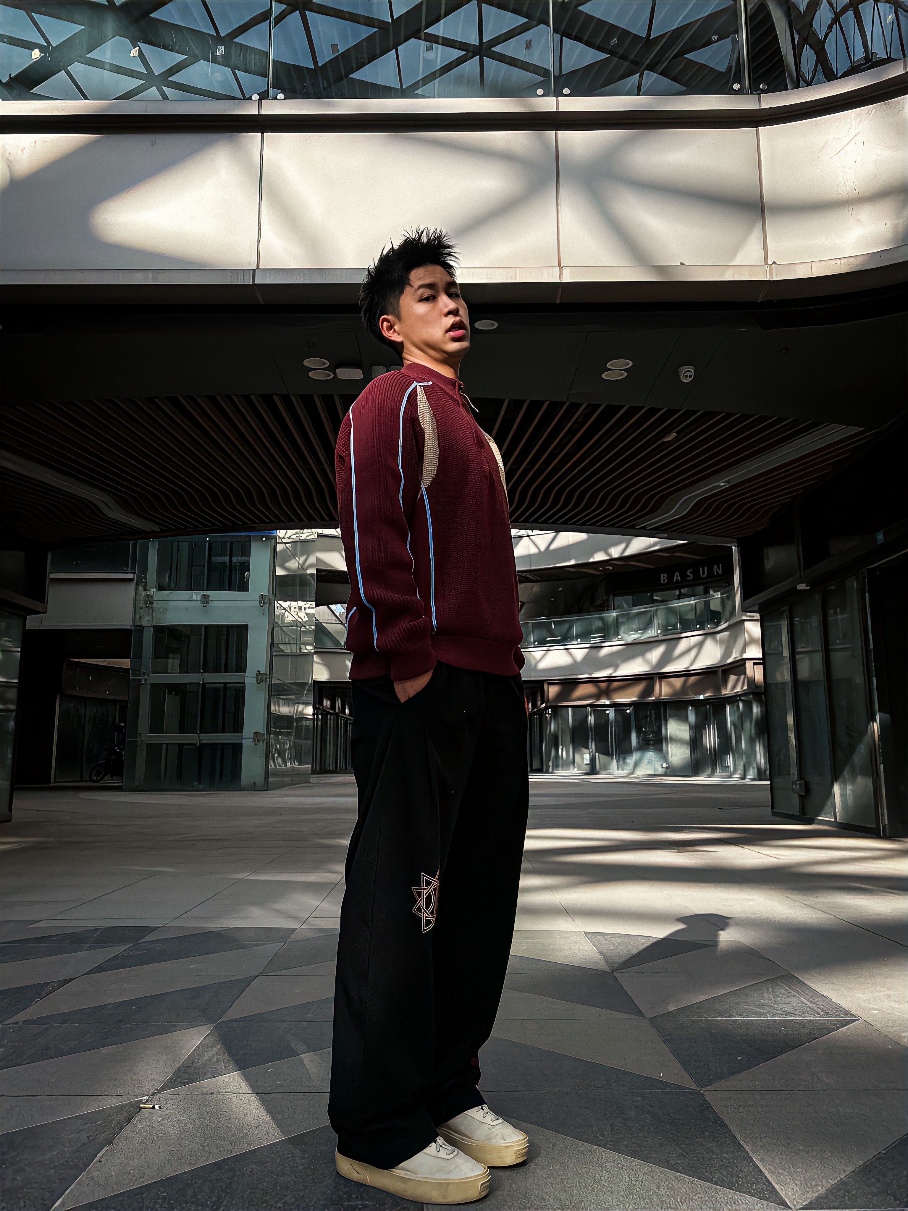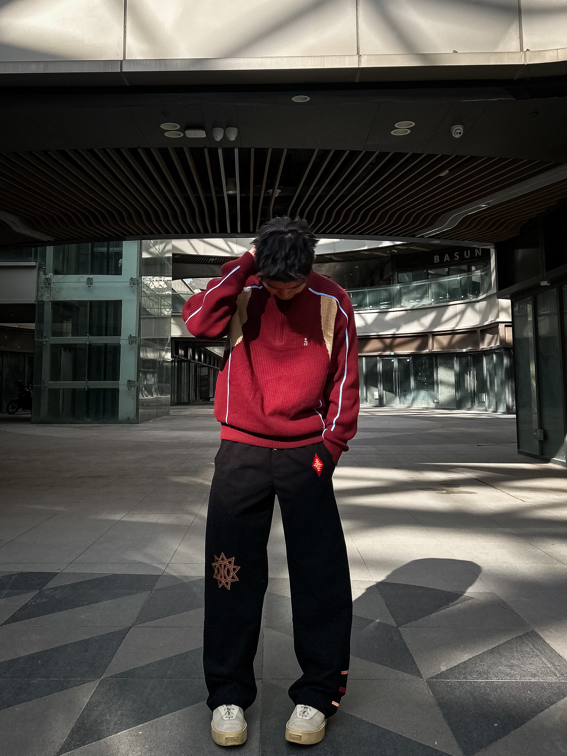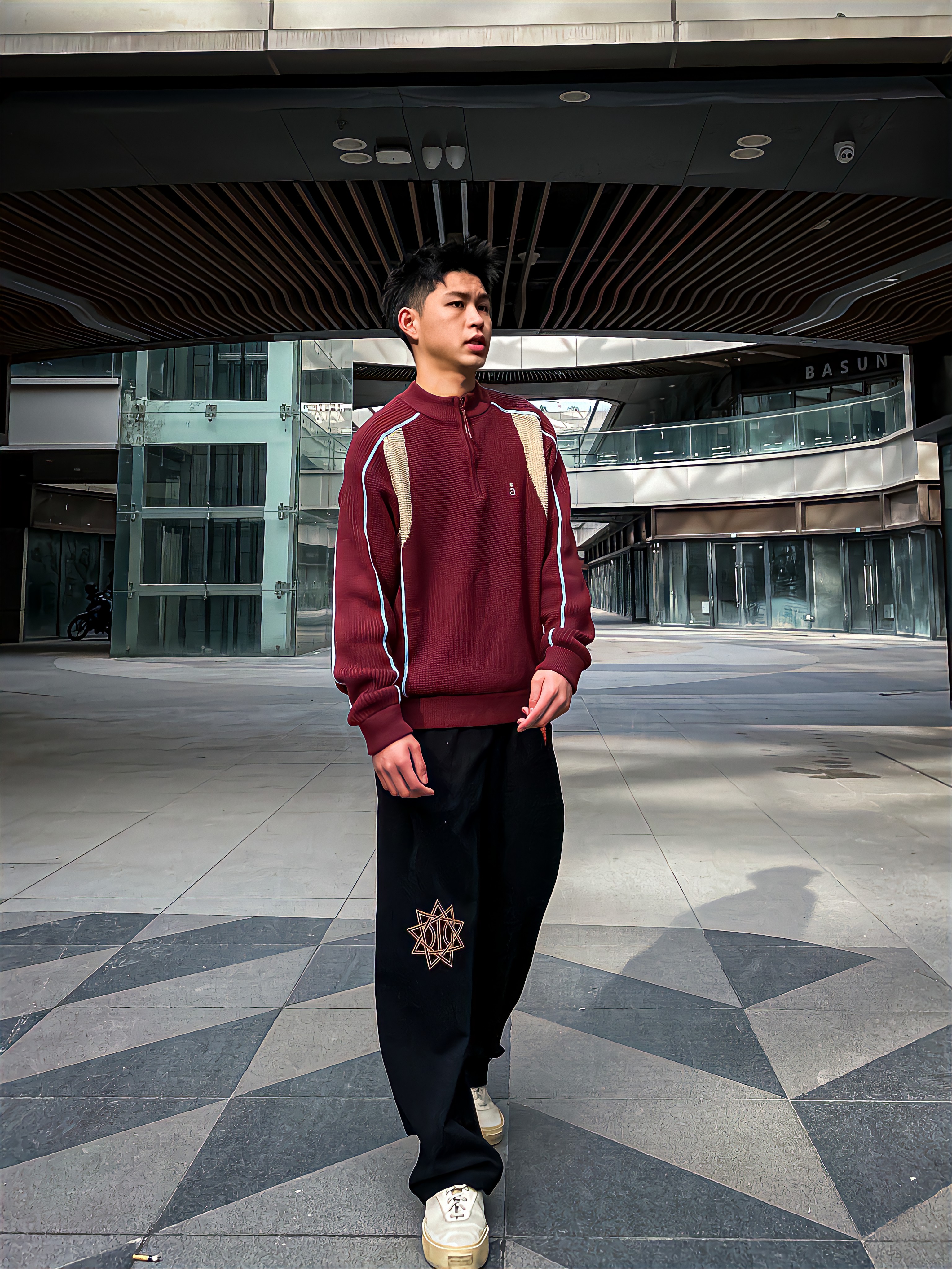 哈咯,这里是卢_SG 冬日复古撞色休闲风穿搭! 上身选了件酒红拼色半拉链针织衫 华夫格纹理+米白撞色拼接细节拉满 半开领设计既能修饰脖颈线条又自带复古腔调 宽松版型不挑身材,日常通勤或逛街单穿都超有质感 下身搭了条黑色刺绣阔腿休闲裤 侧边星纹刺绣+垂坠面料,简约中透着设计感 复古休闲感直接拉满!