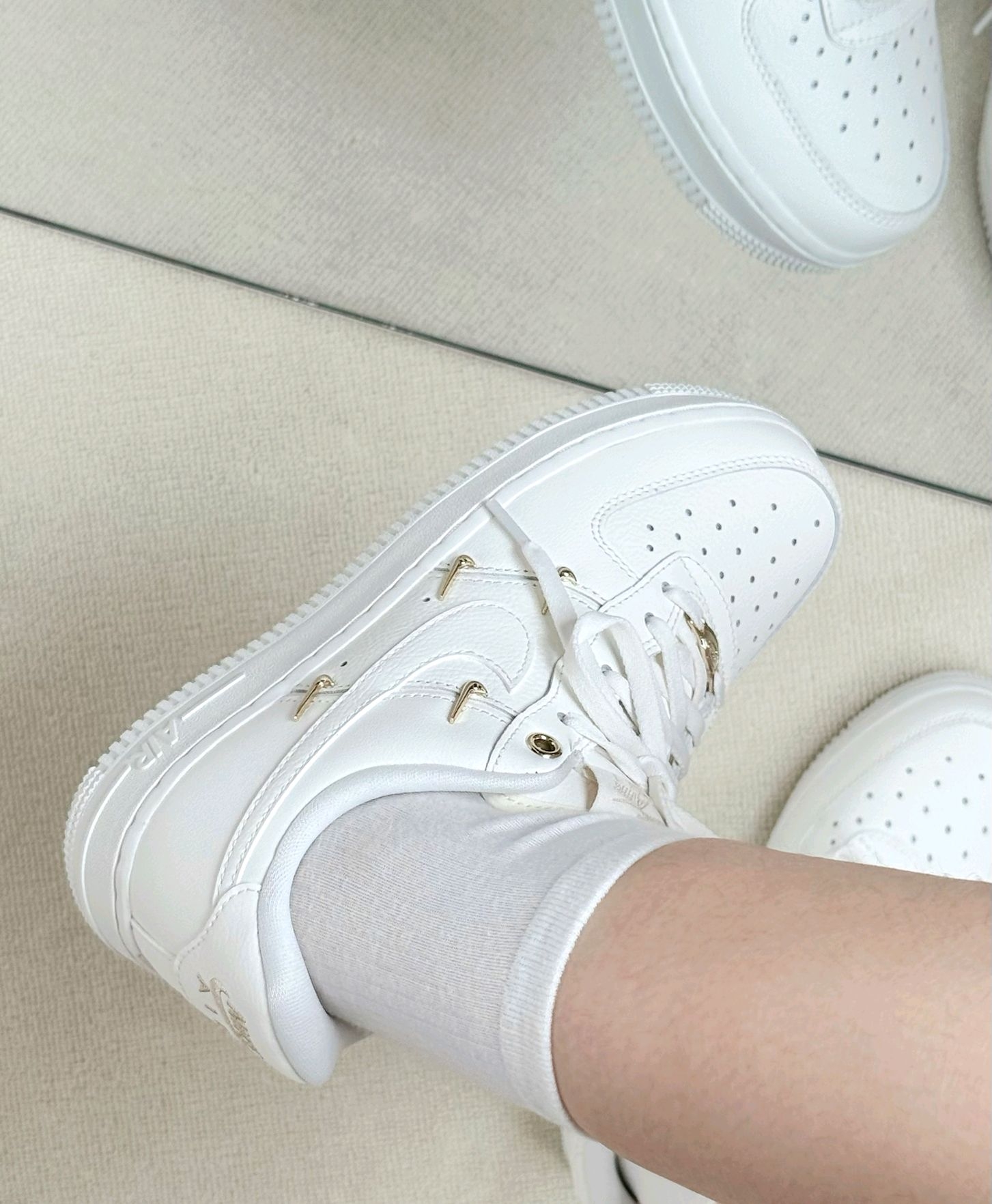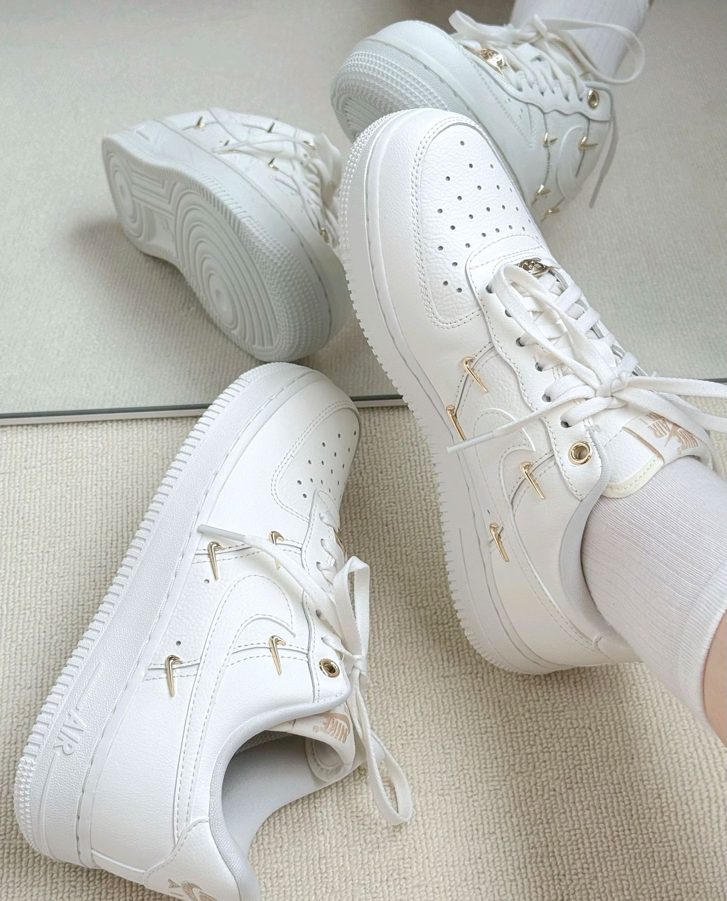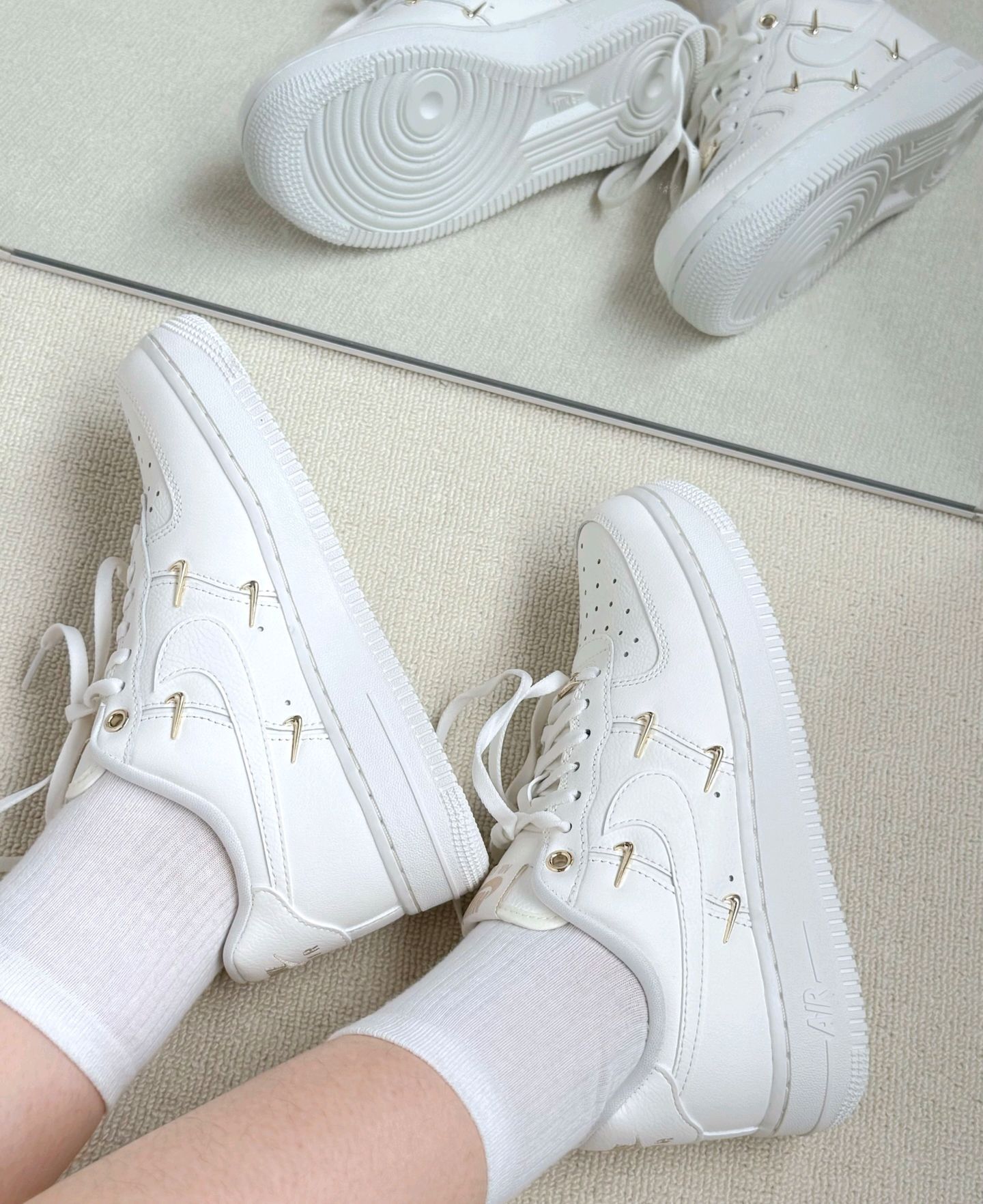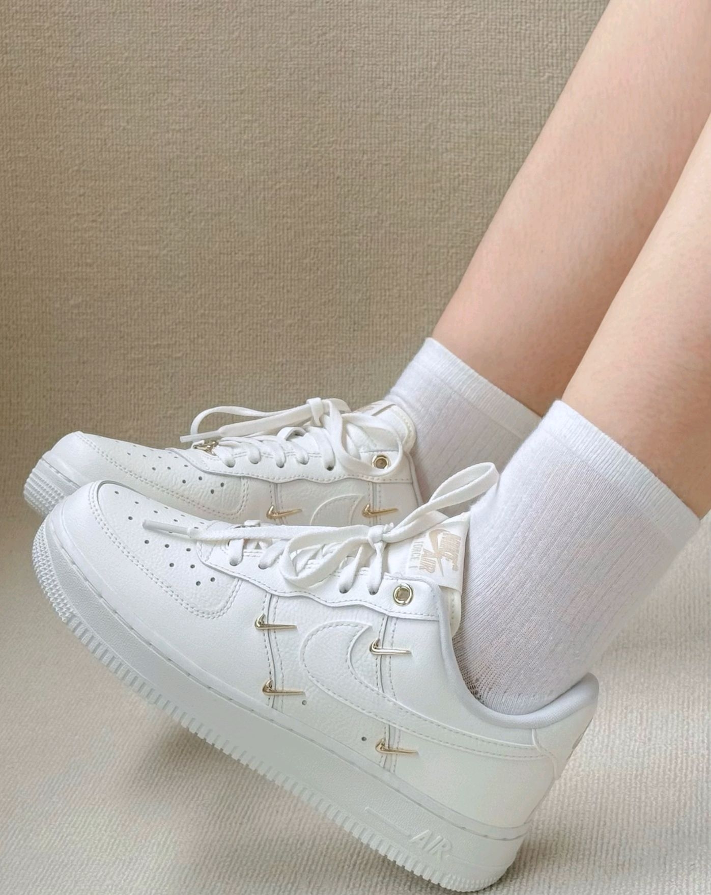 经典果然不过时 稍微点缀一下就让人挪不开眼 这双空军一号白金配色 在经典的鞋型上做了一些设计 鞋子的侧身点缀了立体小金钩 鞋子一下就变得亮眼了起来🥳 这也是我对这双鞋一见钟情的原因 鞋子穿上还是很舒服的 首先空军的脚感我还是很满意的 Air得中底气垫柔软舒适 回弹效果也不错 逛街走多了脚也不会很累 另外鞋身的高级皮革搭配小金钩让这双鞋的质感直接拉满 显得很与众不同👏 简约的配色让它任何的oot...