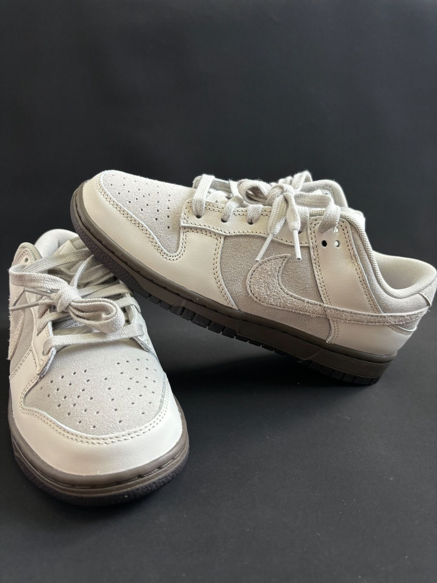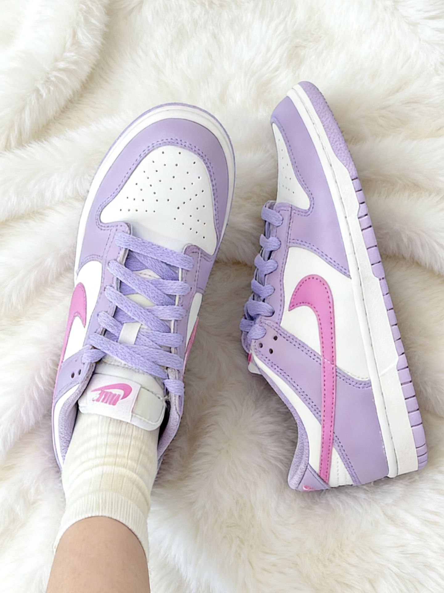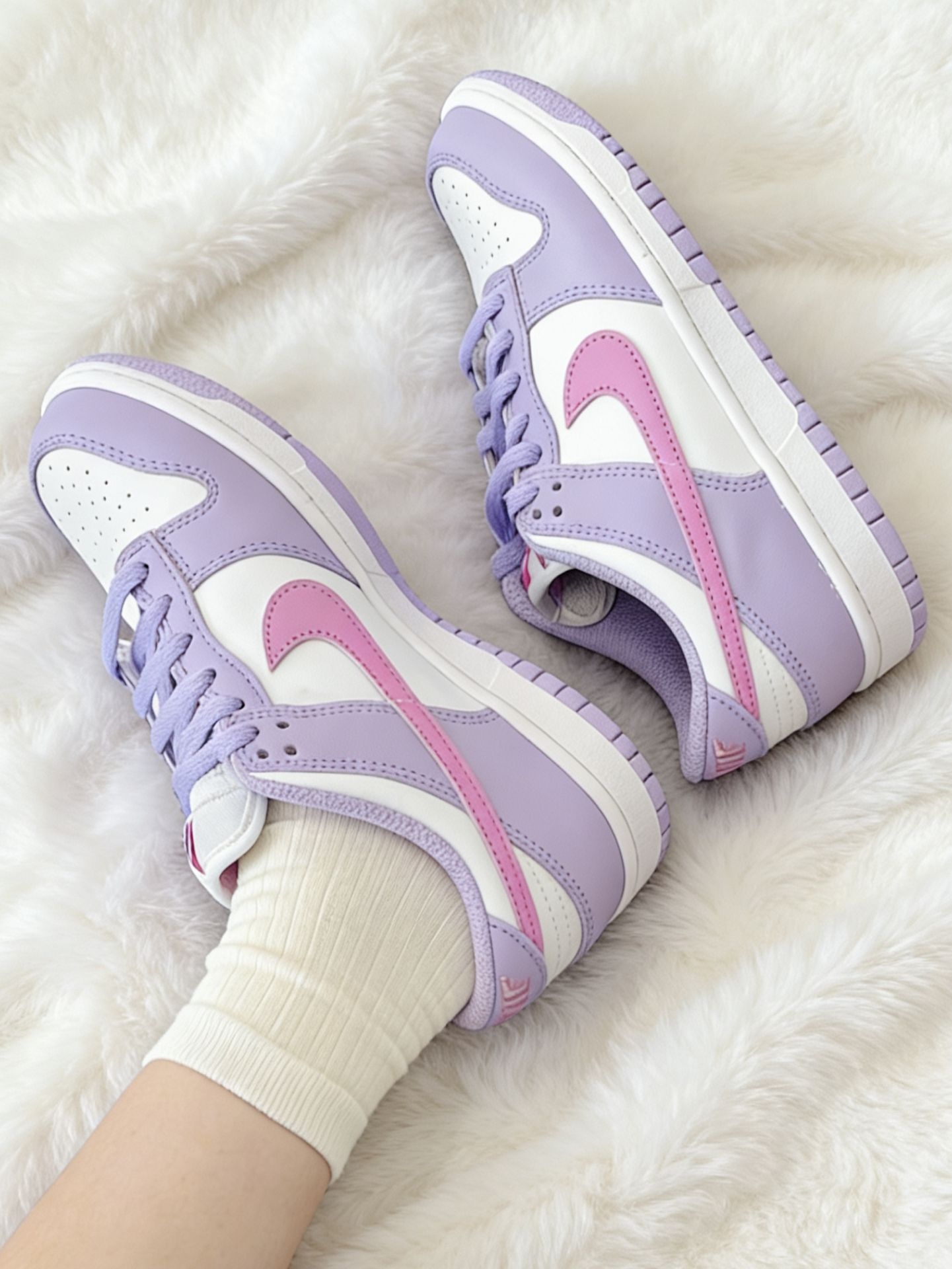 这双紫粉配色的Nike Dunk Low真的太戳我了!鞋身以淡紫色为主,搭配白色和粉色,颜色搭配得特别舒服,不挑人。鞋型是经典的Dunk Low,低帮设计,上脚很显腿细。鞋面是皮革材质,质感不错,也容易打理。鞋舌和鞋帮处有透气孔,不会闷脚,搭配白色袜子或者牛仔裤都很好看,日常出街非常合适。整体设计简约又不失细节,喜欢这种清新风格的朋友 definitely值得入手!