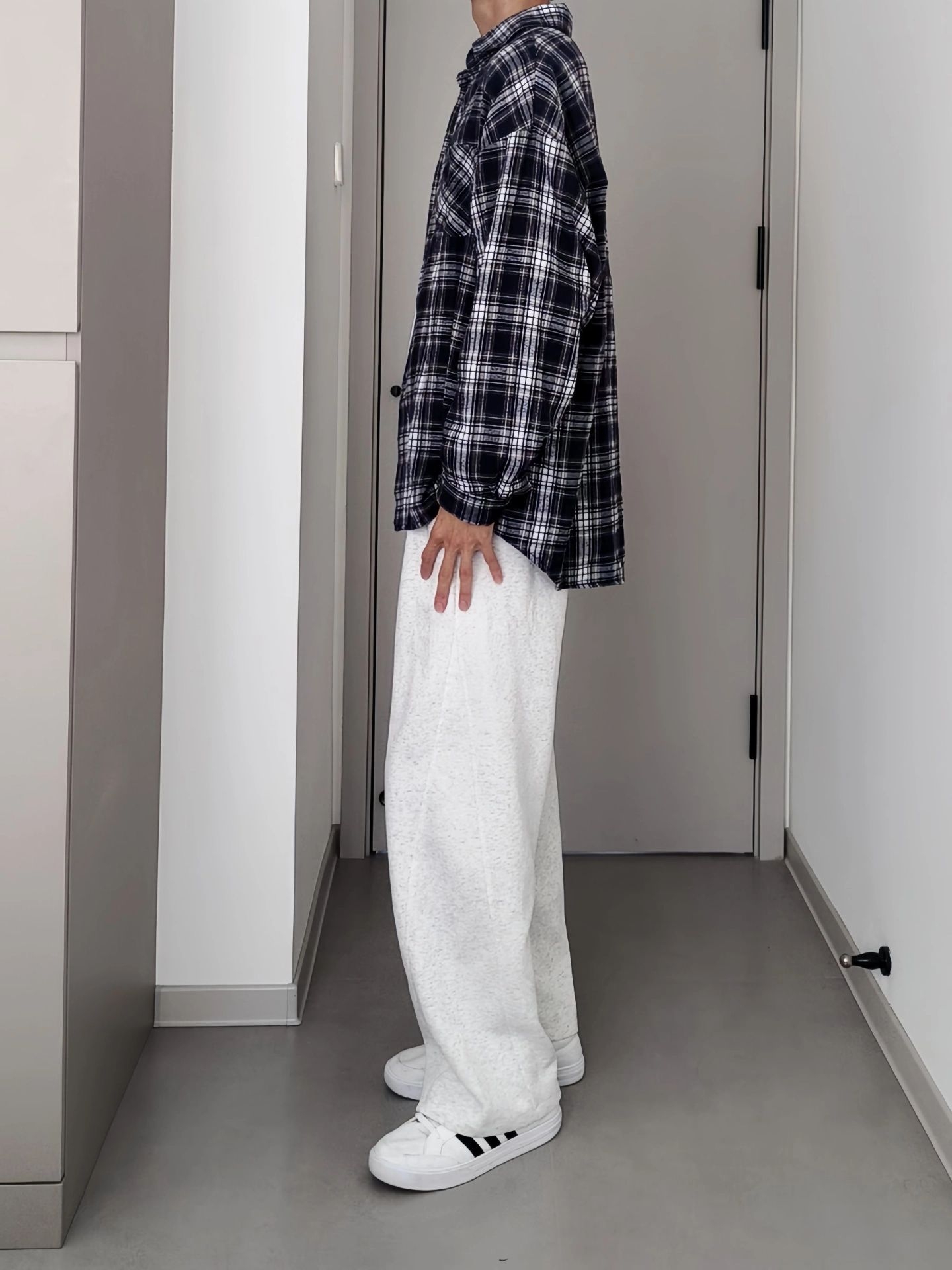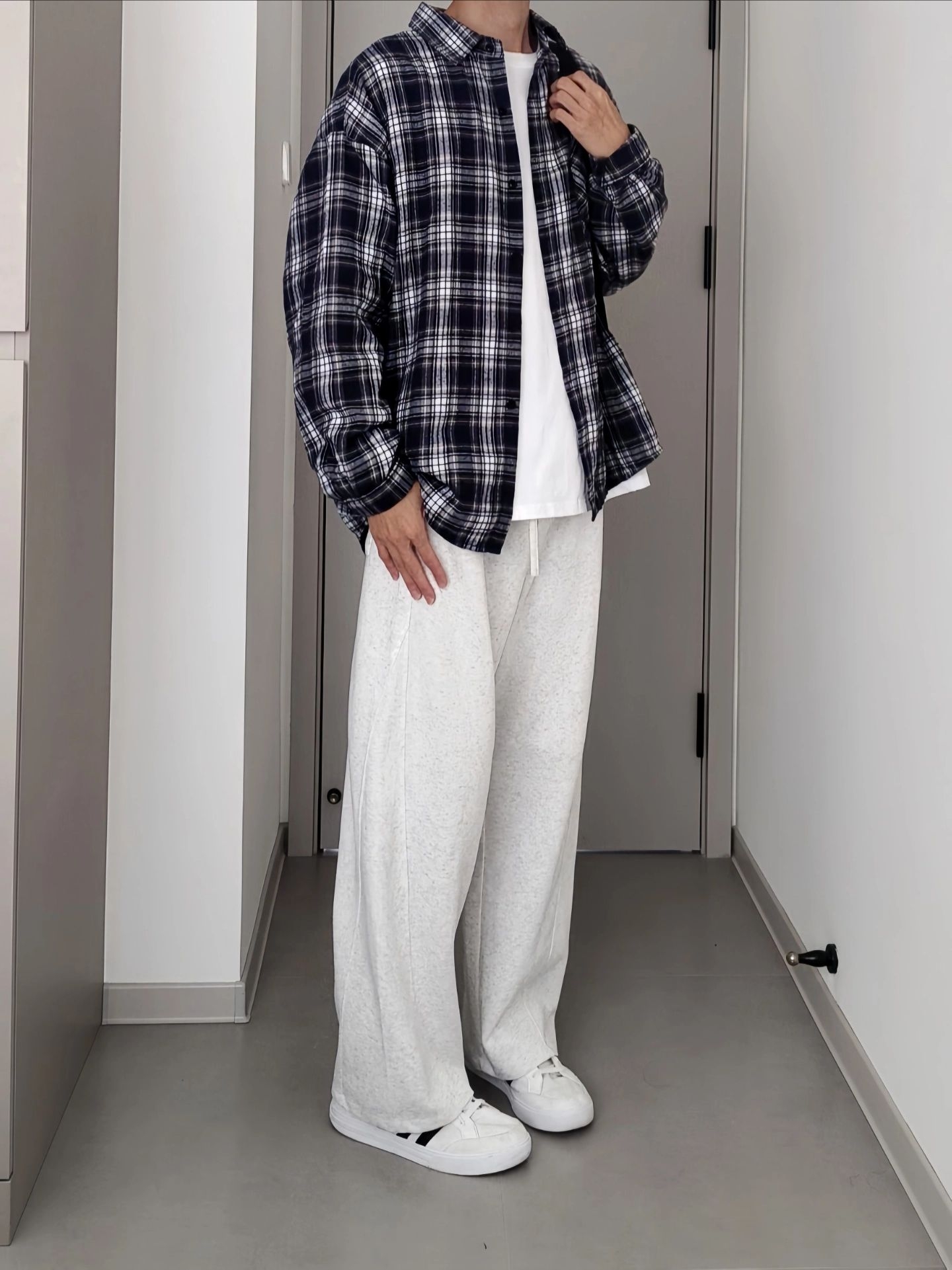 冬天裹得里一层外一层,搭配多了怕乱七八糟,搭配少了,怕没有特点,真的很麻烦! 直到找到了这套内搭公式,无论外套是什么风格,都不用担心内搭太普通,单穿也超级帅! 外搭:是一件Oversize藏青格纹衬衫,磨毛肌理面料+宽松落肩设计,横向撑开肩线,视觉增肌显壮 内搭:白色基础T恤,圆领微宽松版型,露边穿增加层次感,不软塌不贴身 裤子:浅灰色阔腿卫裤,宽松版型显壮,微胖身材也能藏肉 鞋子:#a...