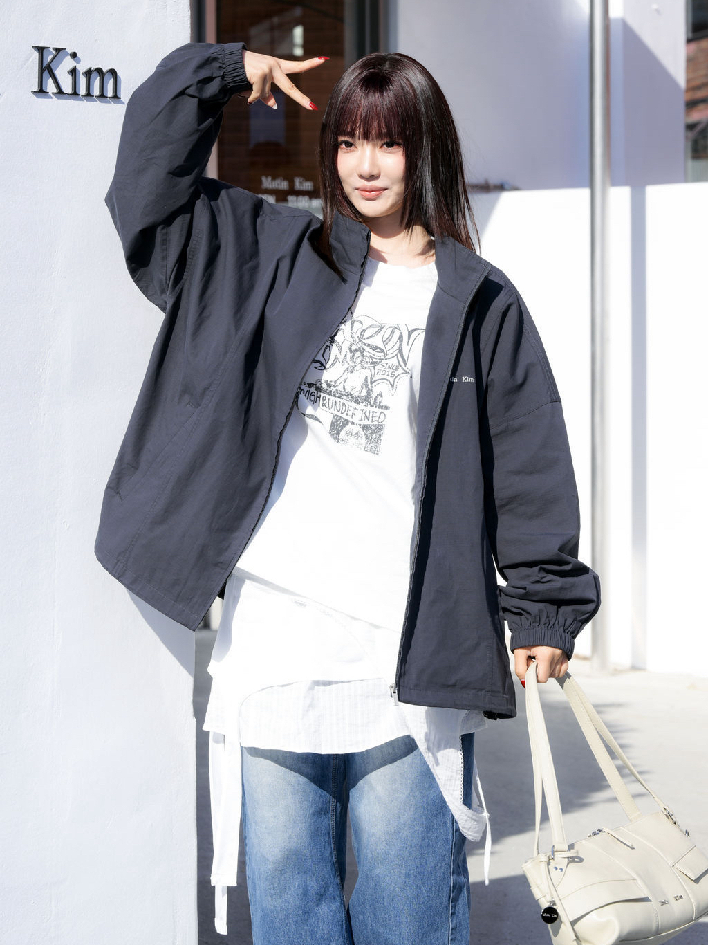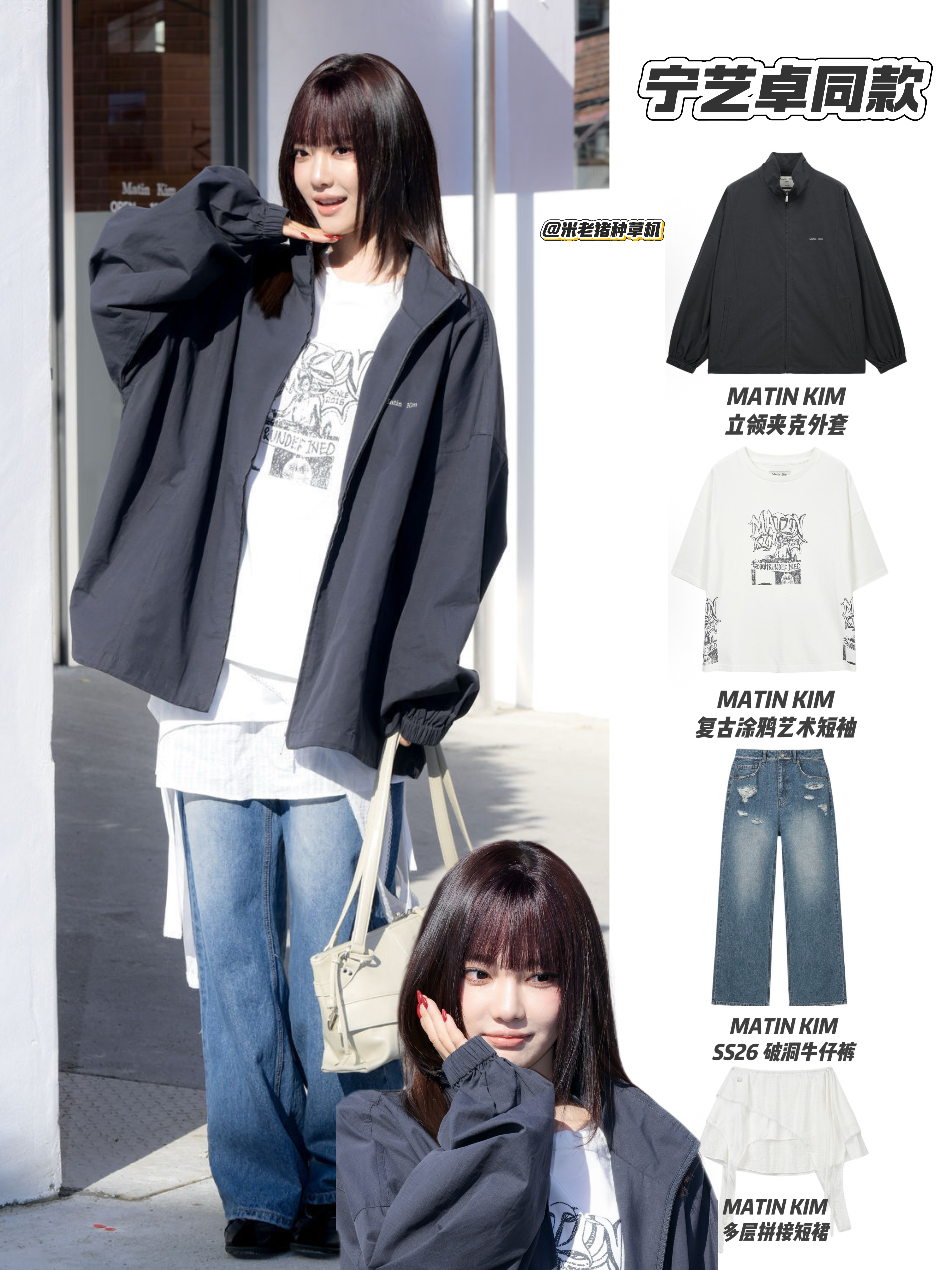 宁艺卓这套街头感穿搭太适合跟着明星抄作业了! MATIN KIM的立领夹克宽松随性,内搭涂鸦T恤和拼接裙,叠穿层次感直接拉满,下身一条破洞牛仔裤,松弛又时髦。整套都是明星同款,照着买准不出错,日常出街穿,轻松拿捏韩式爱豆范儿~