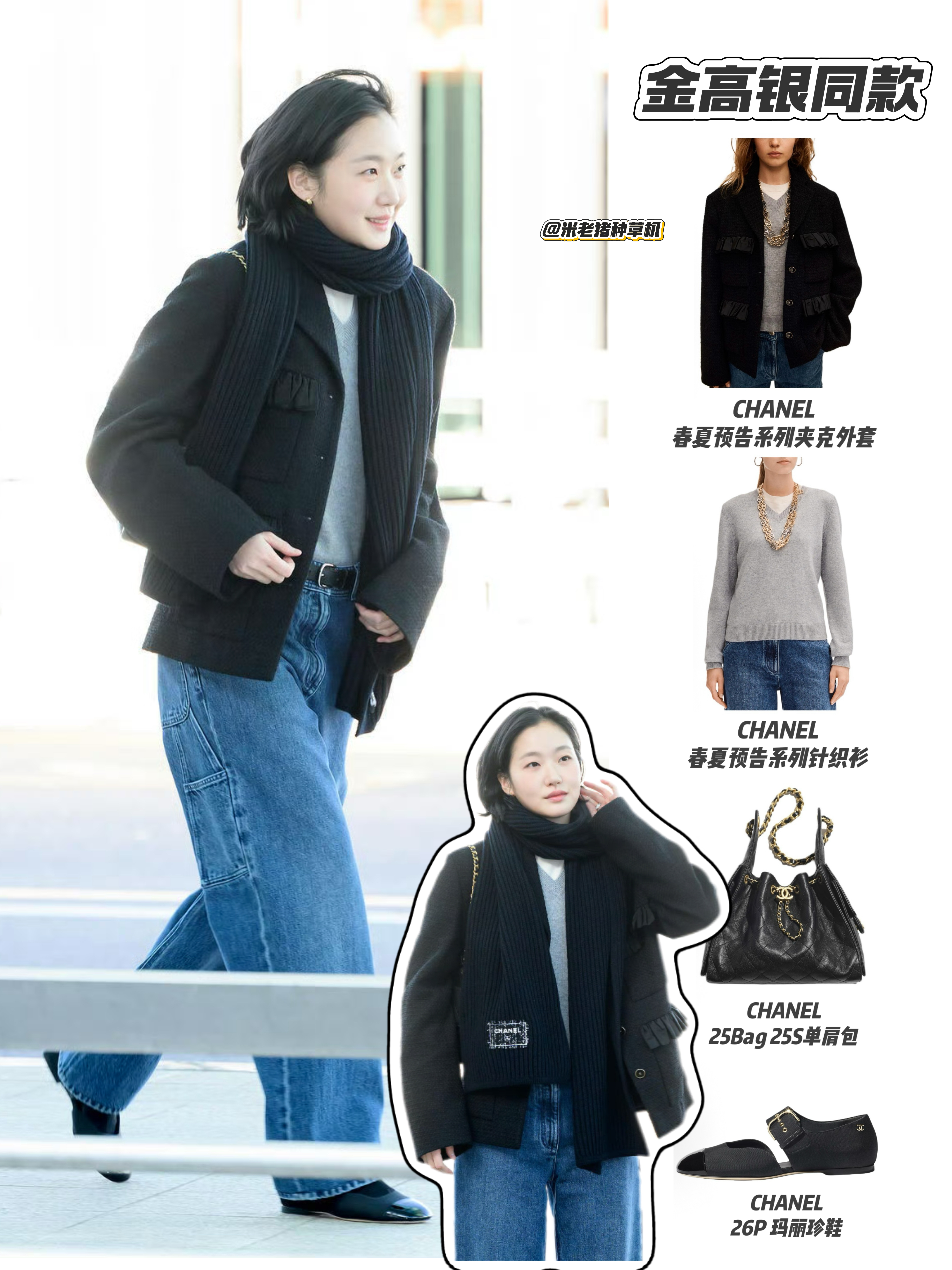 金高银这套冬日穿搭太有氛围感了!松弛感直接拉满✨ 香奈儿外套配同品牌针织衫,质感高级又保暖,一条同色系围巾温柔又挡风,下身搭宽松牛仔裤和玛丽珍鞋,随性中带着法式优雅。整套造型简约不简单,把冬日的慵懒和精致平衡得刚刚好,日常通勤穿也完全适配。