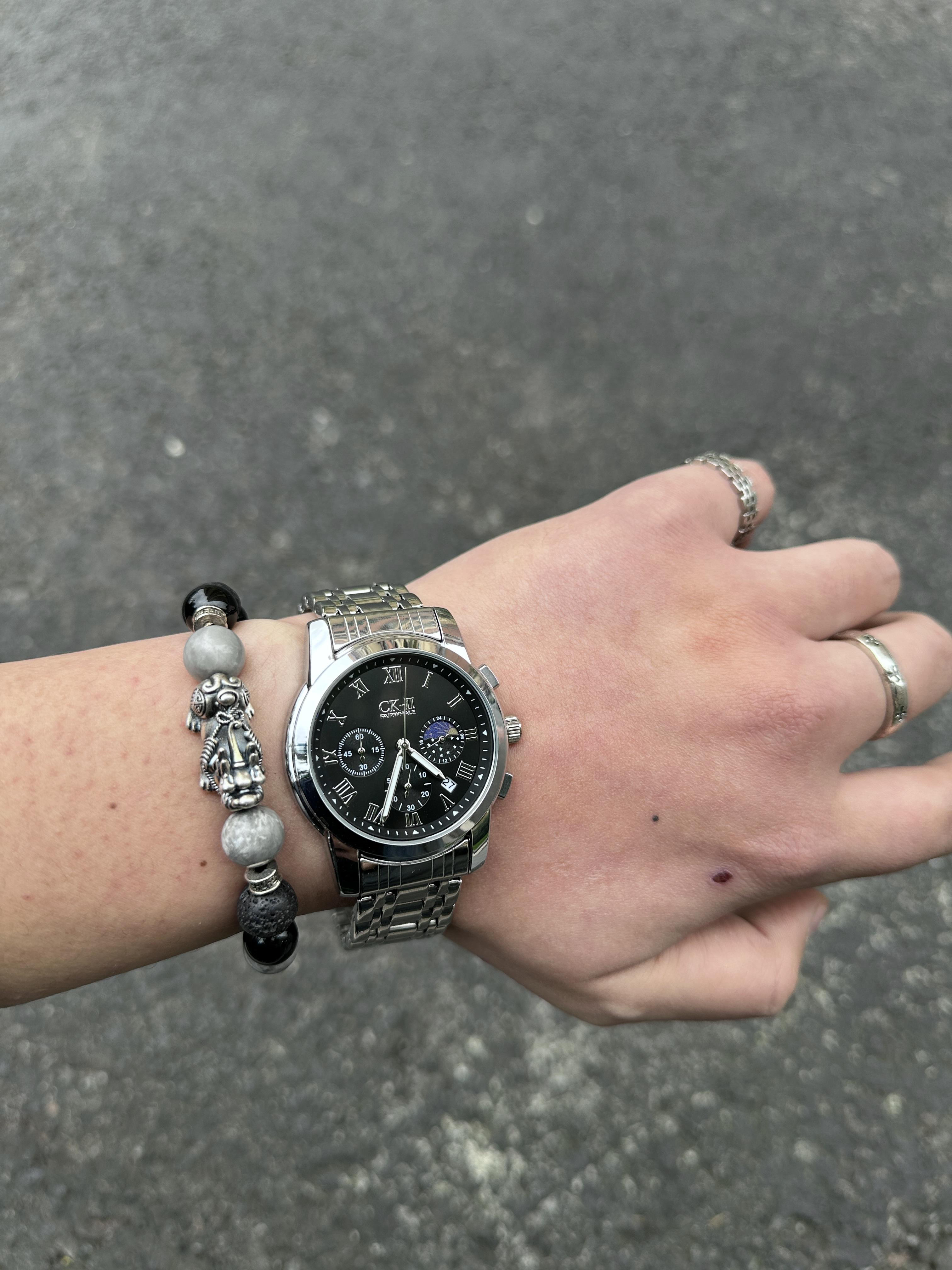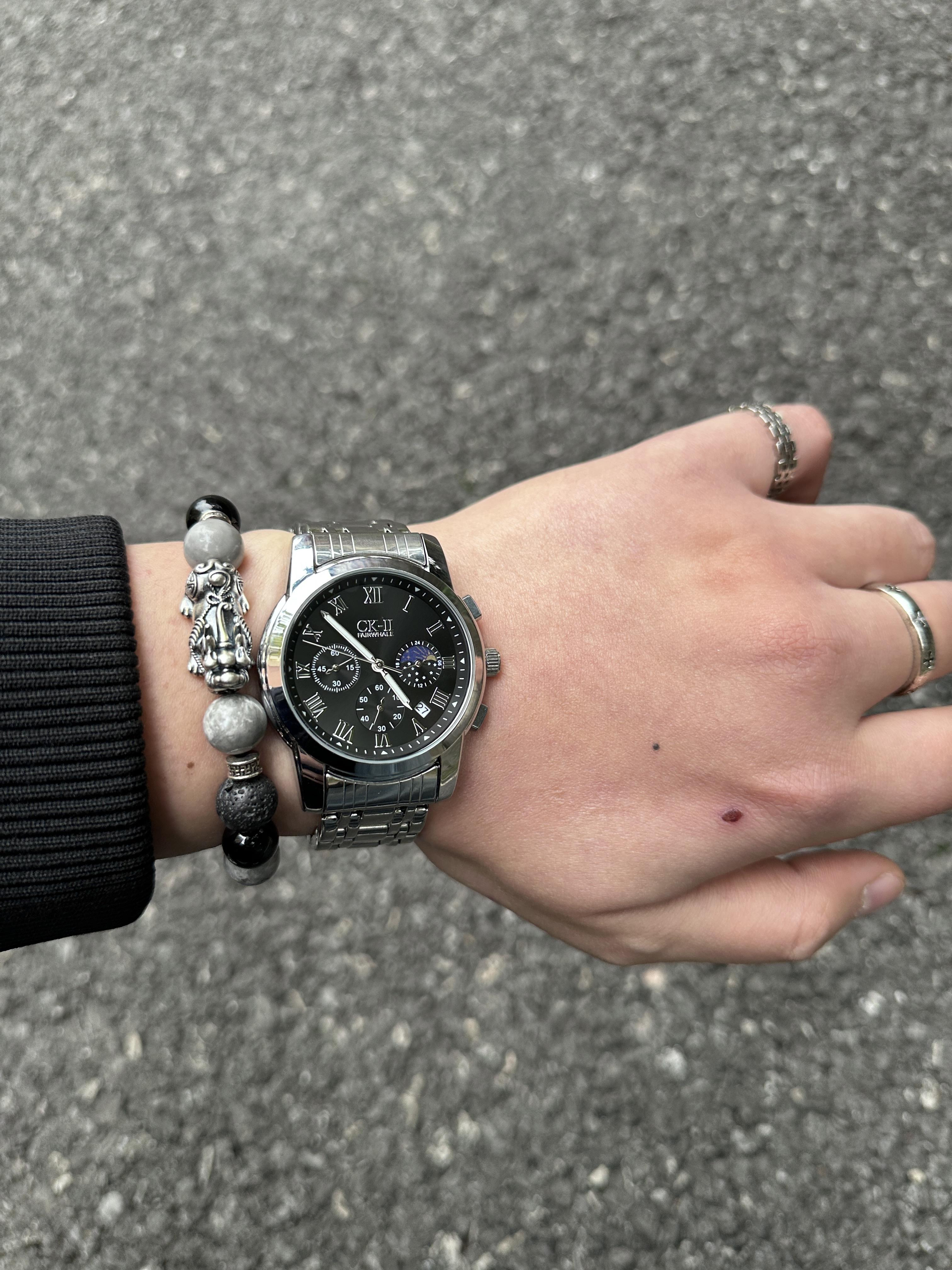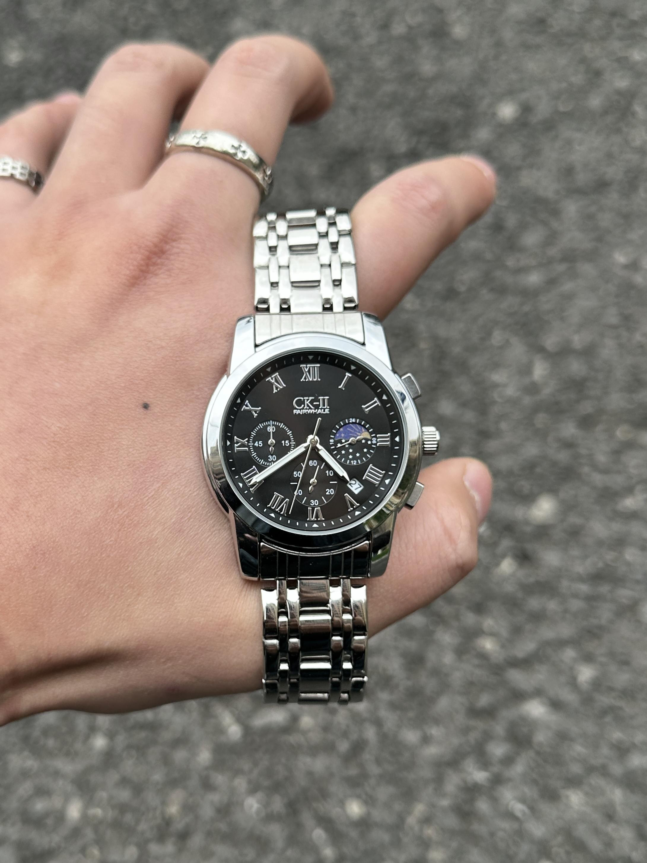 这款小ck和马克华菲联名的手表真的帅💥了❗️ 整表30米防水日常玩水都不怕,精钢表带横向四段设计舒适度和透气性增加,41的表盘大小刚刚好不会出现卡手的情况,我个人来说是非常喜欢这块表的功能性,保持表盘清晰的情况下设计了月相显示、计时功能、日历显示,石英机芯也能保证走时精准,而且上手商务感很强,无论是出门谈事、约会,亦或是外出旅游和通勤上班,包括学生党在内都是一表适配所有场景😌 综合来说这块表实用...