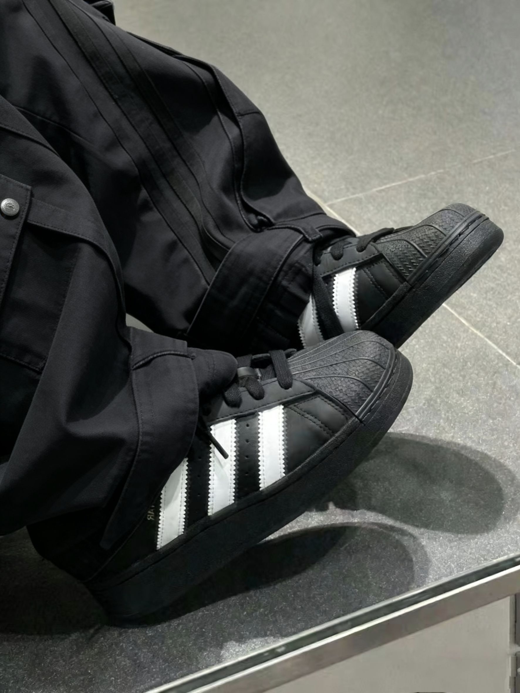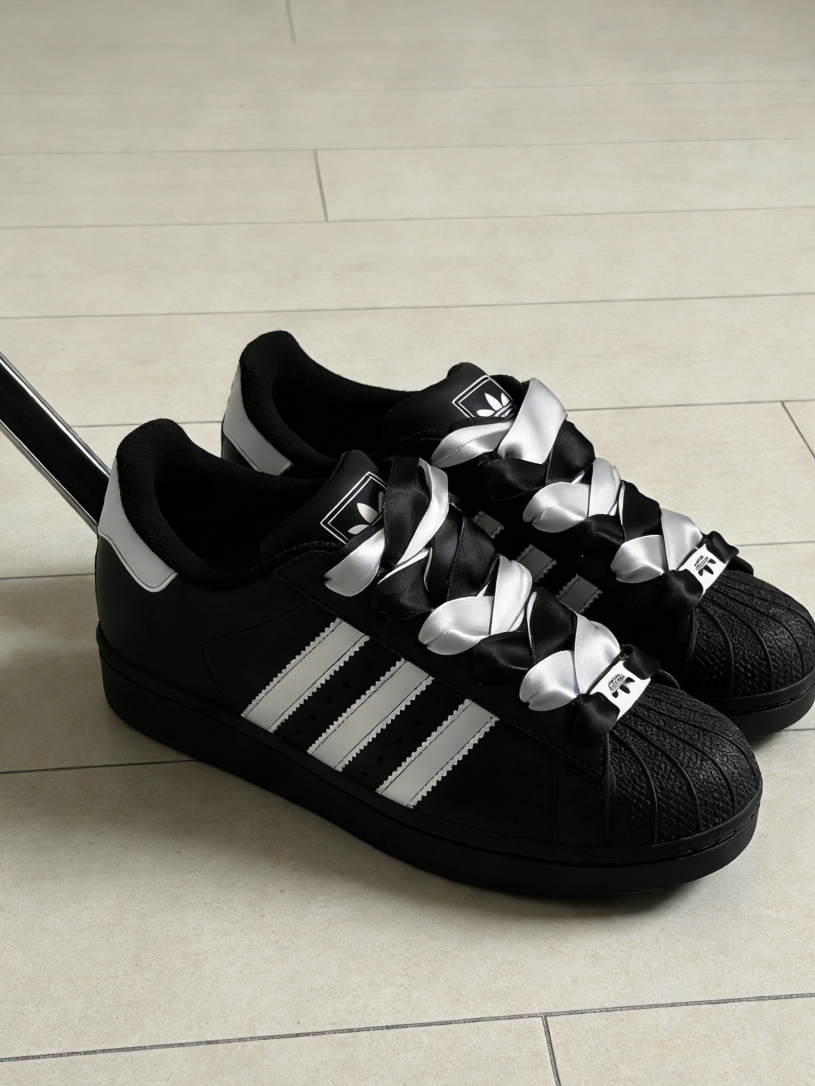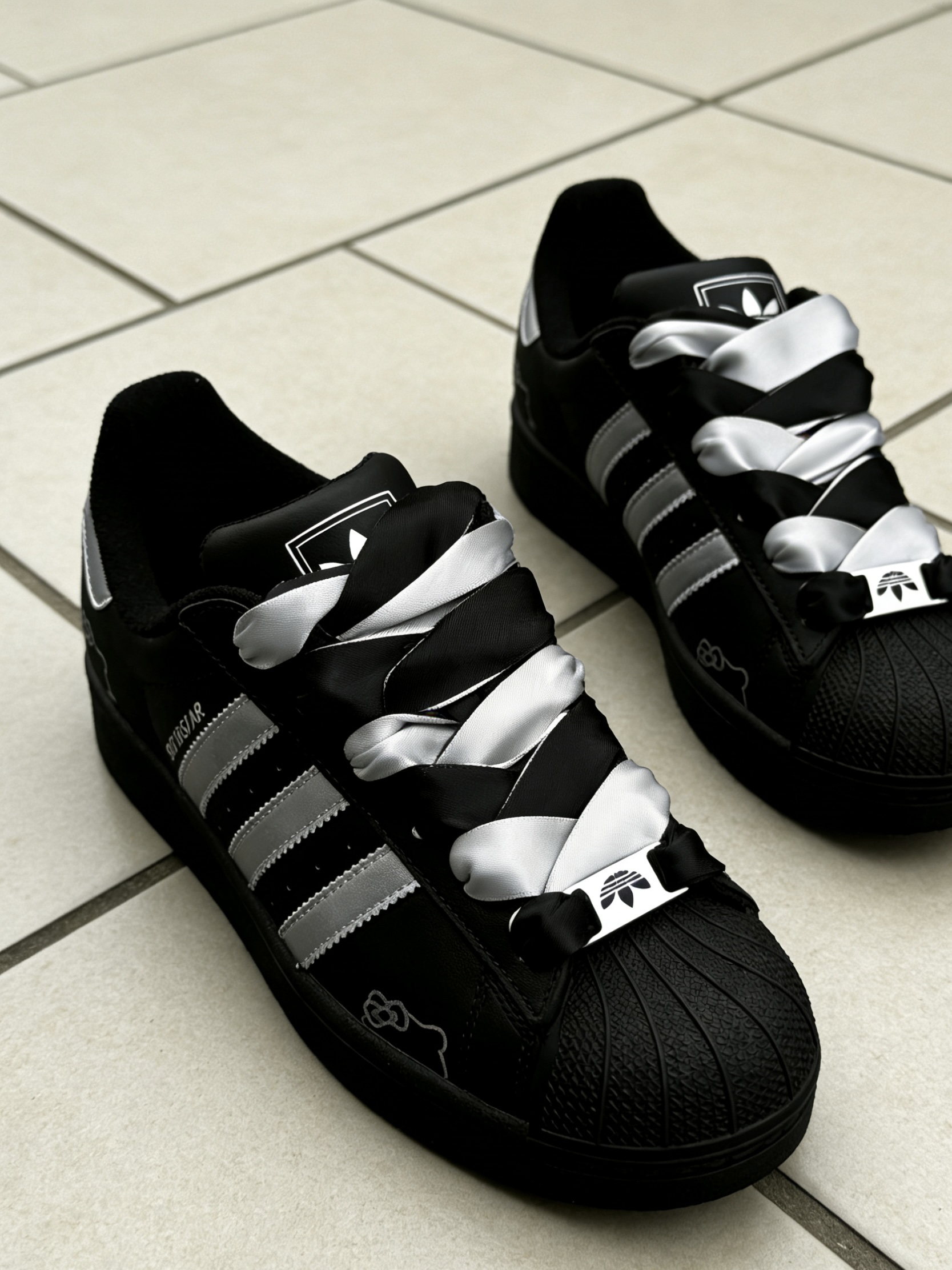这双阿迪黑白配色泰好看,系个蝴蝶结显得很俏皮。整体颜值泰高,当礼物送自己真的泰合适了✨