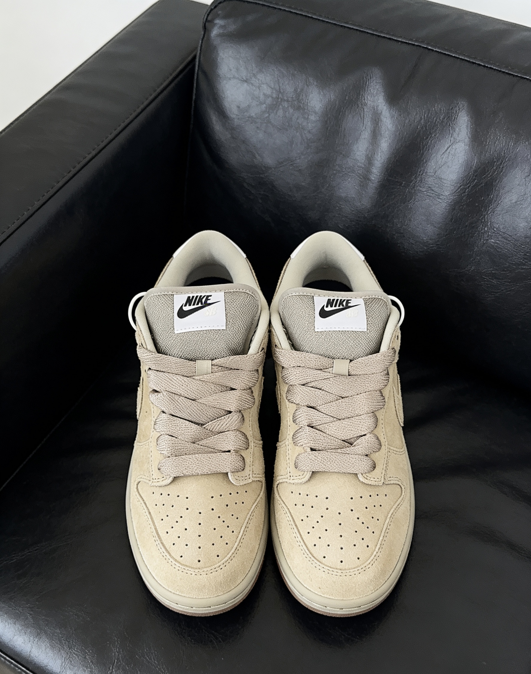 刚拿到手就被这双鞋的质感惊艳到了。全鞋身细腻的浅卡其麂皮,摸起来软乎乎的,自带一种温柔的复古感,在阳光下还能看到细腻的绒面光泽。