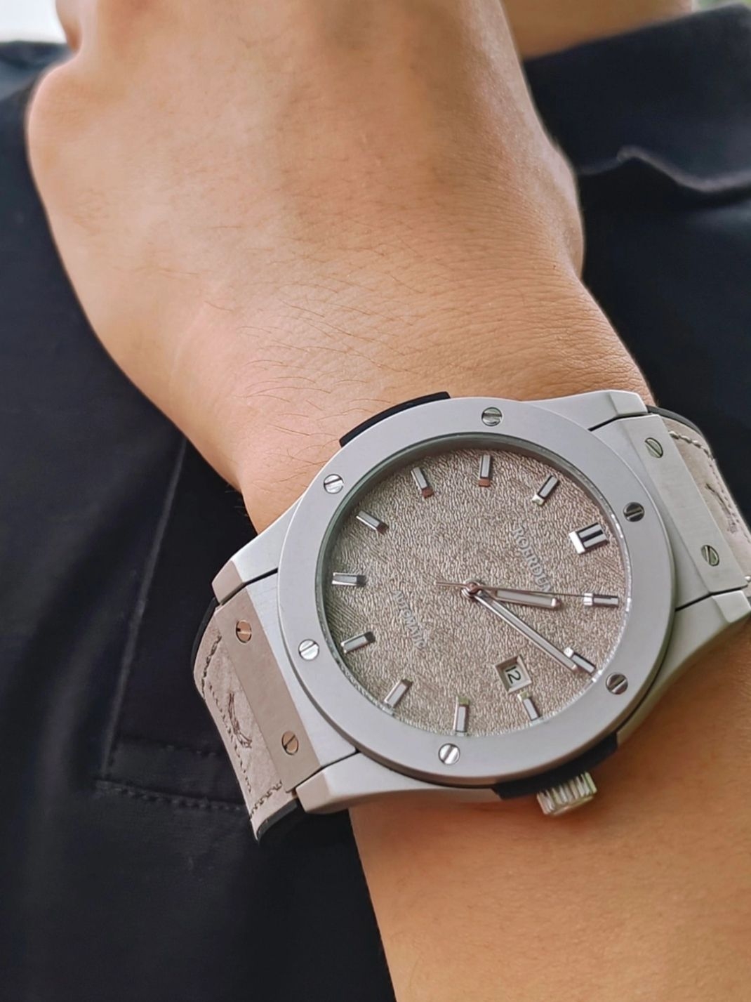 ⌚劳尔顿的这款表是真的很不错呀,整体是银色的,比较简约又不失高端大气 ✅表盘上有看是不规则,实则规则的纹路,特别的漂亮 ✅边框的金属感很重,带有磨砂质感,摸着是很舒服的 ✅表带是比较亲肤柔软的,带着不会觉得勒得慌 ✅比较简单的时针、秒针、分针,还有一个可以看日期的小框,并且有夜视效果,很方便男生佩戴上气质一下子就上来了,果然最简约的东西才最高端[ ✅价格才三位数,真的挺适合的