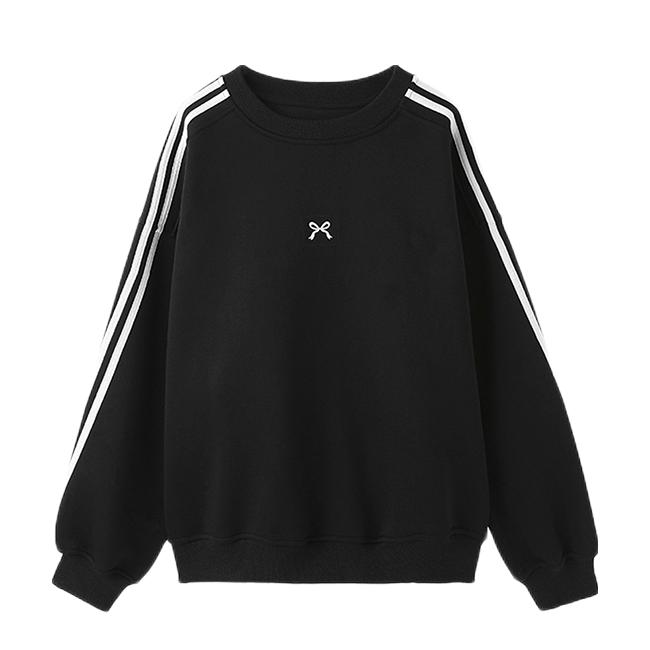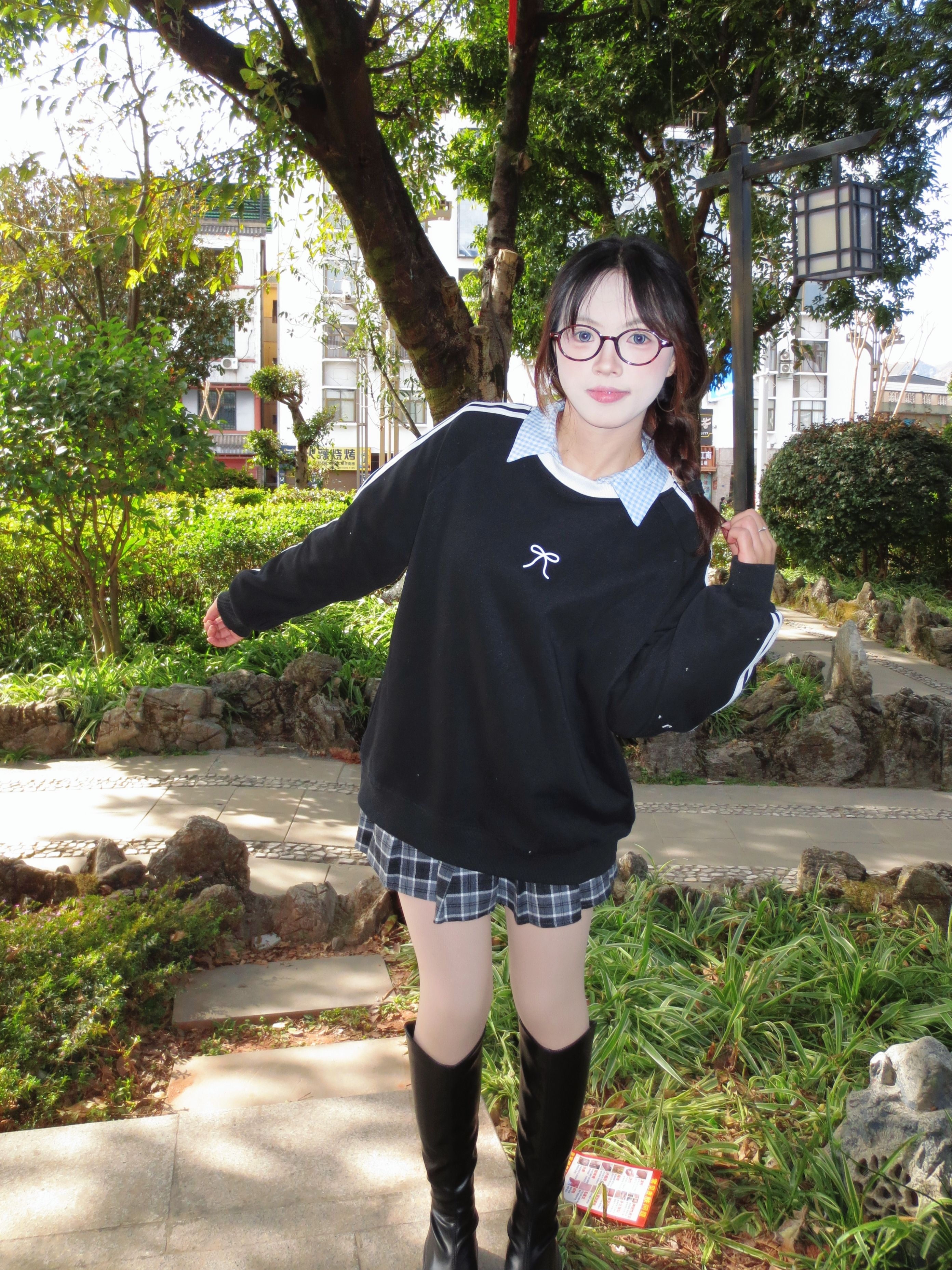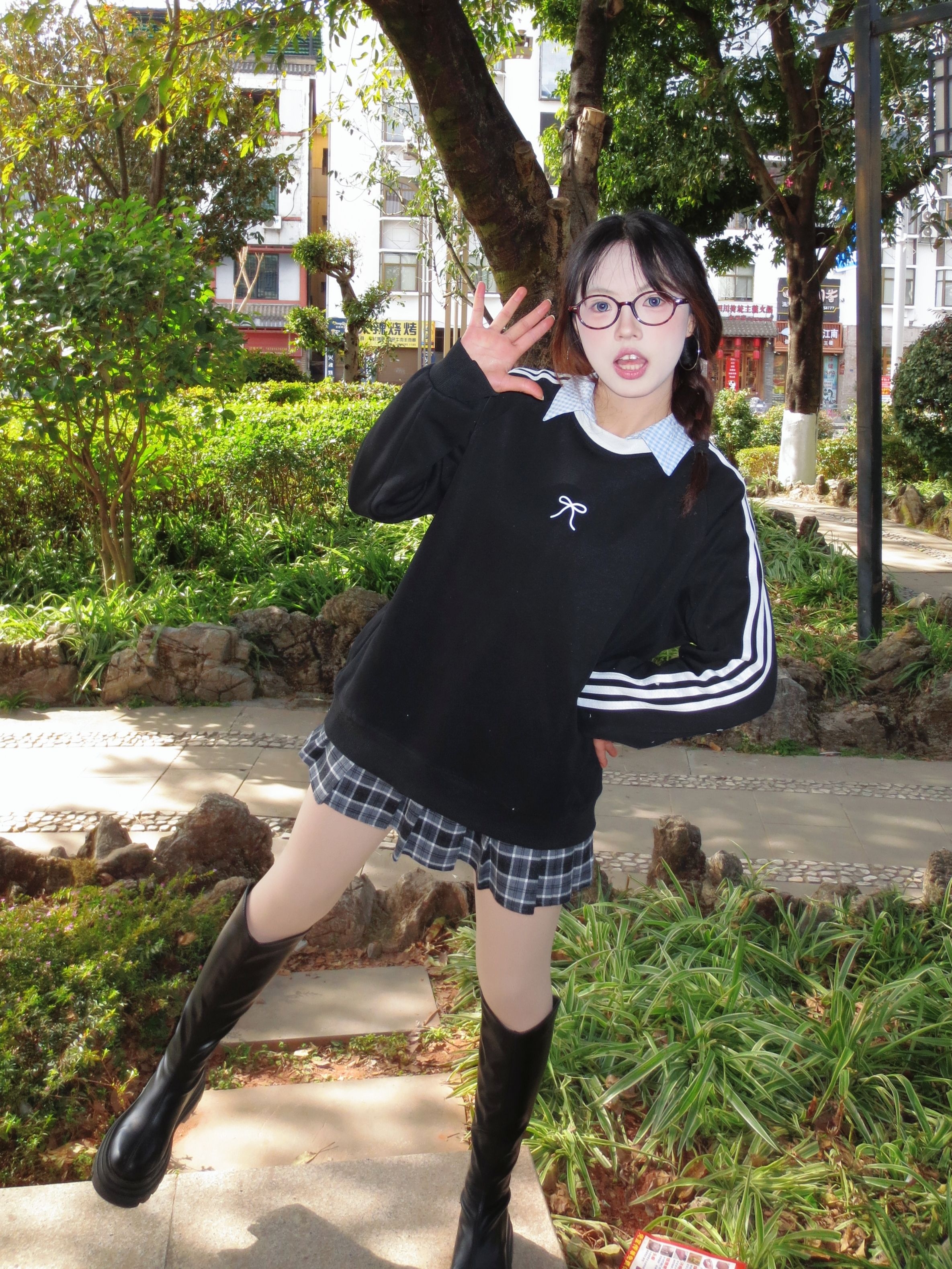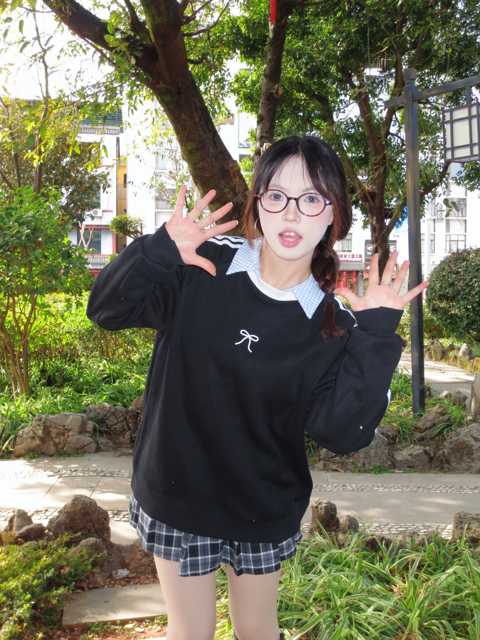 这件黑色圆领卫衣韩系感满满 日常随便搭件衬衫就能穿出层次感🥰 面料软乎乎的很舒服,胸前的小蝴蝶结细节又甜又乖 搭配短裙,就很有校供感✨