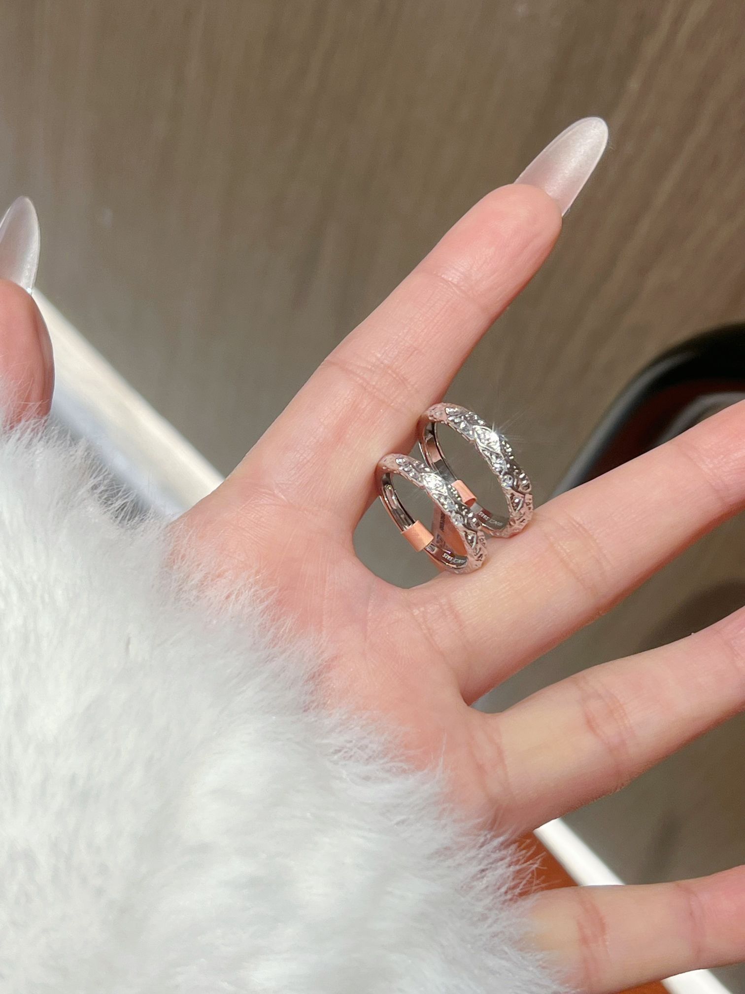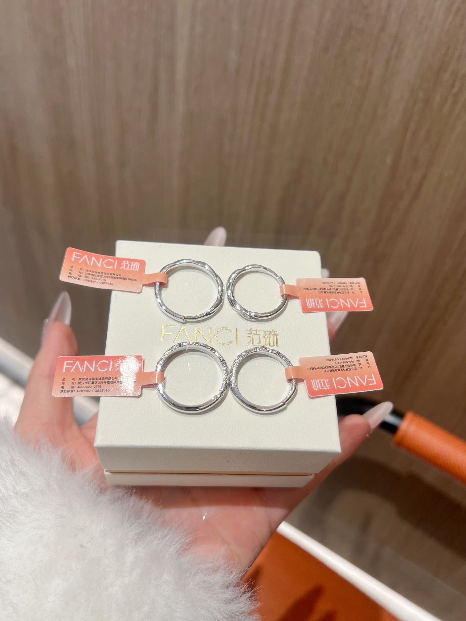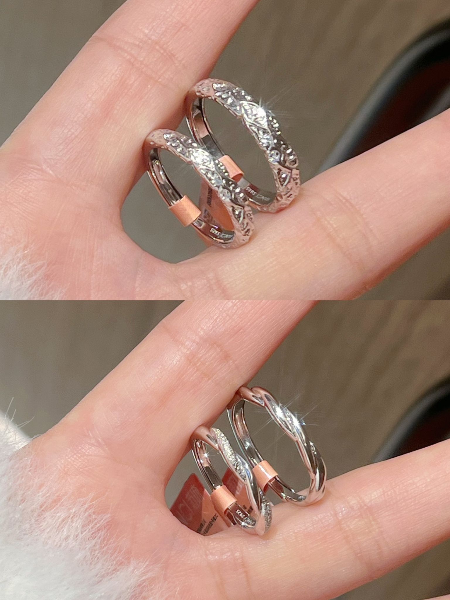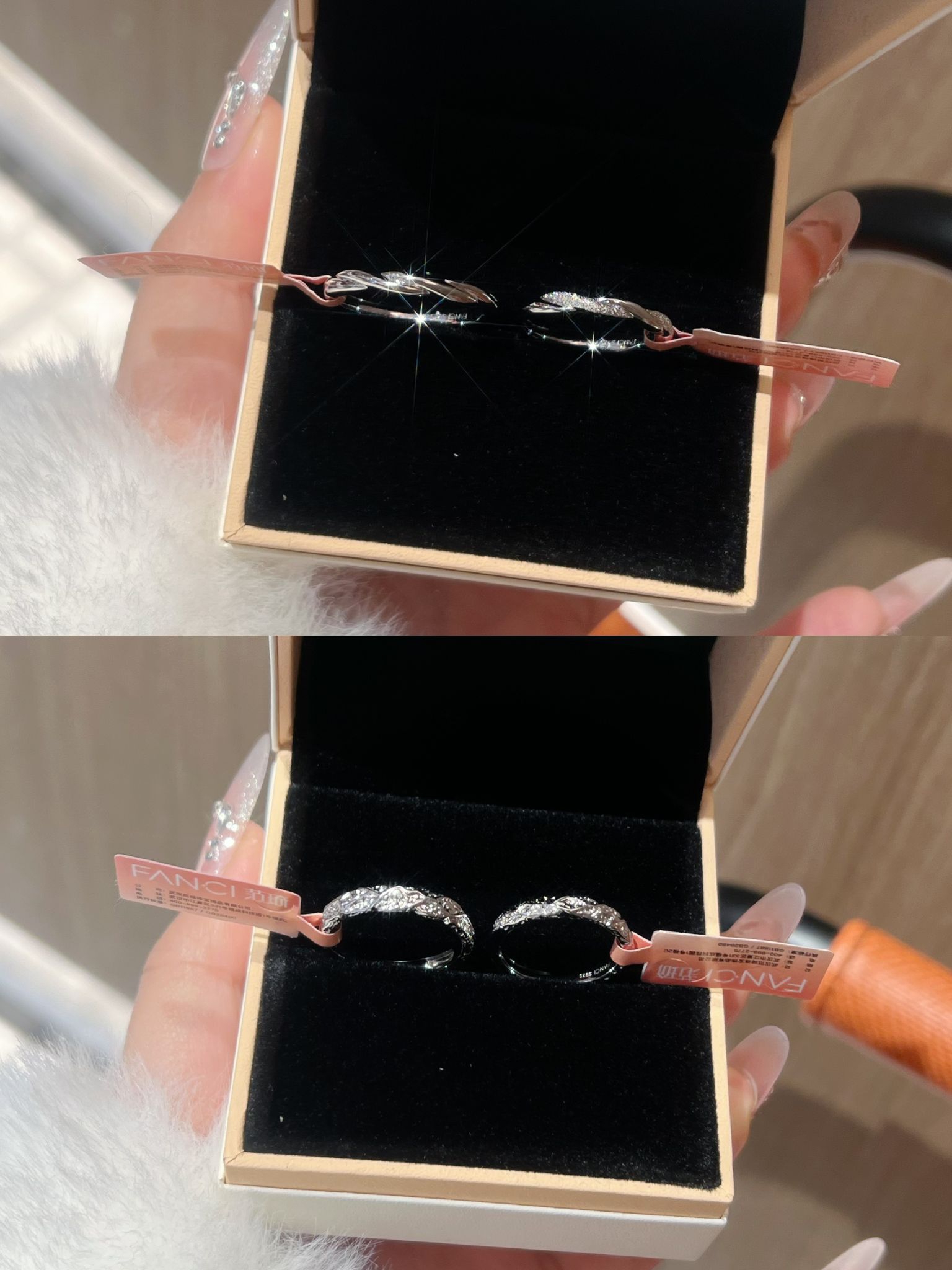 情人节马上到了 情侣对戒又添两对啦 这个质感我还是蛮喜欢的 一款是范琦熔岩之恋的糖果纸纹理hen有质感 寓意“熔岩般炙热的爱” 另一对是情意绵绵 带范琦情意绵绵与你岁岁年年 有一排小碎钻 好闪好精致