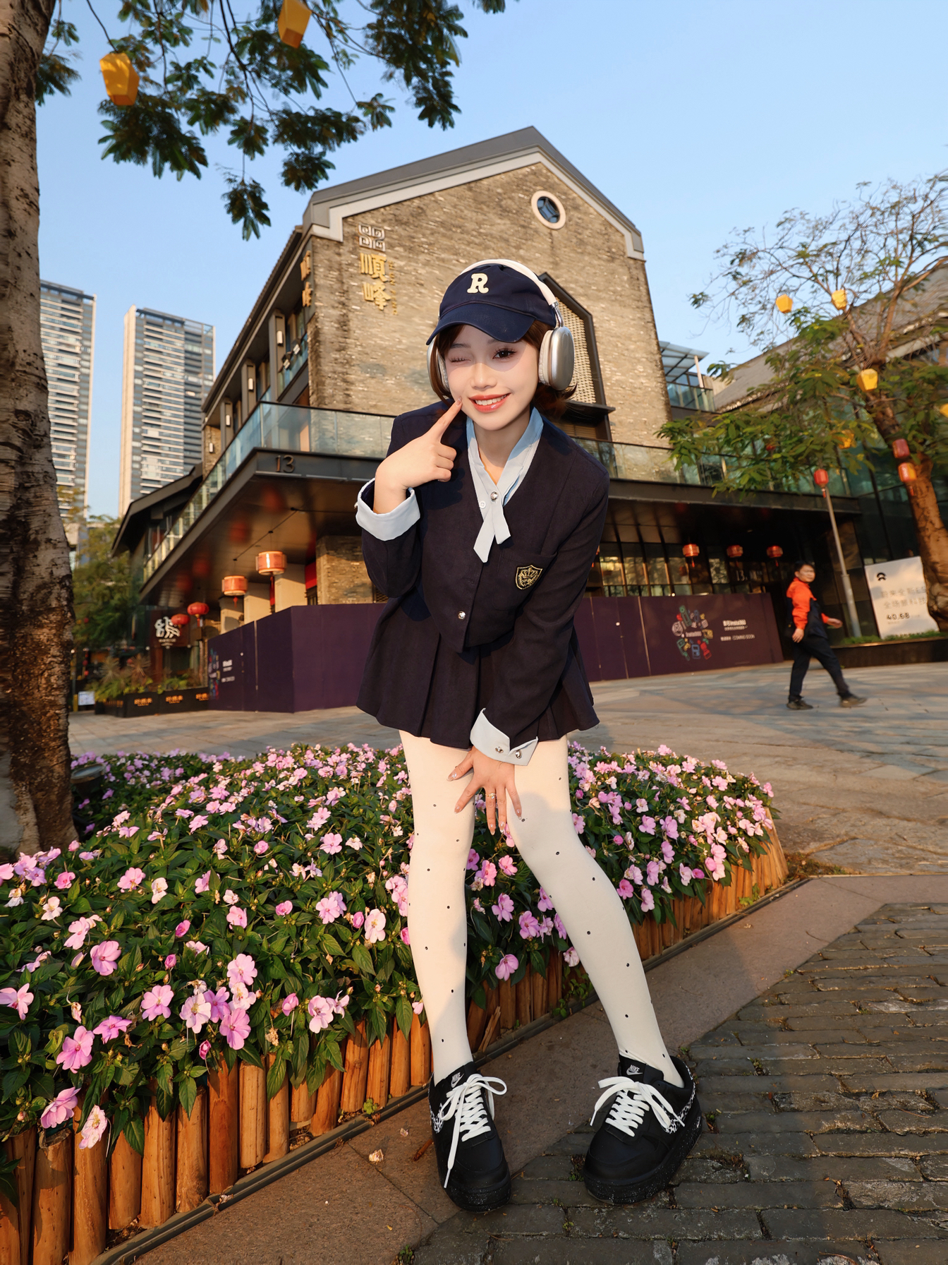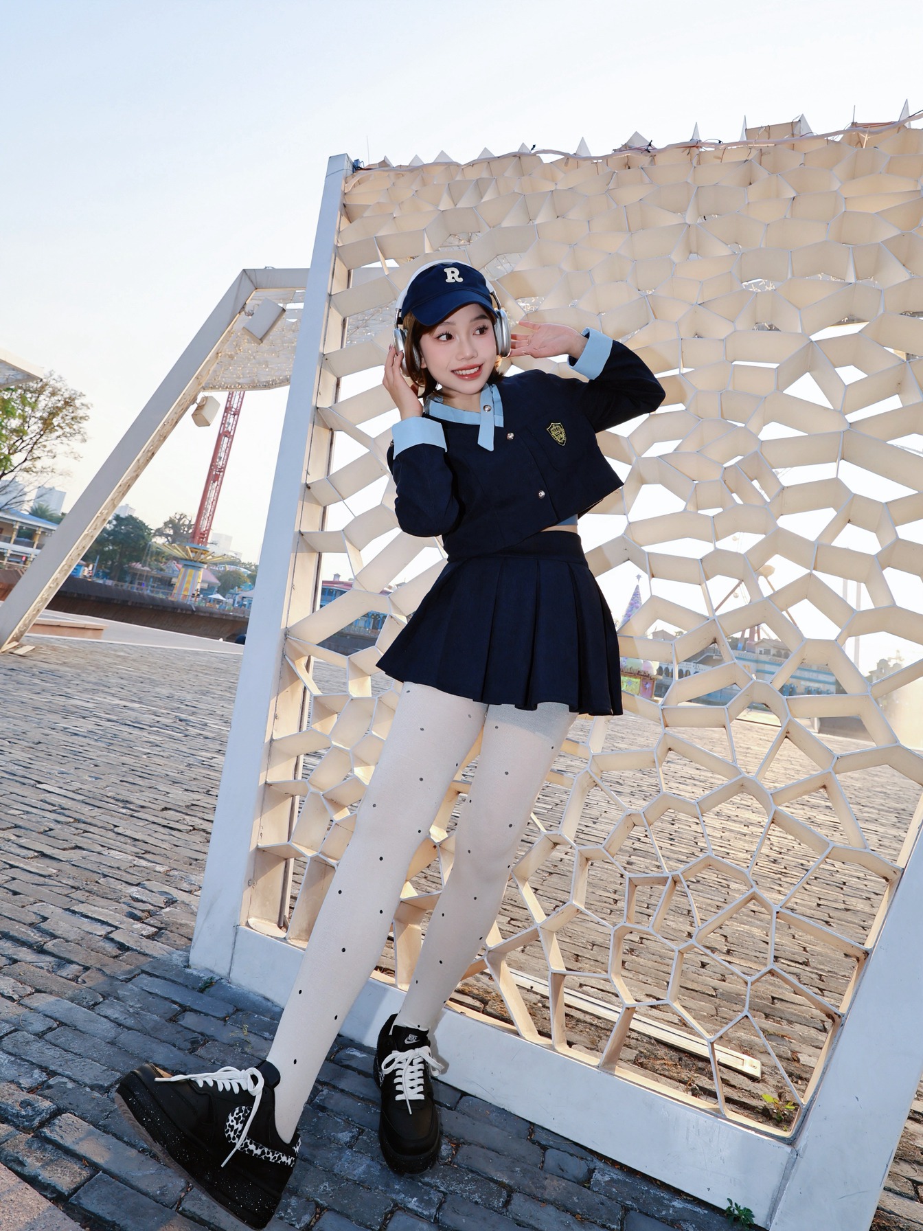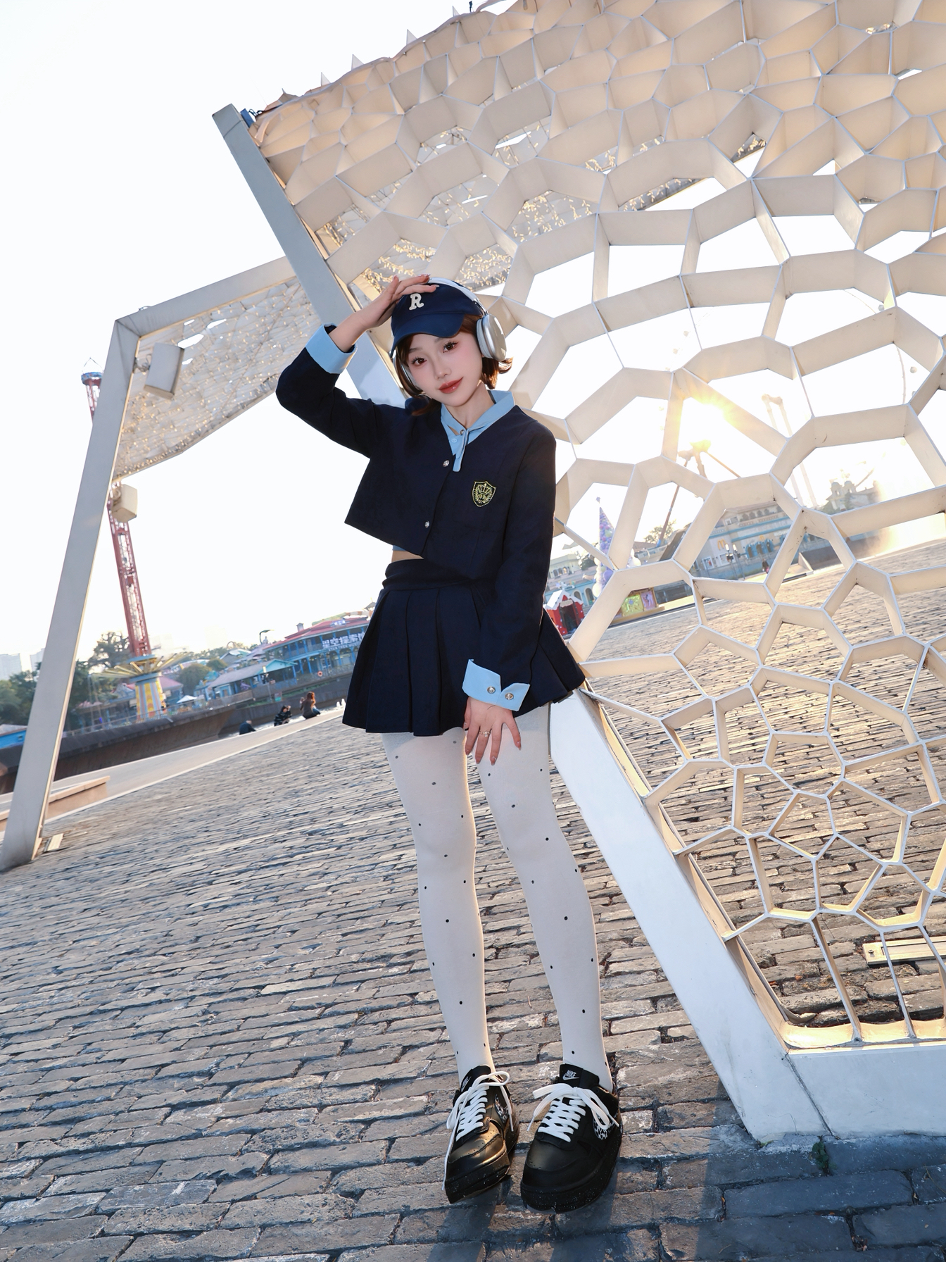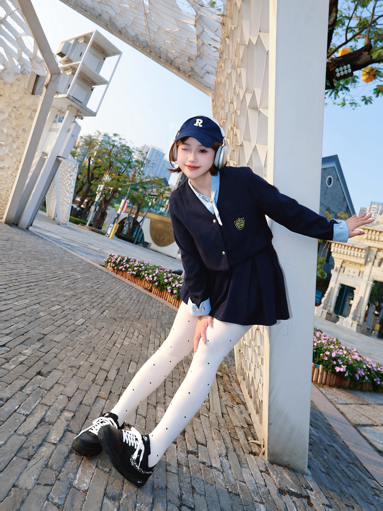今天是学院风乖乖女 一套藏青色学院风穿搭显瘦又元气 搭配知黑守白nike板鞋~我的老搭子了 上脚hin好看显脚小 还蛮显腿长 青春感满满 随手开拍也出片!
