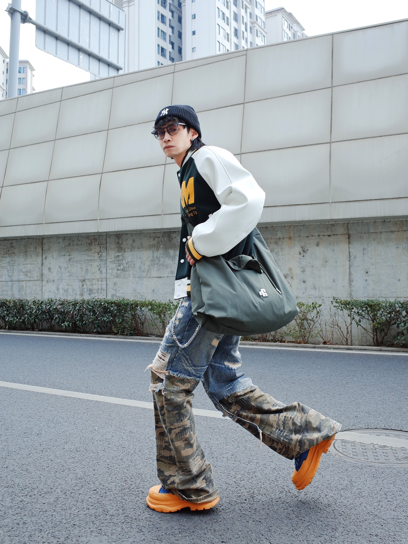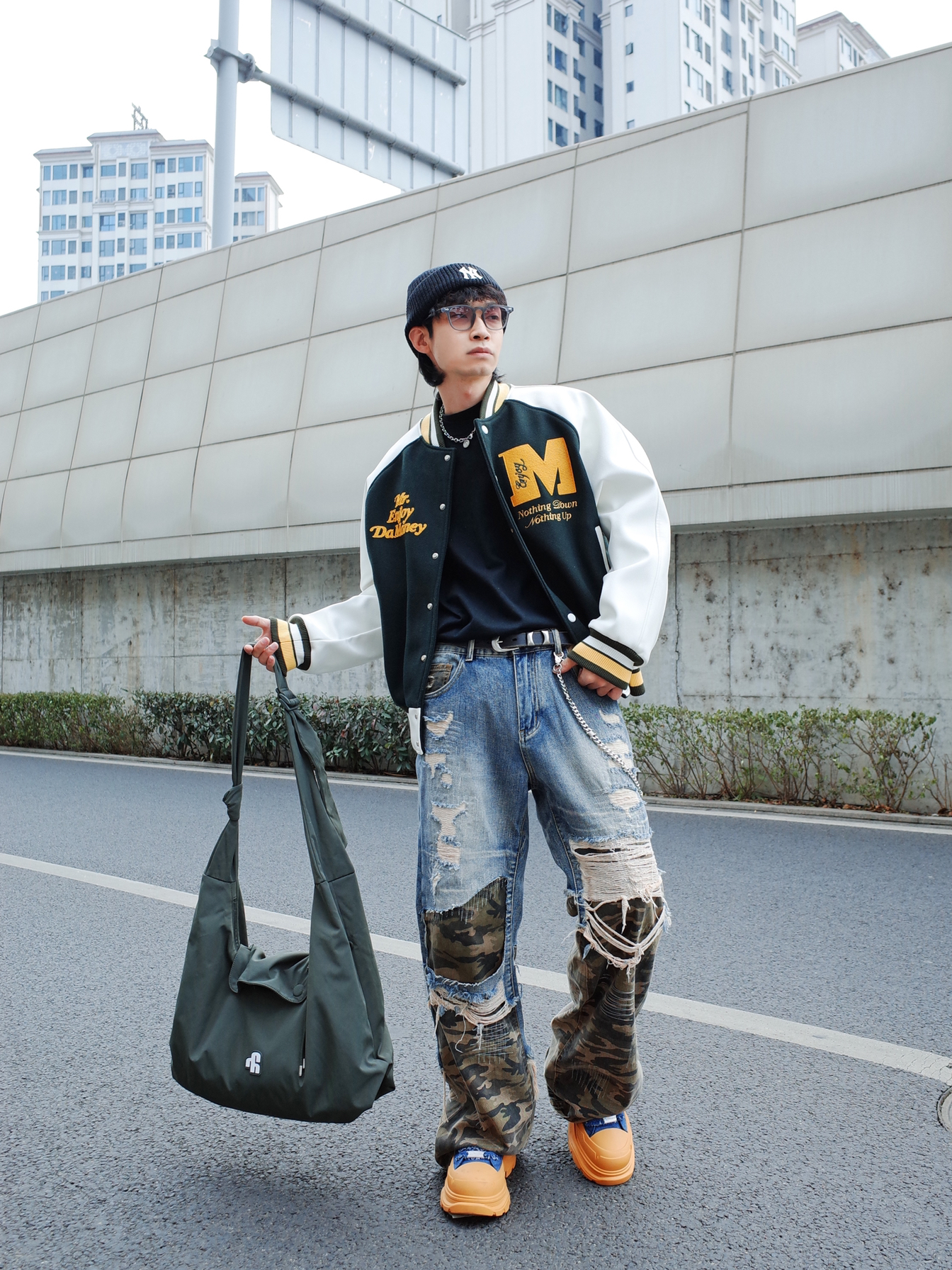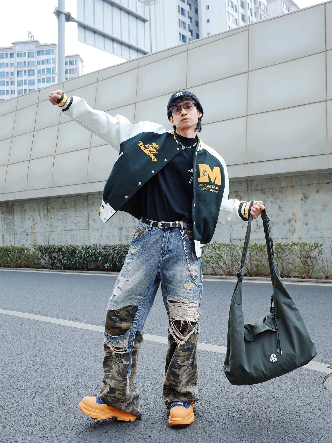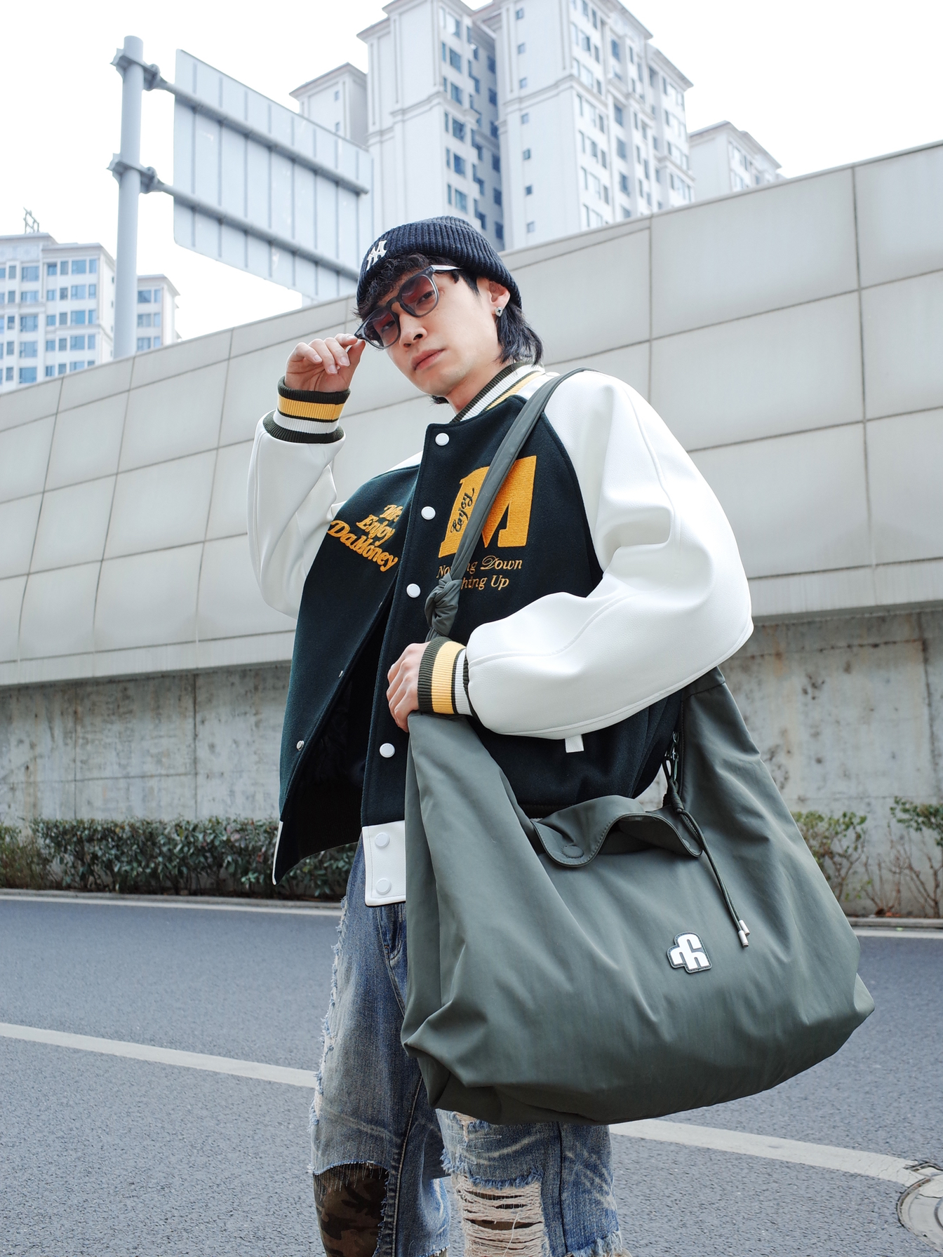 新春街头也要做个显眼包! 美式刺绣棒球服, 搭配自带层次感的拼接牛仔裤, 一身宽松的size自带松弛感⚡️ 出门在外配饰也不能少, 背上比我还能装的墨绿色斜挎包, 塞满对未来的祝福🎈 2026依旧做帅气的boy💥