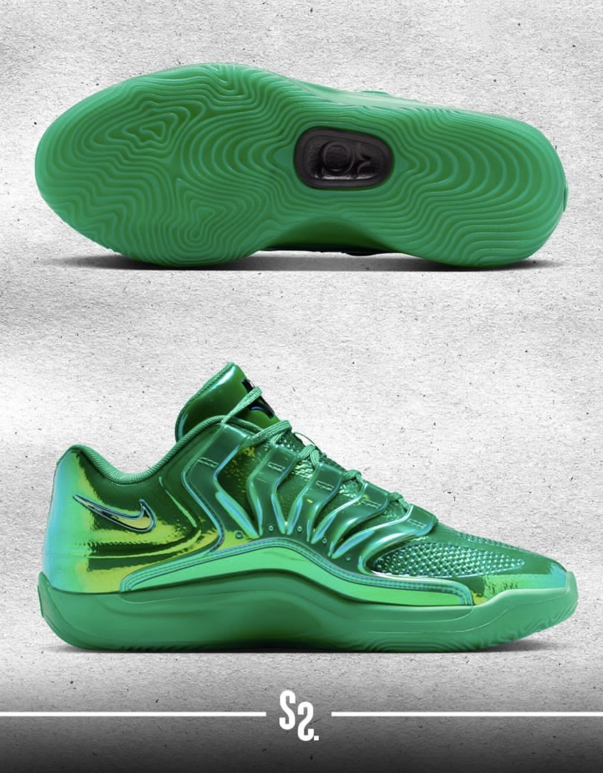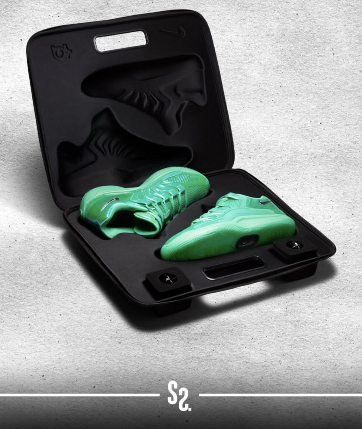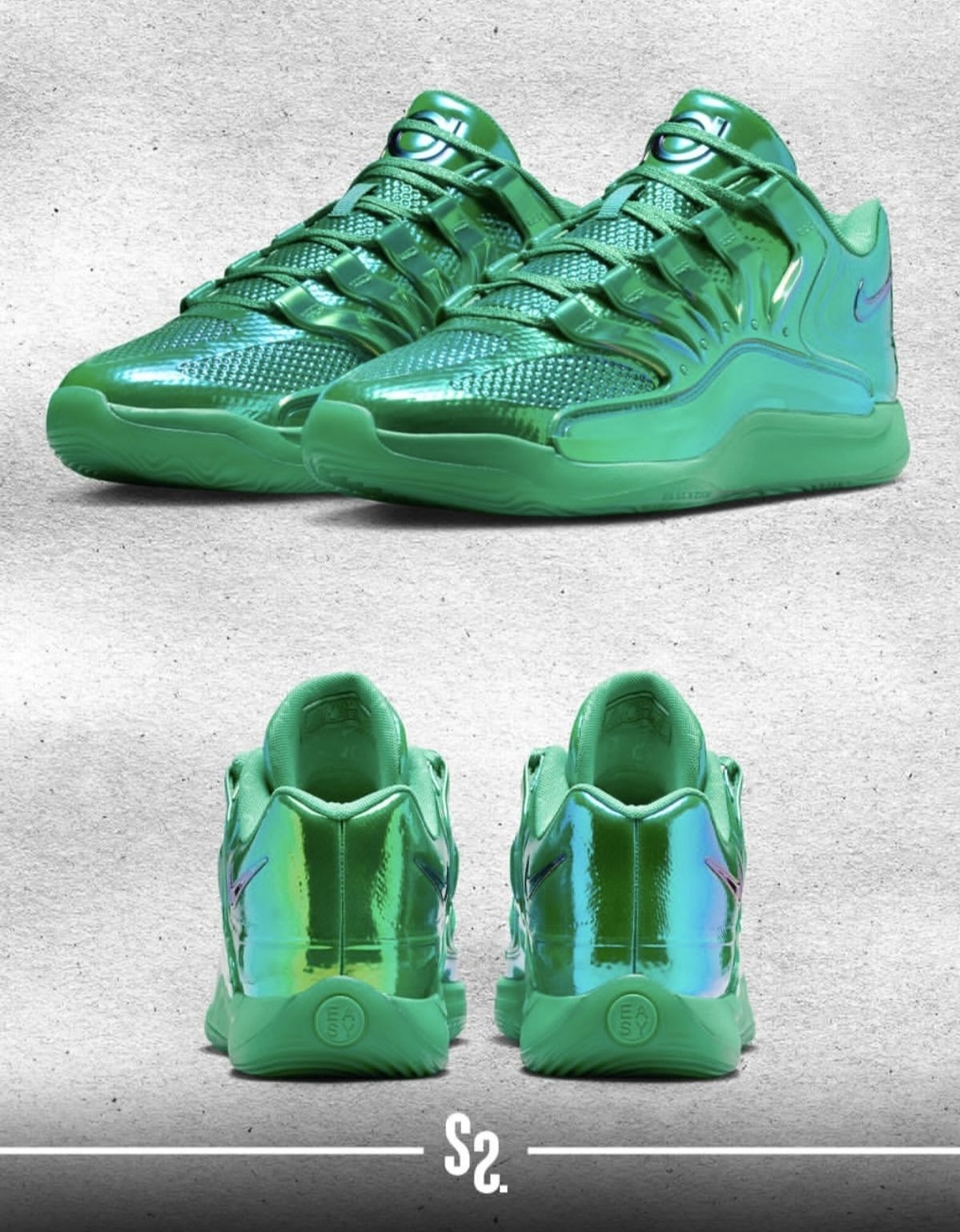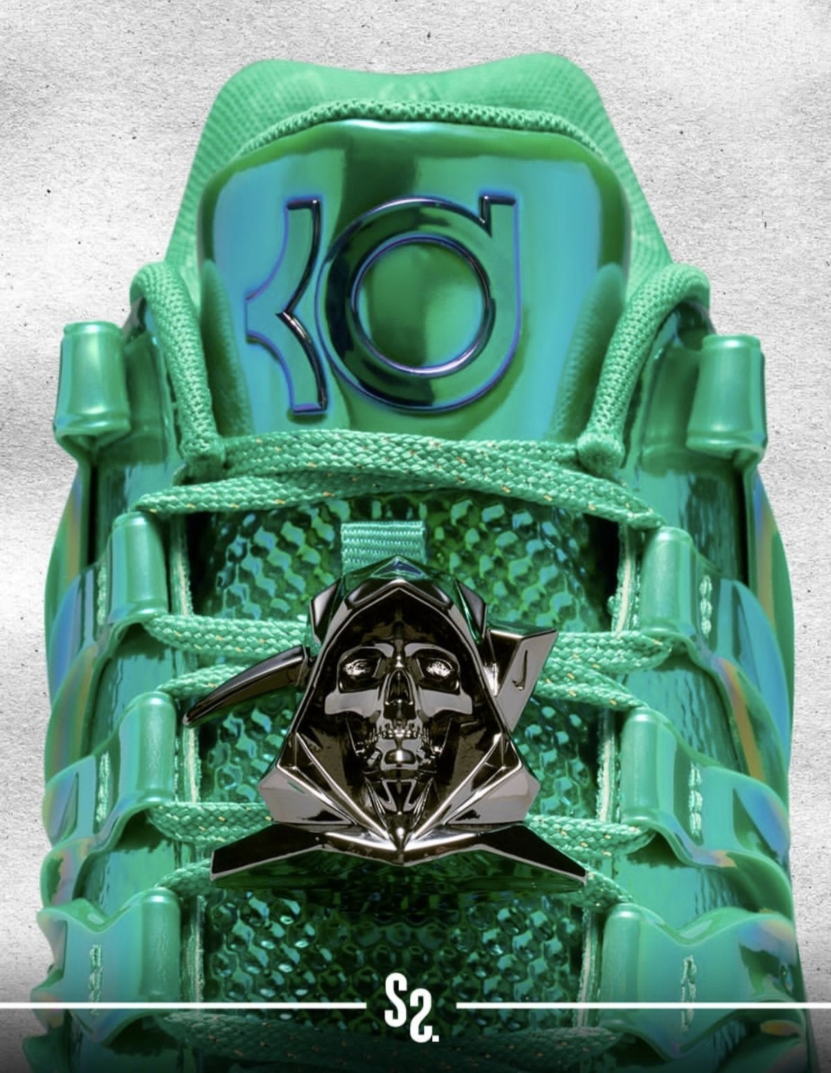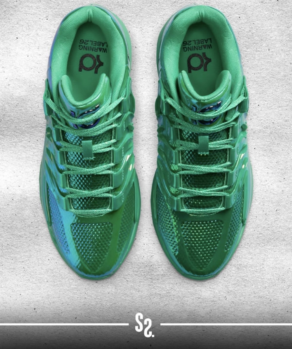 凯文·杜兰特的KD 18迎来了专为全明星打造的大胆升级,这就是“Warning Label”(警告标识)版本。 整双鞋采用极具光泽感的电光绿涂装,这款LX版本彻底开启了吸睛模式——从反光质感的鞋面和层次丰富的纹理,到极具辨识度的骷髅头鞋带扣,每一处细节都在吸引全场目光。