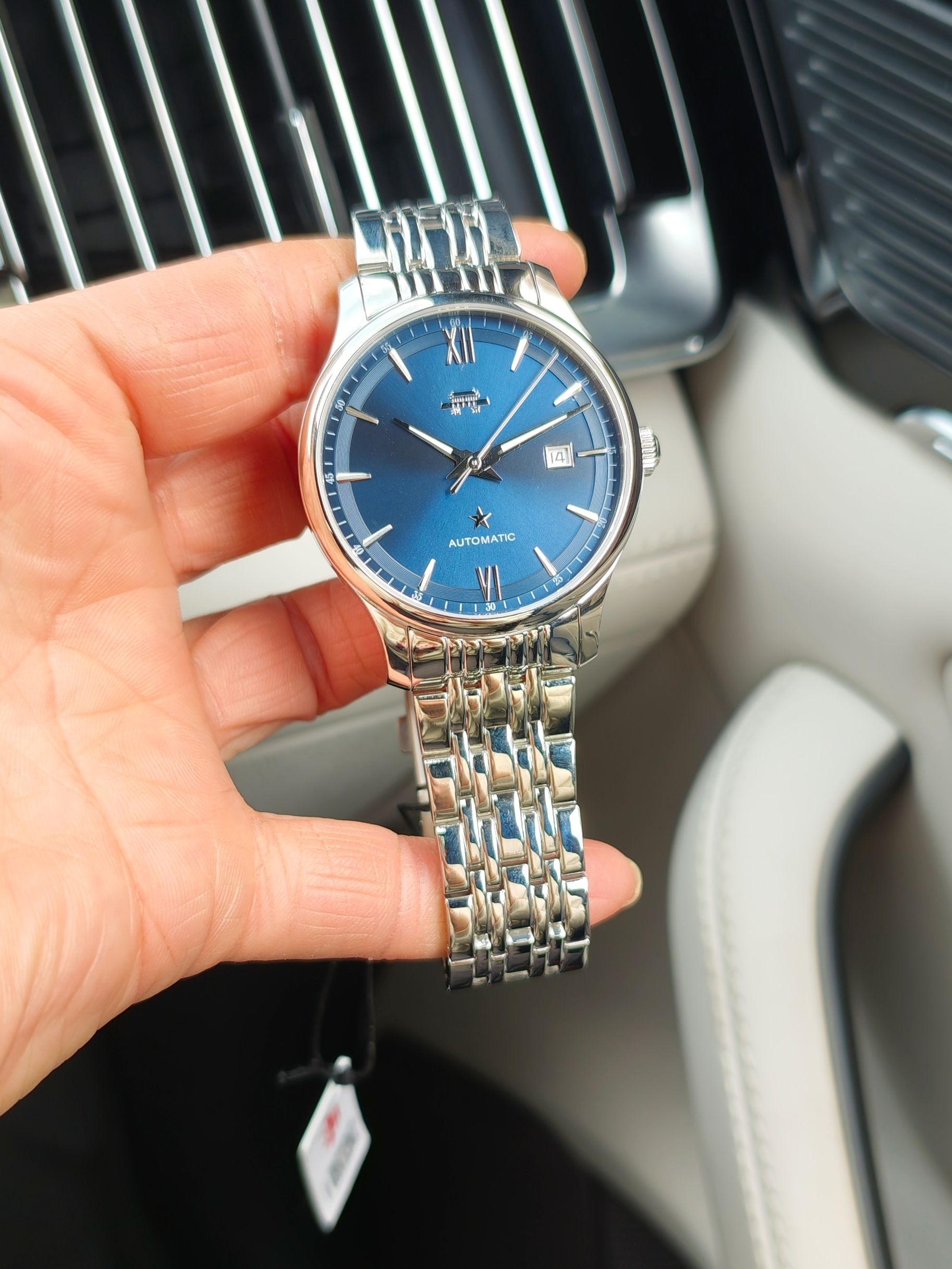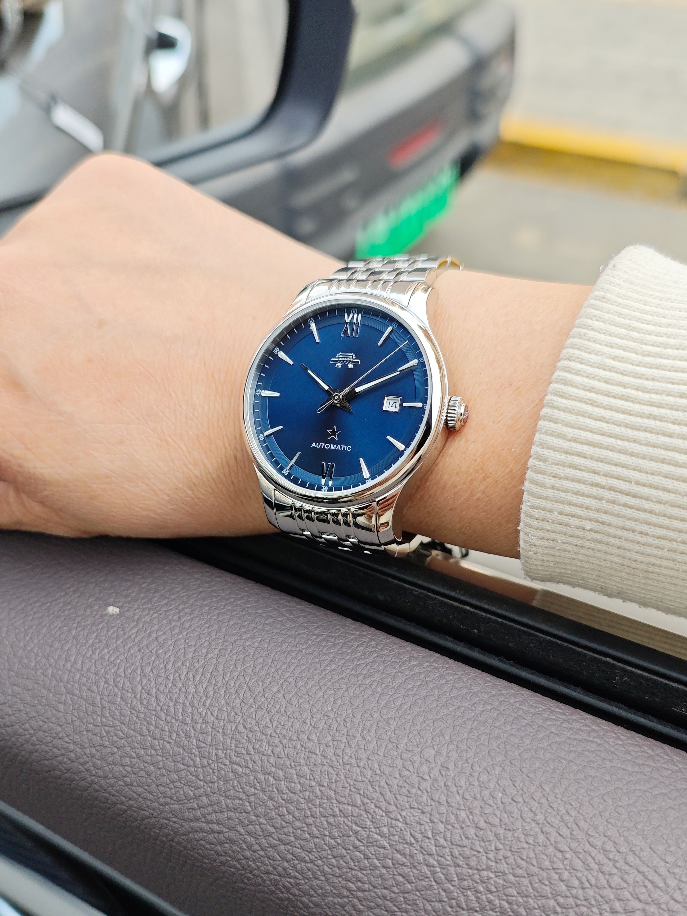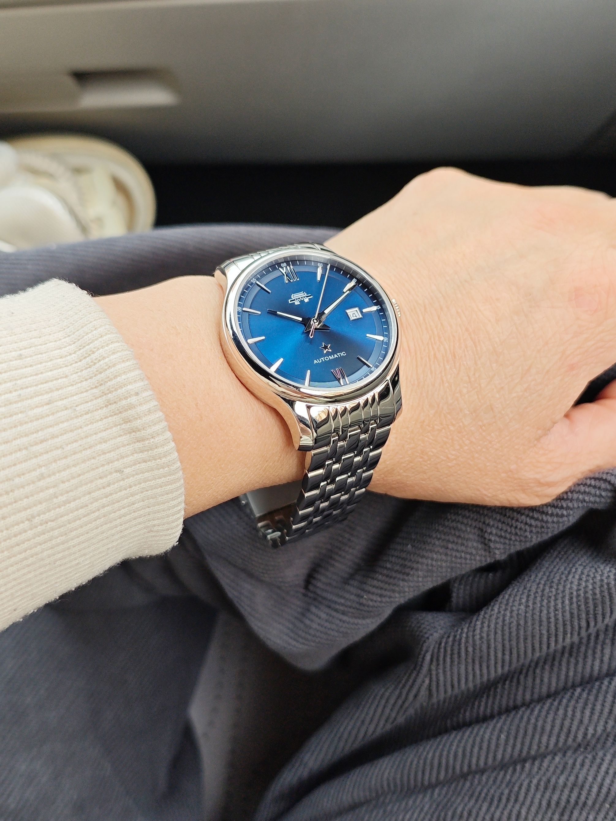 深蓝表盘透着优雅,罗马时标和星星标识又添了点精致细节,不管是商务通勤穿正装,还是日常搭休闲装,都能稳稳衬出低调的高级感~