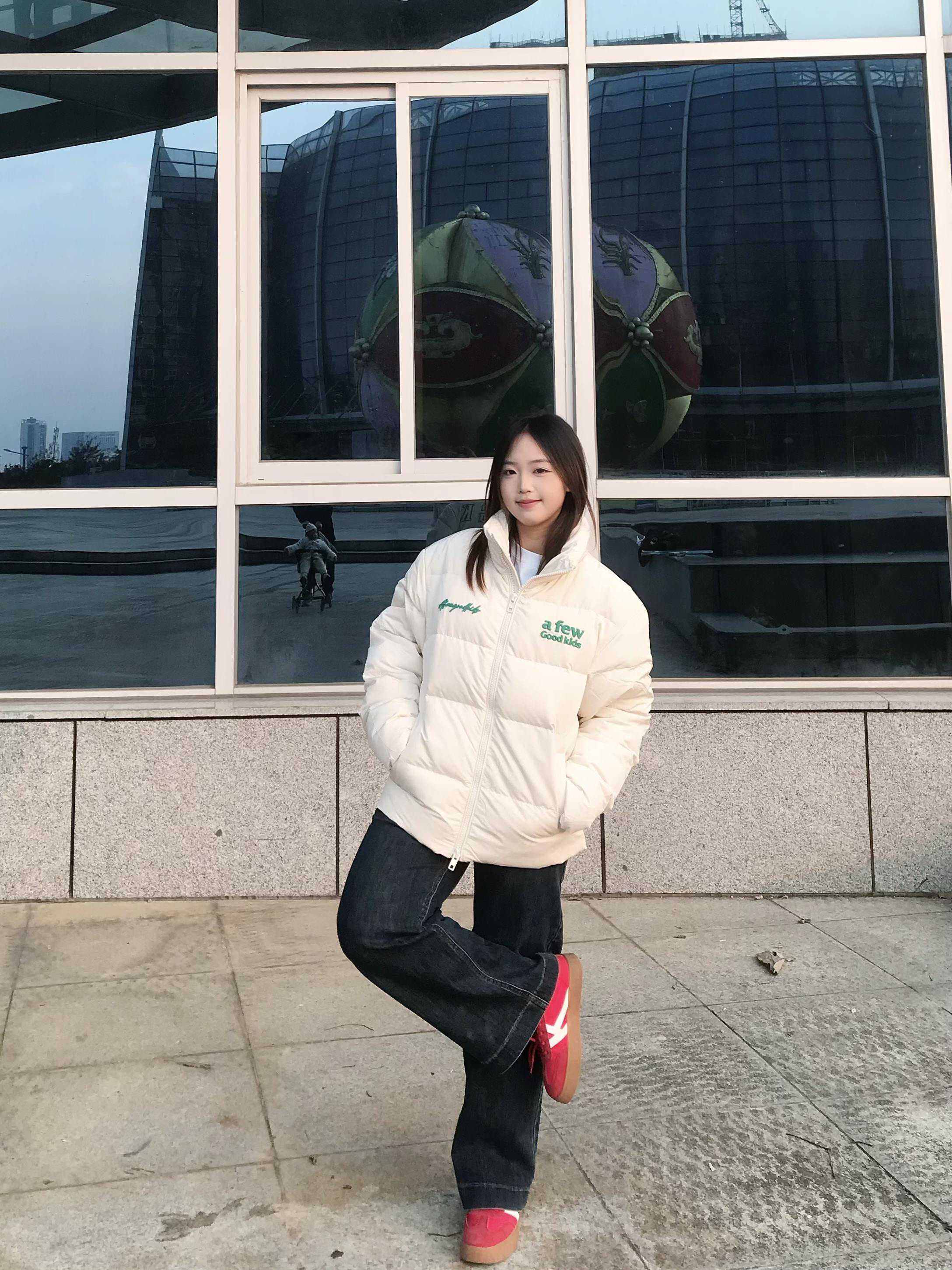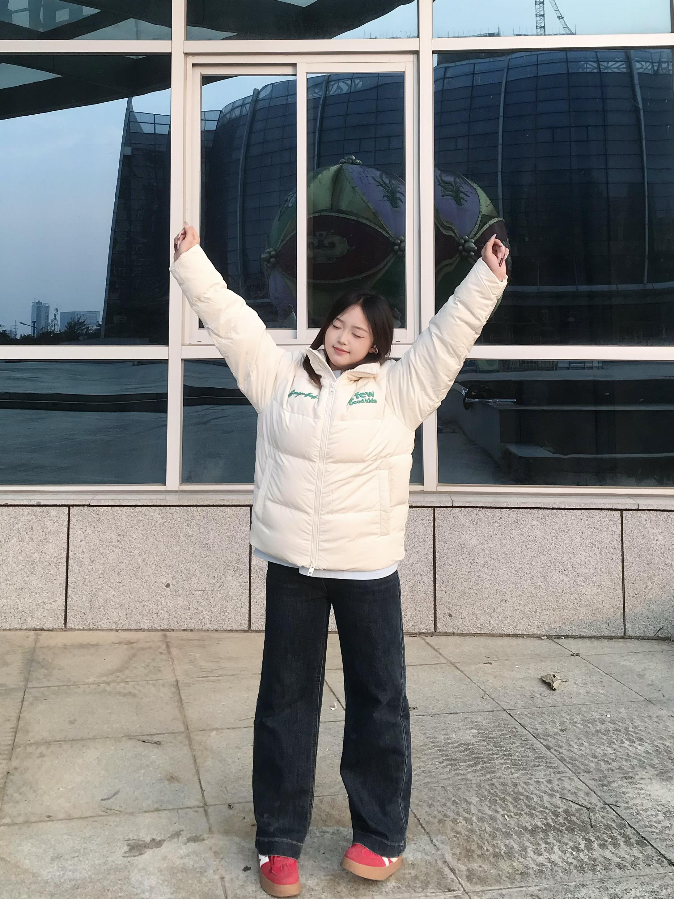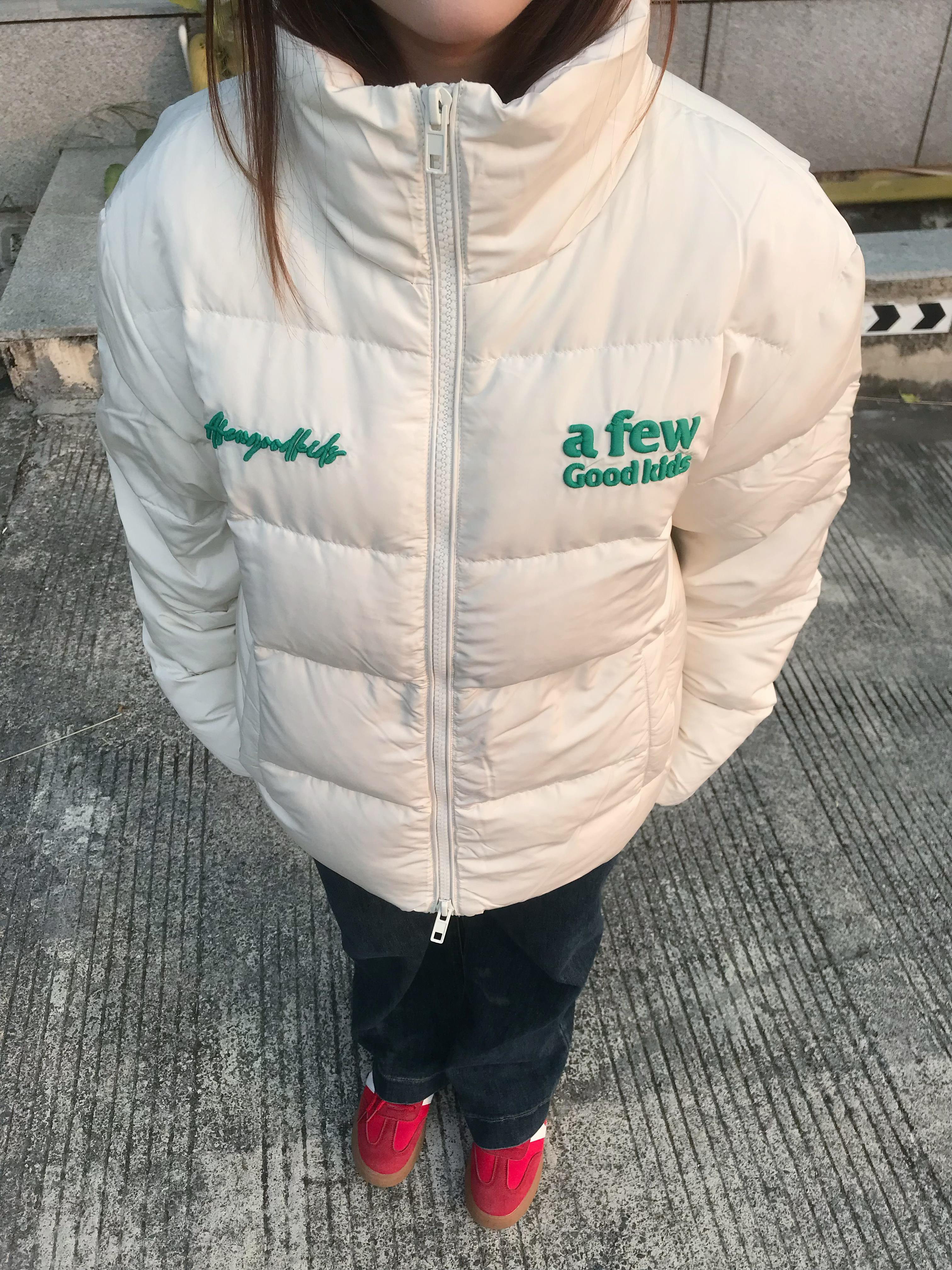 155/95穿S码刚合适! 入了AFGK这款米白羽绒服 面料是防风的聚酯纤维,摸起来软乎乎的 填充的羽绒蓬松又轻盈,穿在身上暖乎乎却不臃肿 绿标刺绣超有元气,日常搭牛仔裤和红鞋子就很出片~