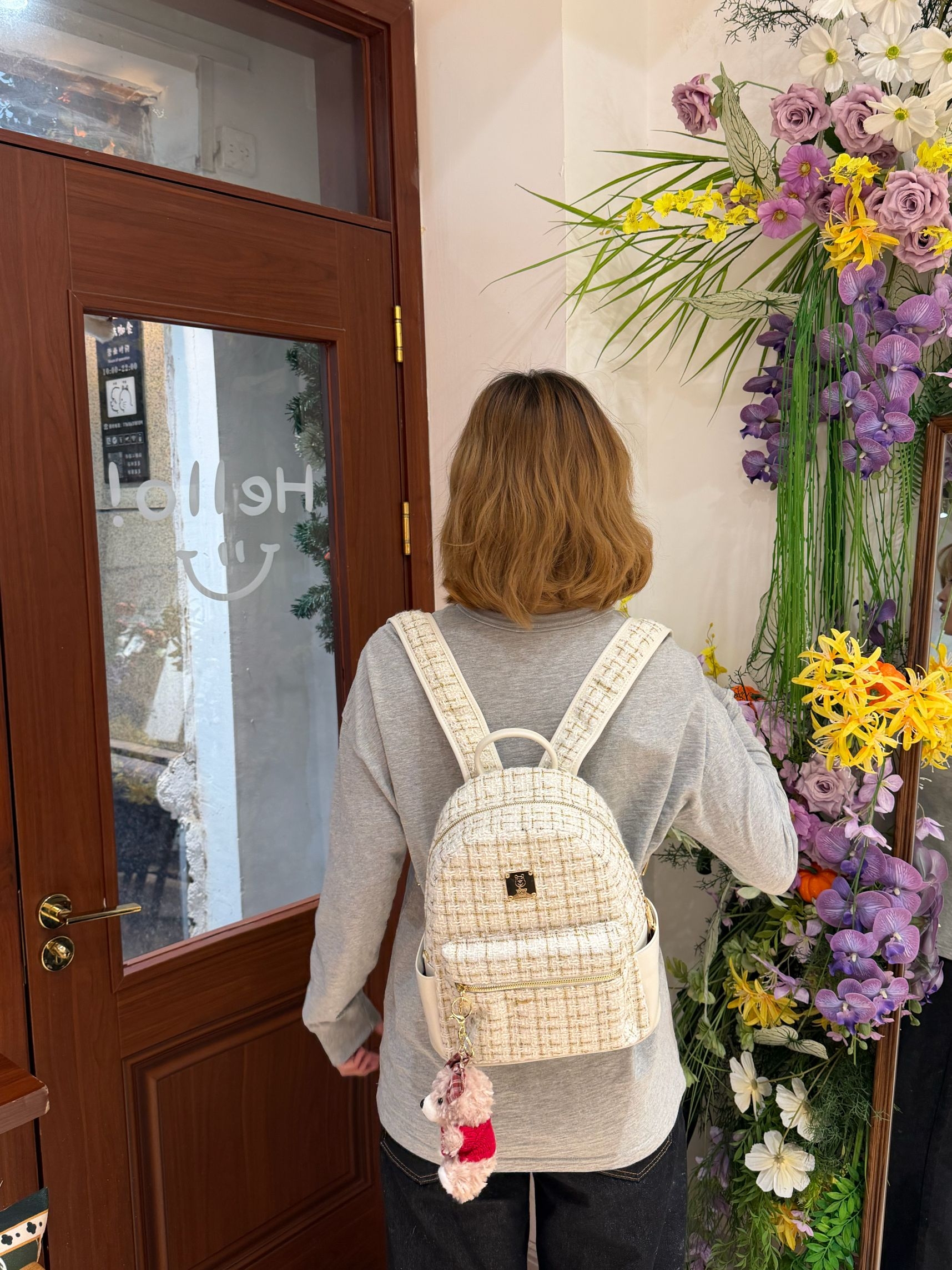 包包是米白混金丝的编织面料 自带细腻的光泽感 摸起来软fufu的 贴背背着也很舒服 正面的金属小标低调又精致 侧边的插袋可以放纸巾、口红,日常出门装下粉饼、耳机这些小物件完全够用 还配有一个很可爱的挂件! 秋冬出门的快乐真的是一只百搭的包包给的~ 外观精致又实用 当新年礼物送朋友也很合适🎁