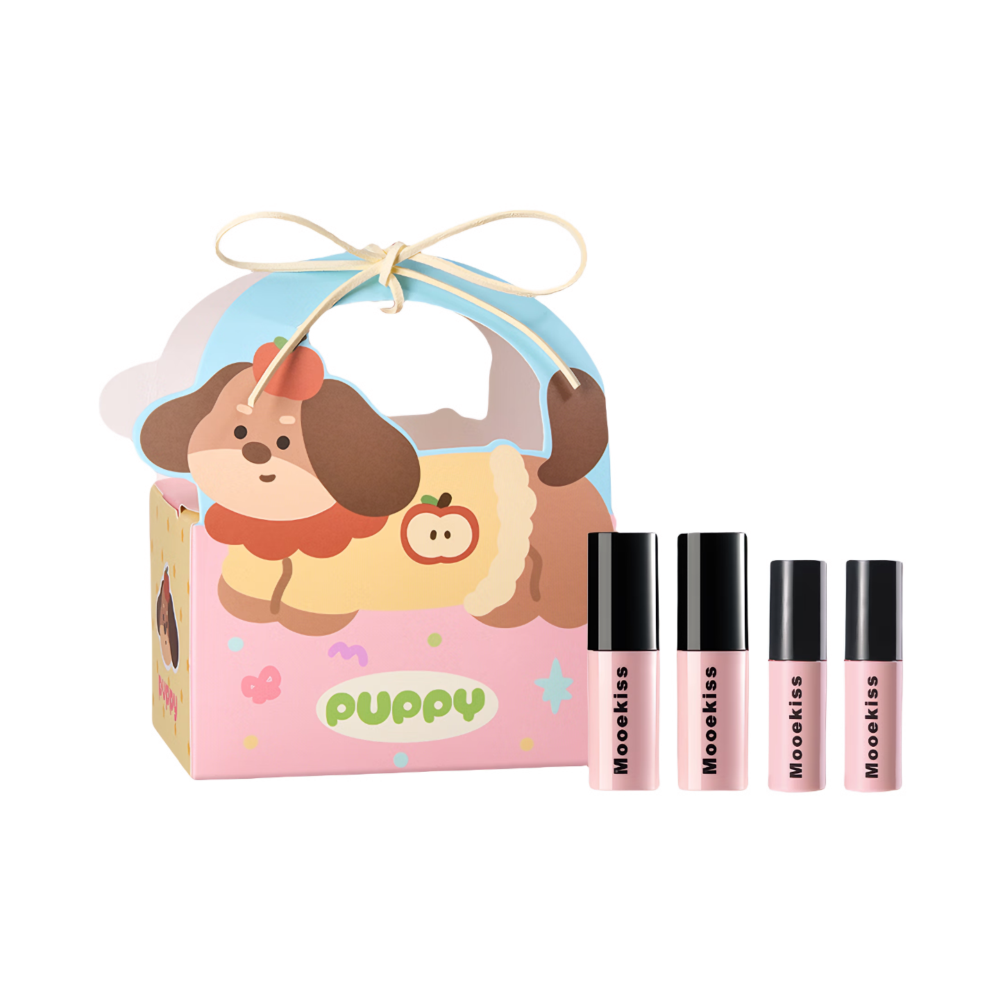新一年送自己一套苹果小狗礼盒没猫饼吧 礼盒上是一只头顶着红彤彤苹果的小腊肠狗 整体清新韩系的包装小设计 真的很戳我🥰 这一个是木柯诗的苹果小狗礼盒A款 里面是三支热门的唇釉 两支雾面唇泥V12法式布蕾和V36玫瑰缪斯 一支水光唇釉03水蜜桃冻 和一个修眉刀+两枚同款的小狗发卡 素颜也能吼住的三款口红 小预算礼物选这套真滴够啦~