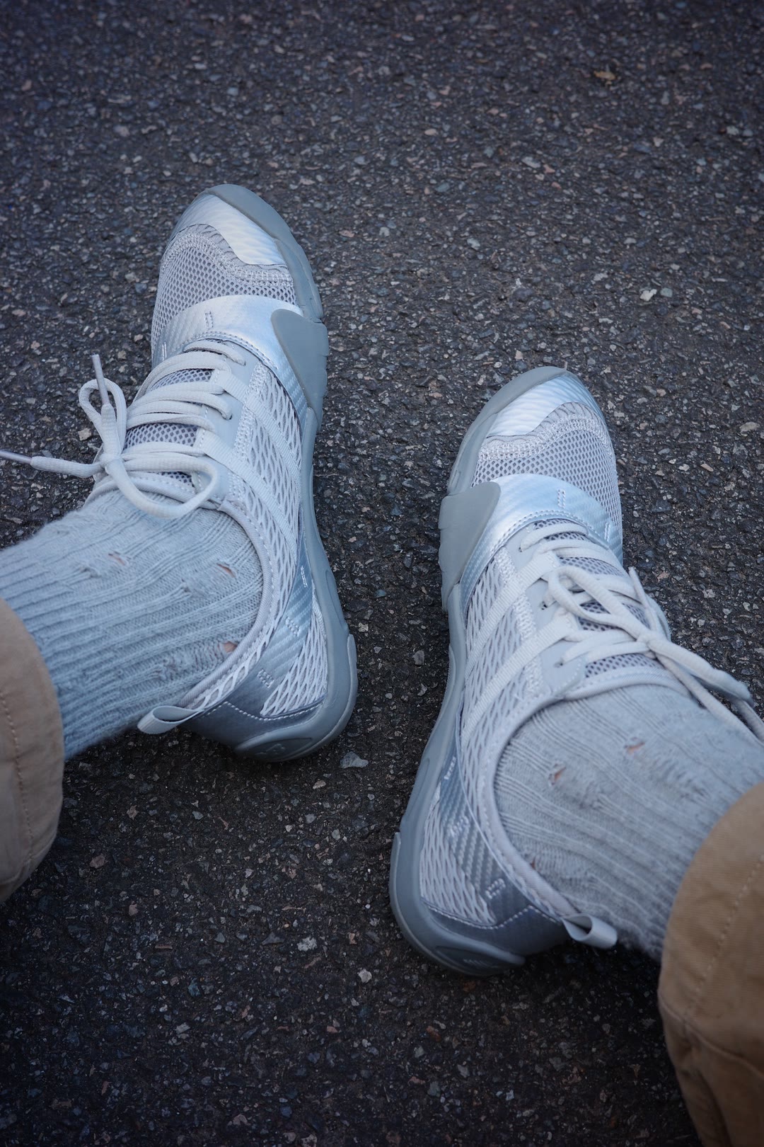 最近被朋友按头安利的这双鞋,上脚直接封神! 银色鞋面在阳光下会有细腻的光泽感,网眼设计透气性拉满,穿一天都不闷脚。 • 🌟 颜值党狂喜:银灰色调自带赛博朋克感,搭配运动裤、牛仔裤都超吸睛,日常出街回头率100%。 • 🚶 脚感炸裂:Vibram黄金大底抓地力超强,不管是通勤还是轻运动,都能给足支撑和回弹。 • 💡 细节控狂喜:鞋身的纹理设计很有层次,鞋带和鞋舌的贴合度也刚刚好,跑跳都不会掉跟...