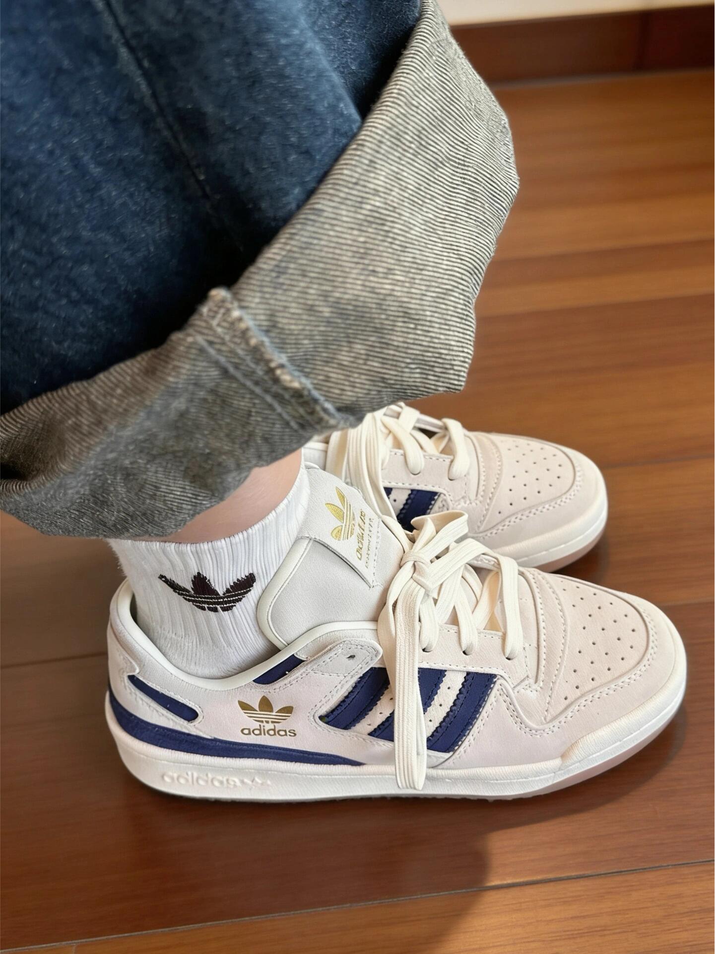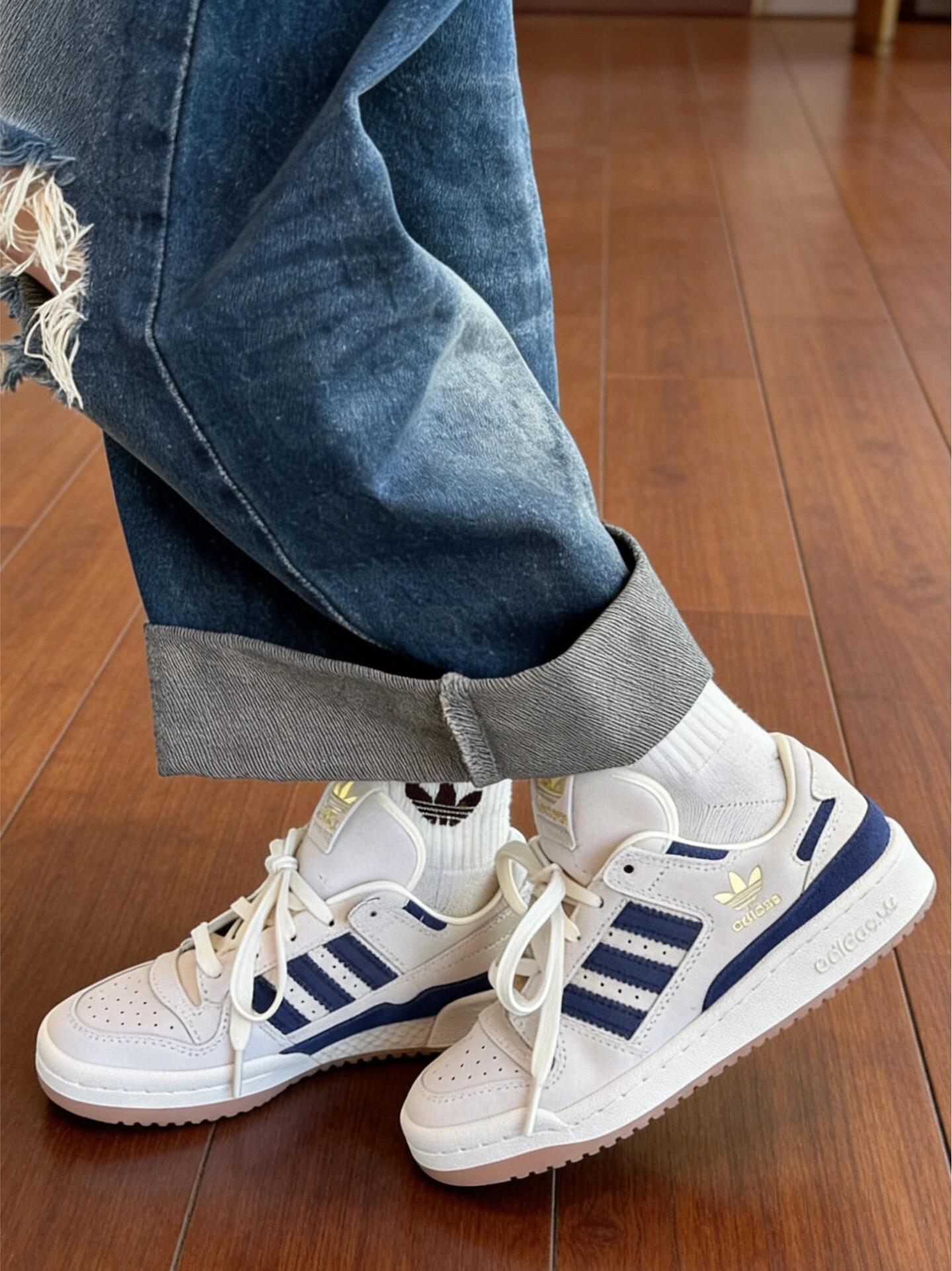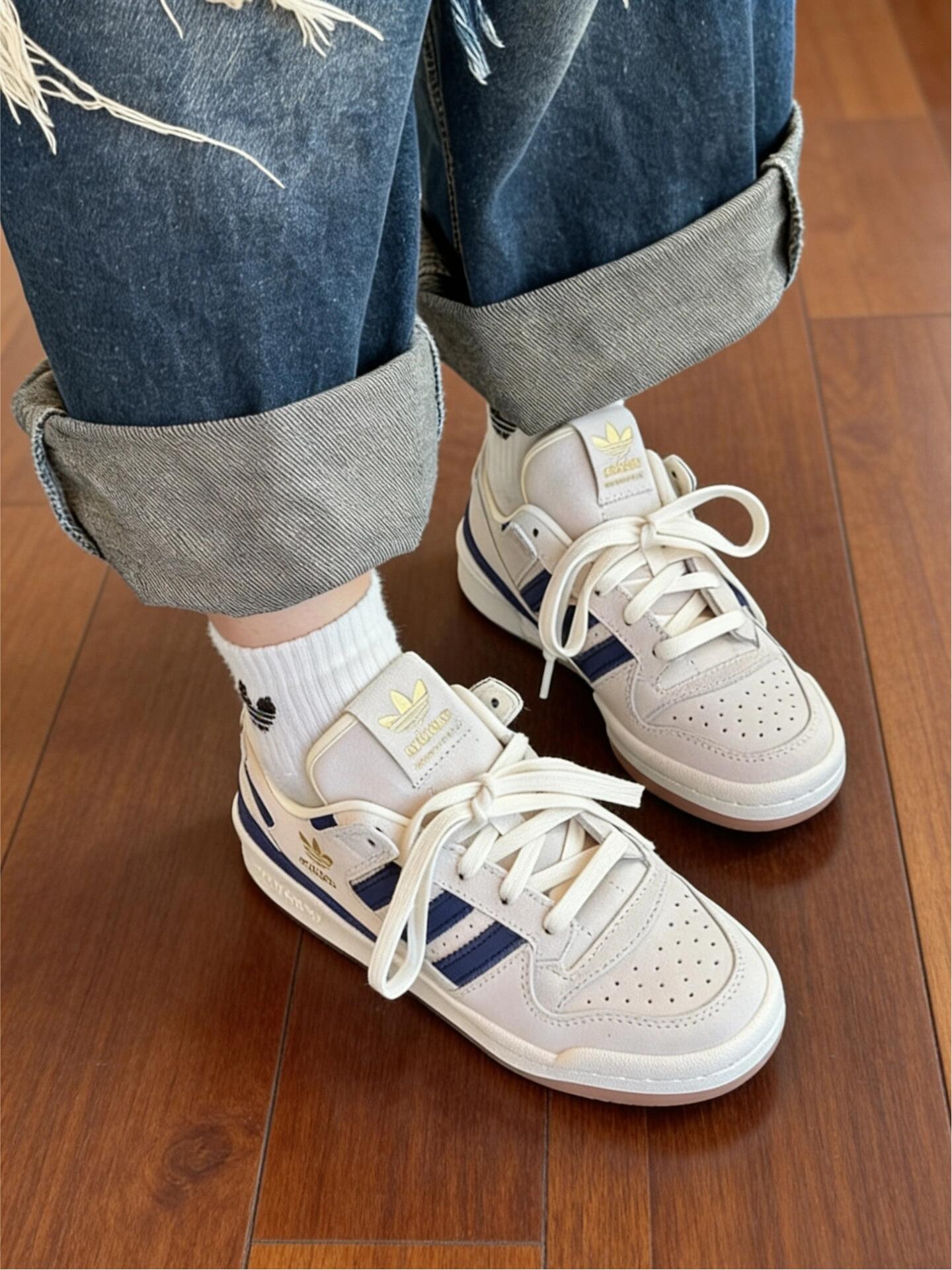 复古板鞋+撞色设计,这双鞋直接拿捏今年流行这双adidas Forum Low是我最近的出门首选,米白配藏蓝的配色经典又耐看,鞋身用了麂皮和光面皮革拼接,质感很在线。金色三叶草Logo是点睛之笔,低调又有细节。 鞋头的透气孔设计很贴心,春夏穿也不会闷脚。日常搭配卷边牛仔裤或者运动裤都很随性,通勤上班、周末和朋友逛市集都合适。鞋底软度刚好,走路久了也不累脚,属于舒服又百搭的一双鞋👟✨