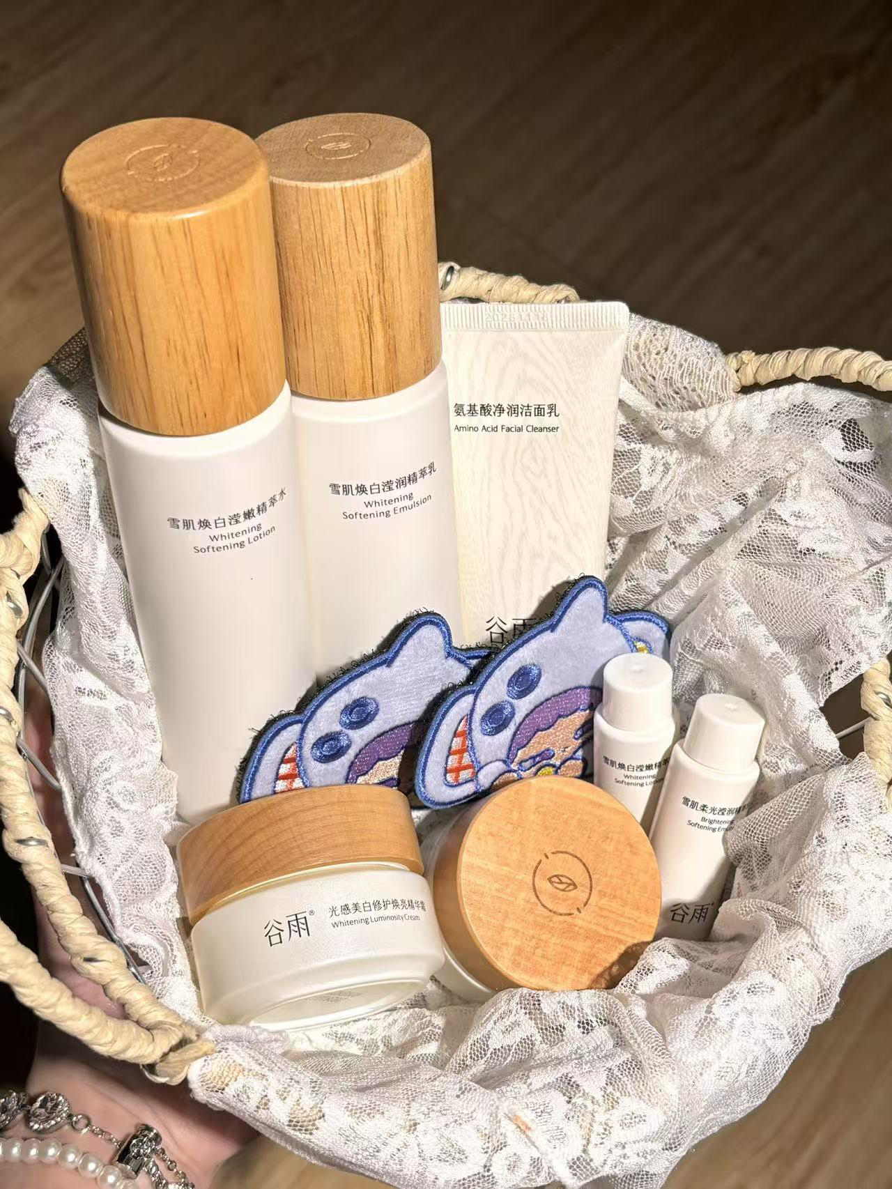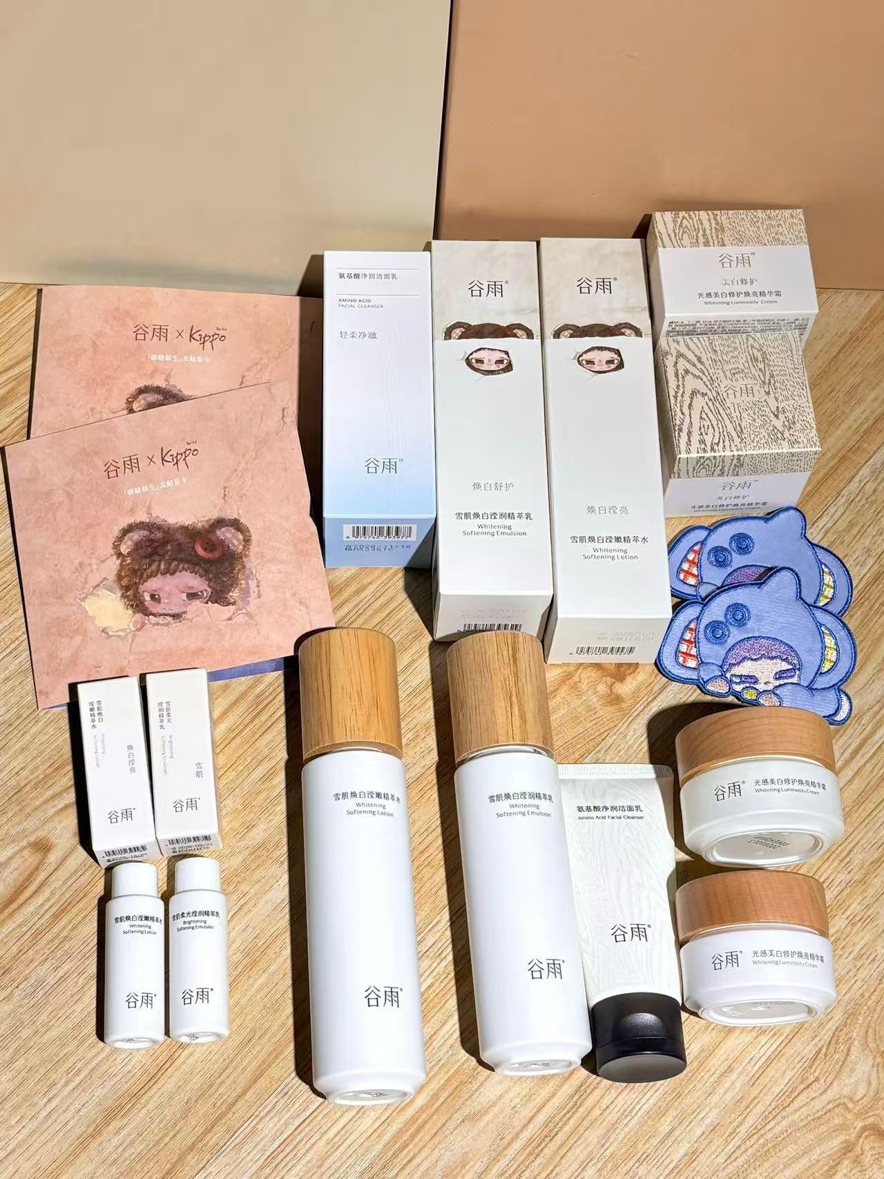 听说谷雨和kippo联名了,没忍住提前入手了 礼盒里面有东西很多雪肌水乳,奶罐面霜,洗面奶还送了很多小样和周边满满一盒 雪肌水流动性很高吸收很快 雪肌乳上脸很清爽但不会拔干 奶罐面霜质地轻薄 整套用下来脸上的黄气消了不少提亮效果也挺明显的 周边超萌刘海贴,贴在包包、毛衣上都超吸睛,洗脸时固定刘海也很实用 而且是礼盒包装的,不管是自用还是送人都很合适