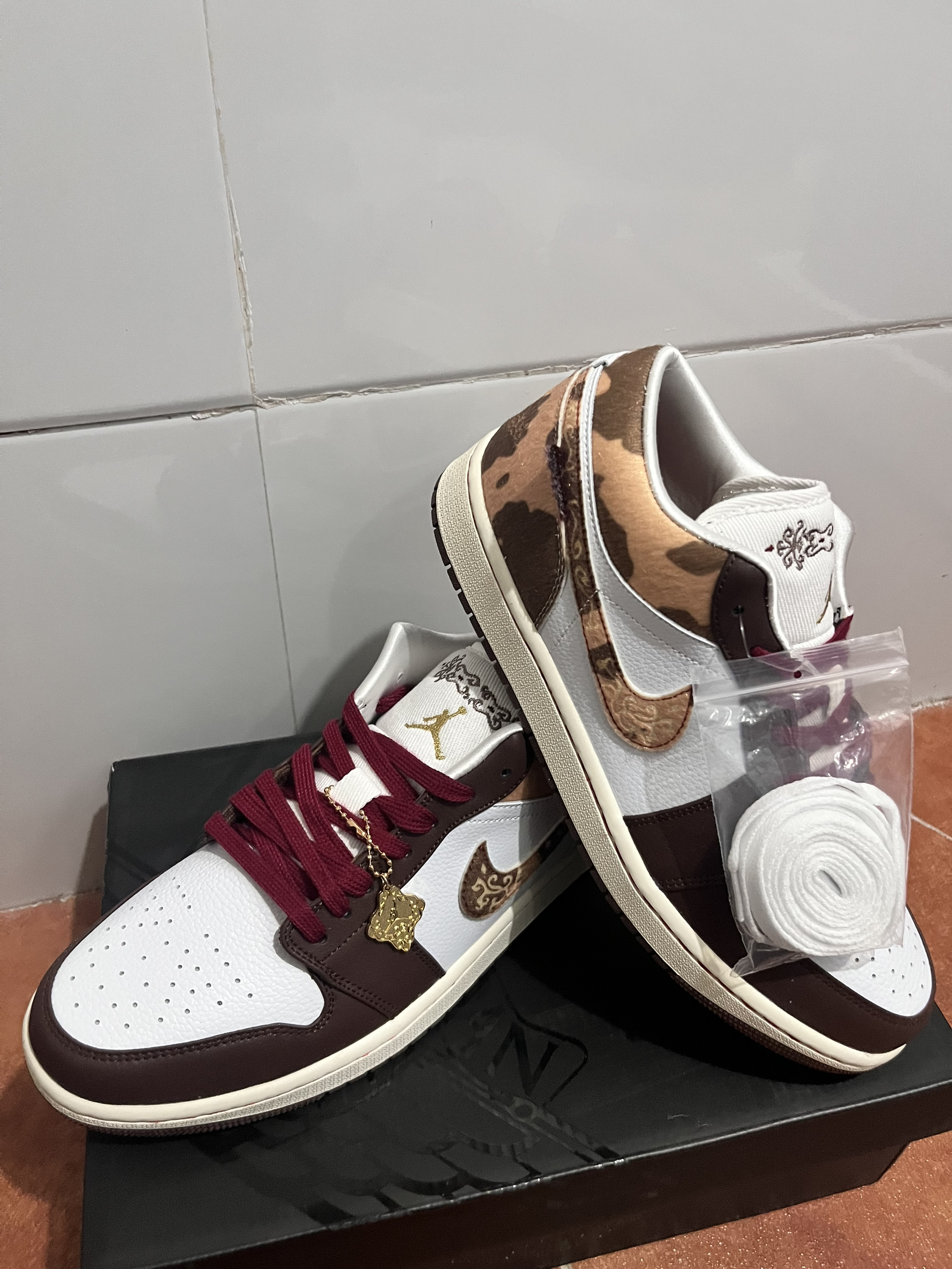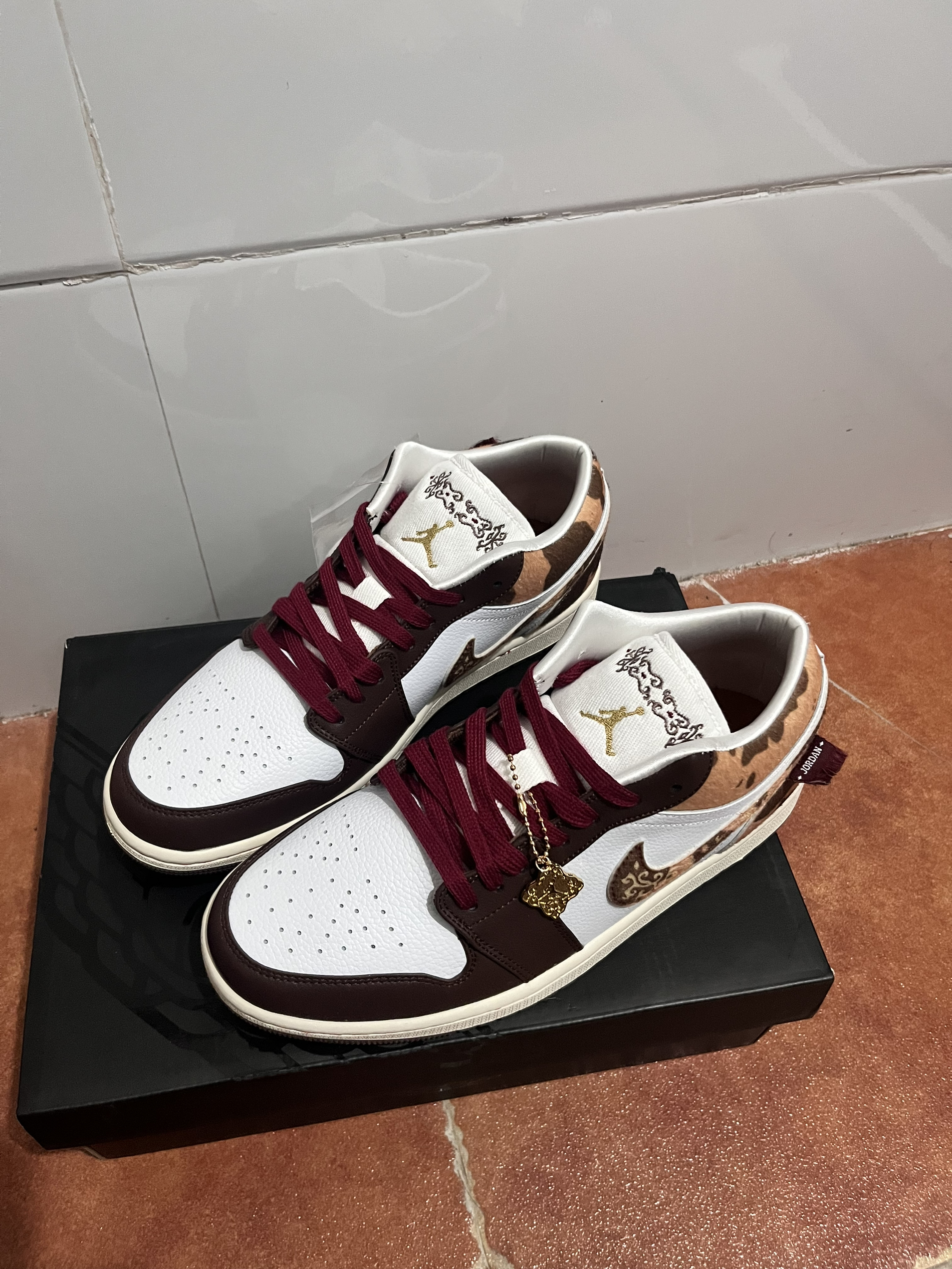 谁还没抢到这双AJ1马年限定?实物真的把年味和高级感焊死了! 白棕酒红的配色太戳心巴,奶白荔枝纹皮质干净清爽,深棕鞋头和鞋帮拼接,酒红鞋带点睛,上脚直接显贵。鞋侧Swoosh和鞋舌的马纹暗纹暗藏巧思,金色飞人Logo+鞋绳挂饰,细节拉满,妥妥的马年专属仪式感。 低帮鞋型不压脚背,日常通勤、拜年穿搭都适配,搭牛仔裤是复古潮人,配大衣秒变气质担当。新年穿这双,不仅颜值在线,还自带“马到成功”的好寓意,...