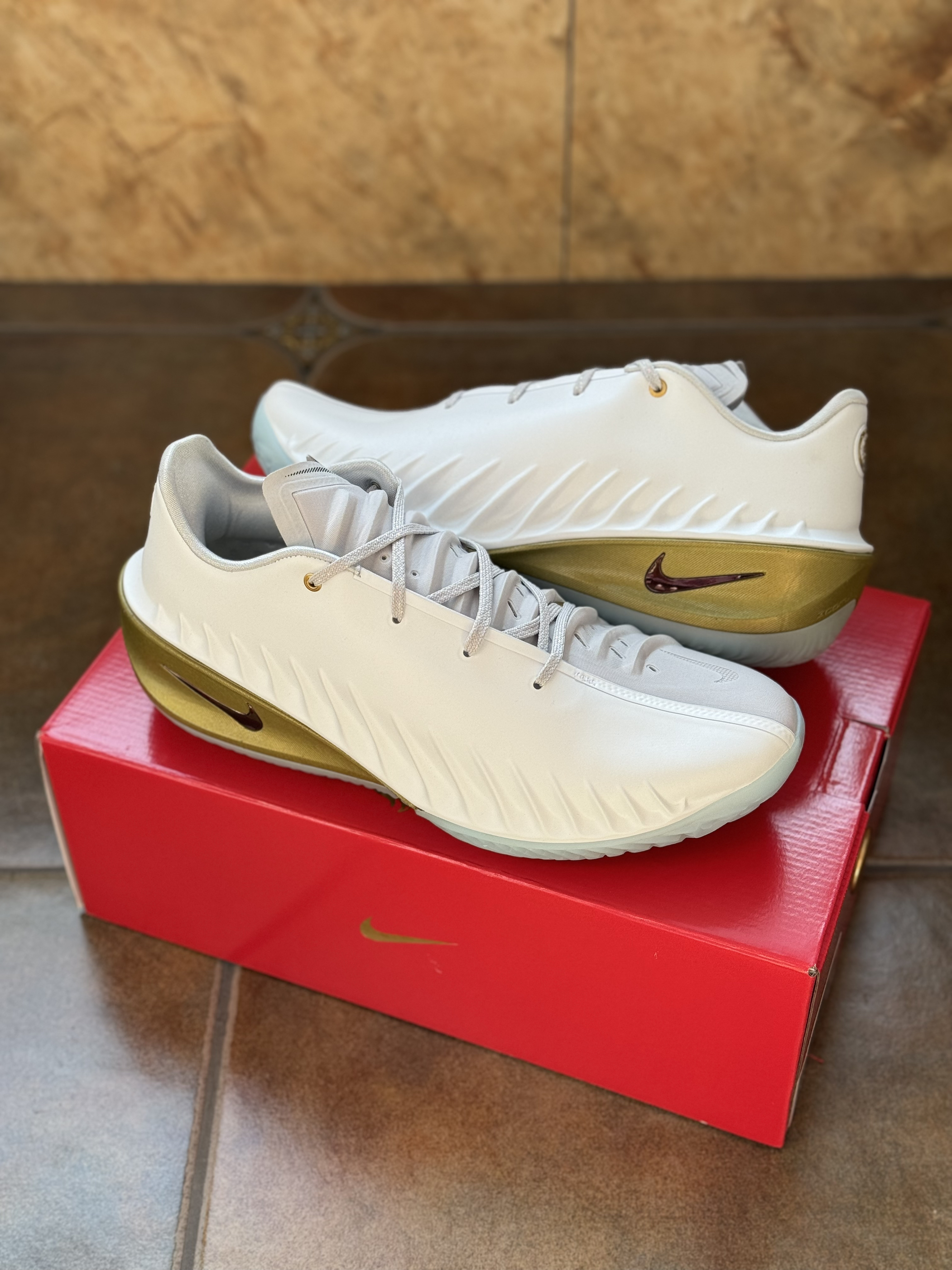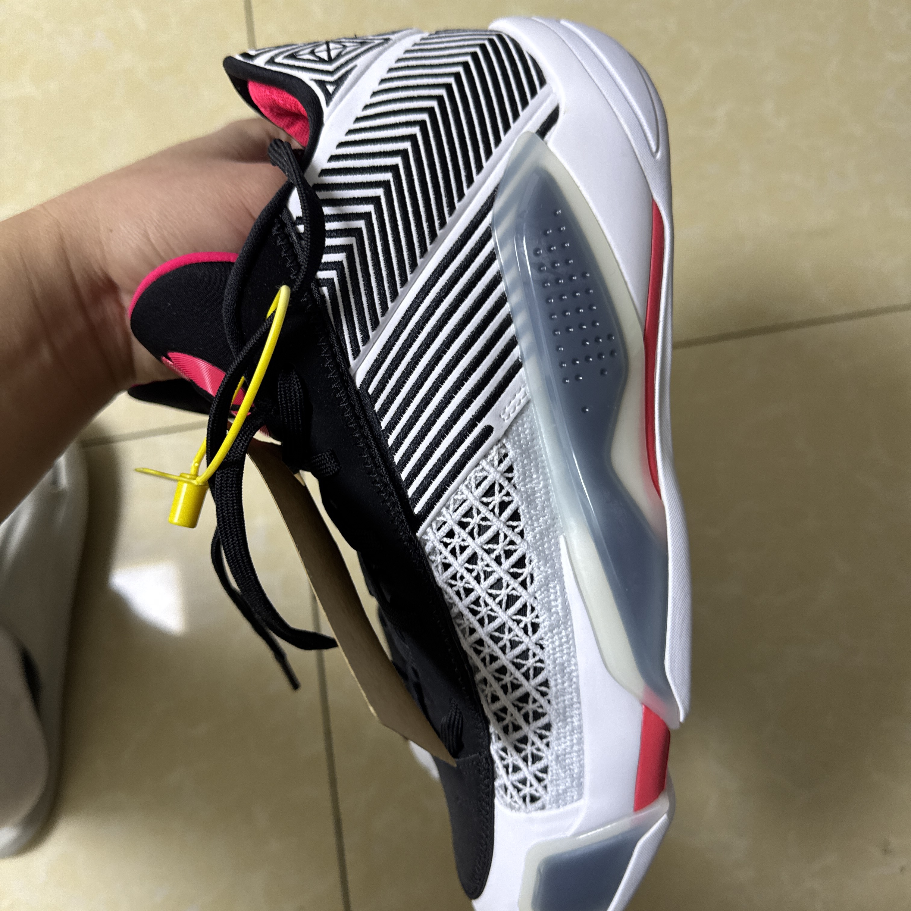 拿到手第一感觉是配色真的戳中过年氛围,粉蓝渐变混着金线,还有鞋侧的红色刺绣,长辈见了都夸喜庆。 上脚后包裹感刚好,前掌空间够宽,我这种宽脚也不挤。中底反馈偏韧,日常走路不震脚,打半场球缓震也够用。鞋舌的流苏挂饰拍照很出片,但走快了会晃到脚踝,我后来直接拆了。 缺点也很明显:鞋身的编织网面看着透,实际闷脚,穿俩小时袜子就潮了。另外鞋底的金色橡胶在室内地板抓地力一般,急停时会打滑。还有鞋身的金色装...
