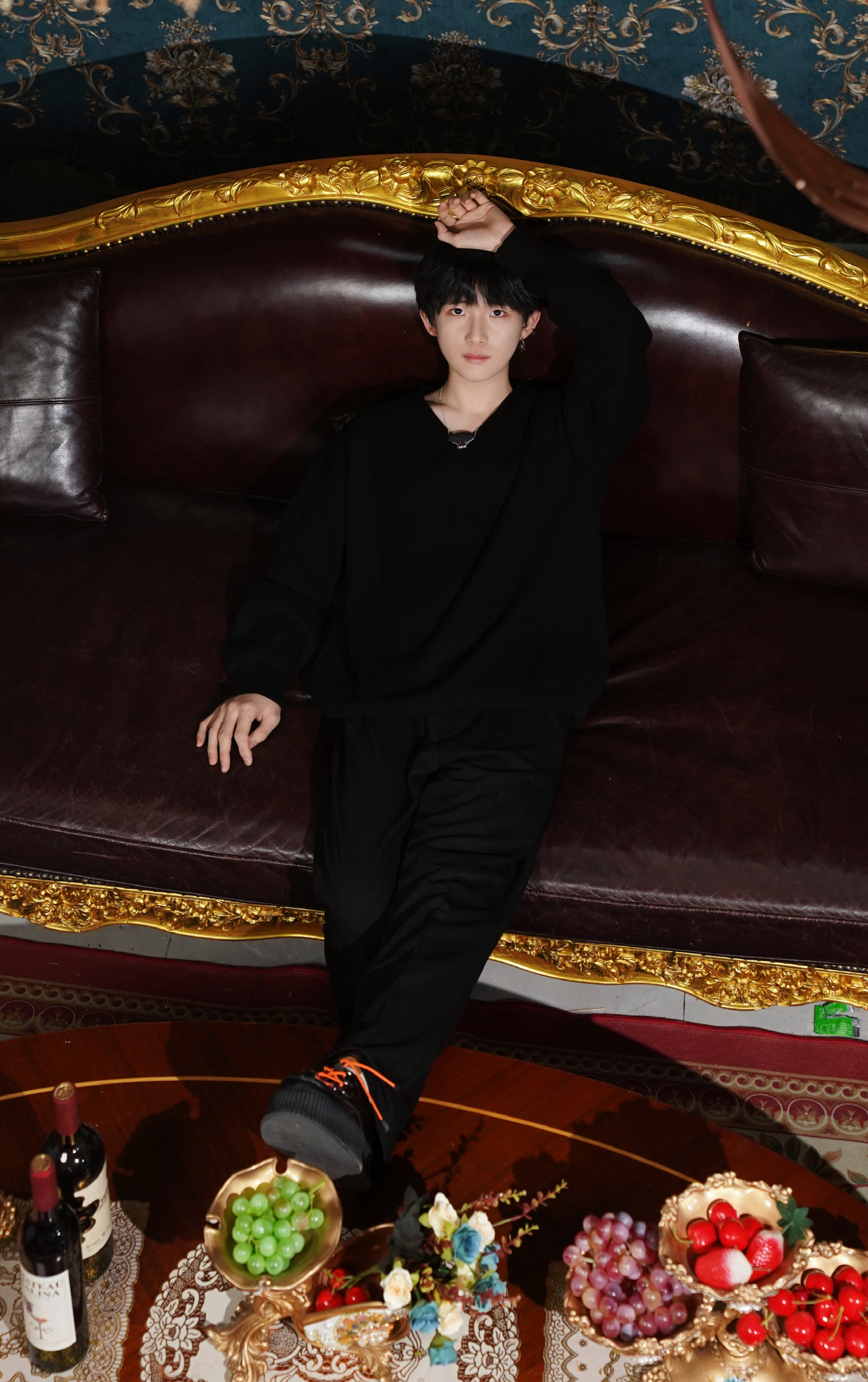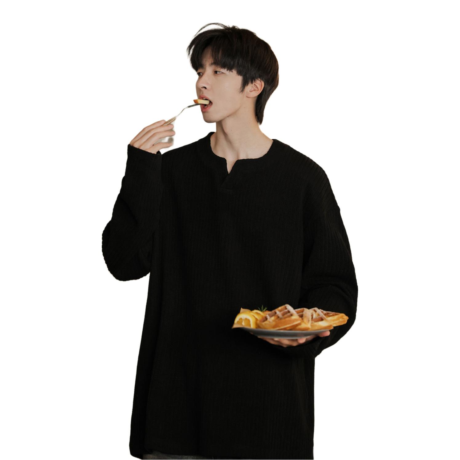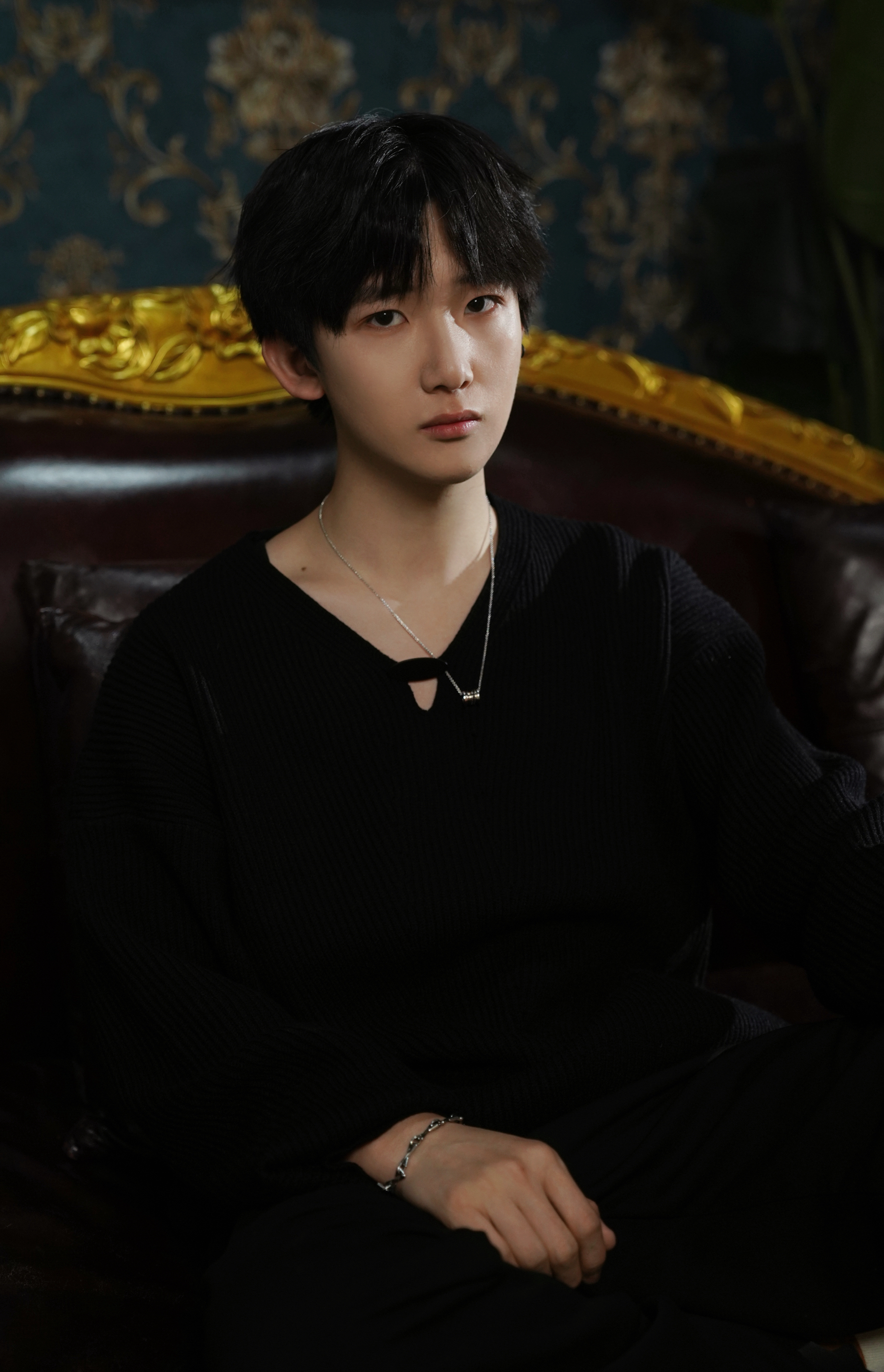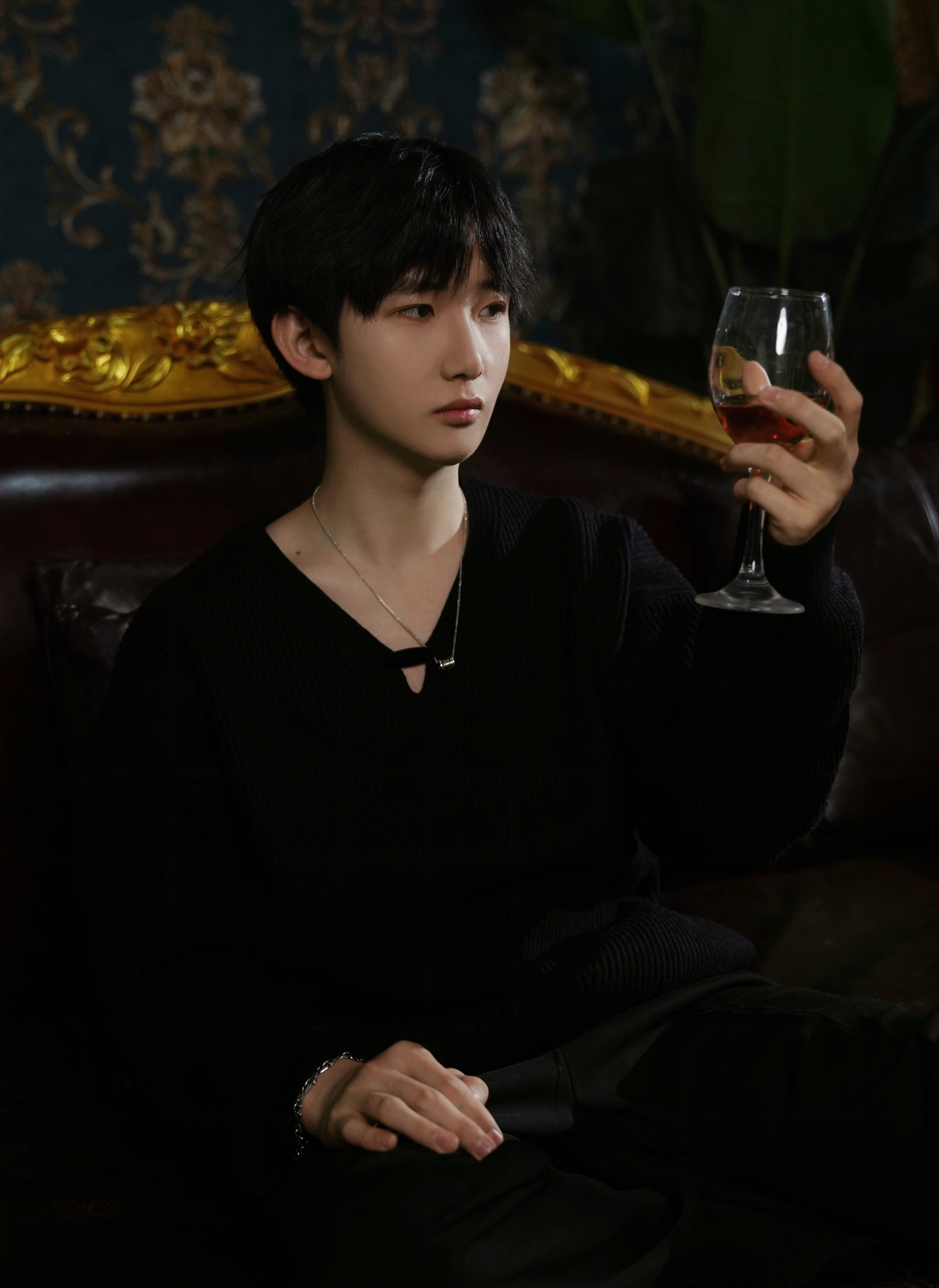 它不是那种软塌塌的料子,带点肌理感的针织纹在灯光下会泛着细腻的光泽,贴在皮肤上是温温的绒感,不会像硬挺的西装那样有距离感,但又比普通T恤多了几分沉稳。V领的剪裁刚好露出一点锁骨,配上细链项链,不会显得刻意,反而让全黑的穿搭多了一处呼吸感。 下装我搭了一条垂感很好的黑裤子,裤腿微微宽松,走路时会跟着步伐轻轻晃动,不会像紧身裤那样束缚动作。这种宽松感不是为了营造慵懒,而是让整体线条更流畅,坐在复古沙...