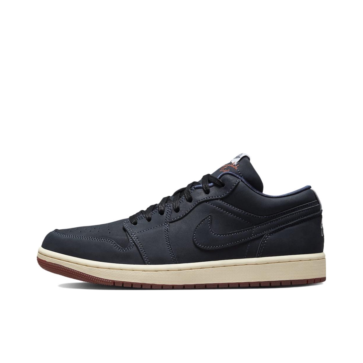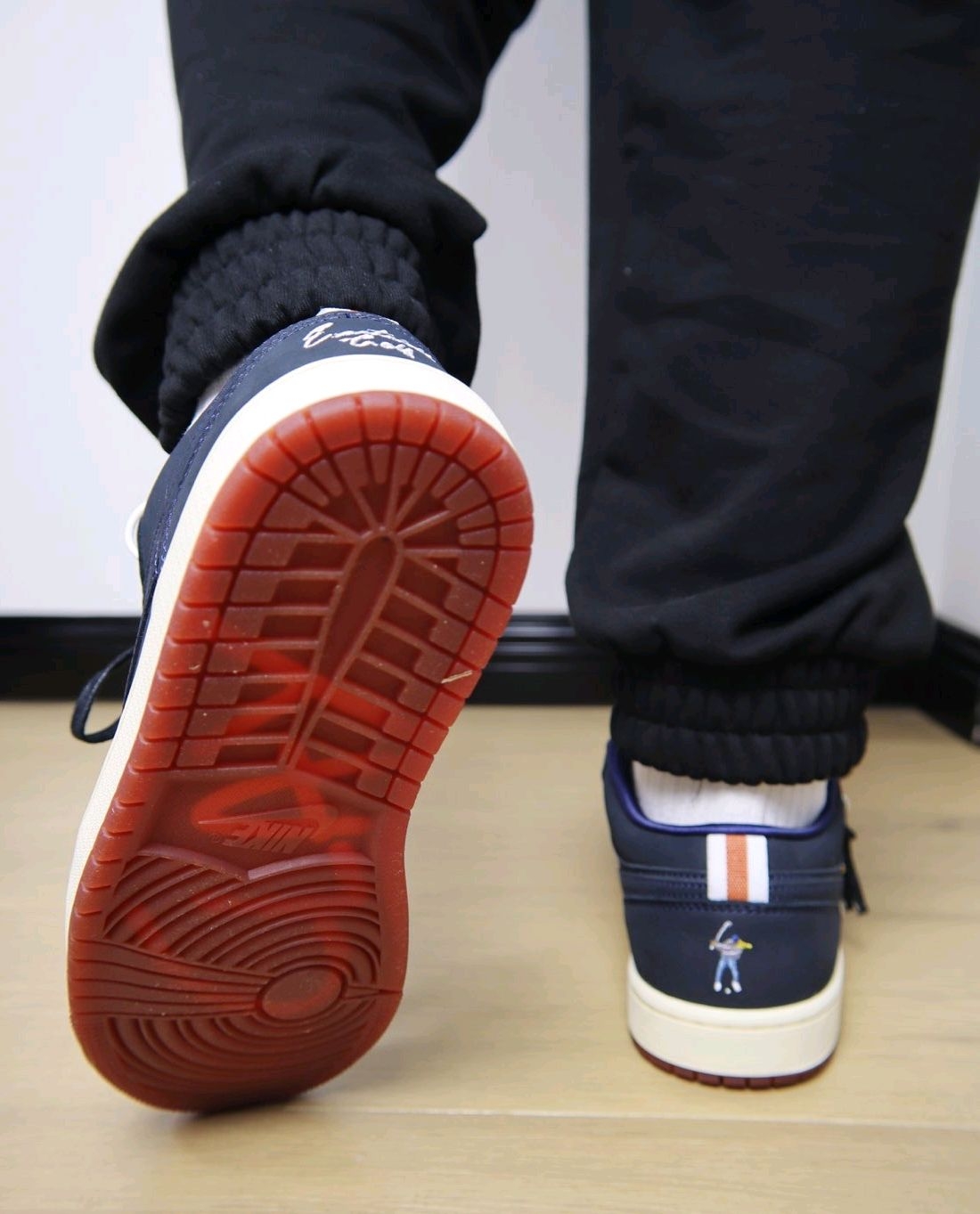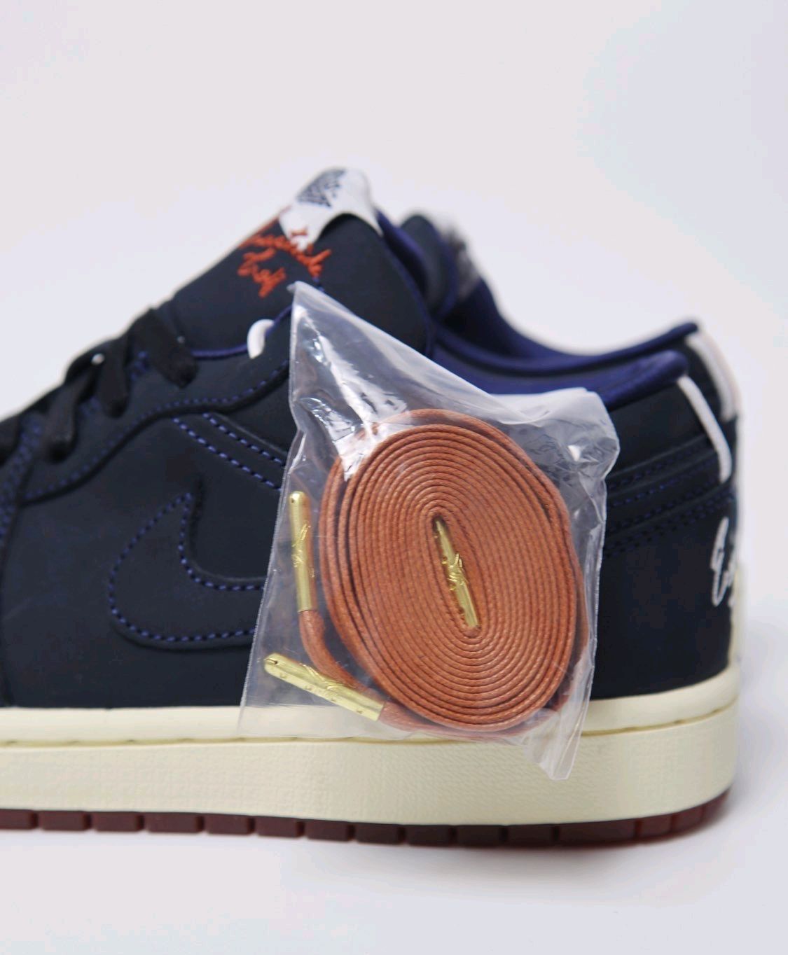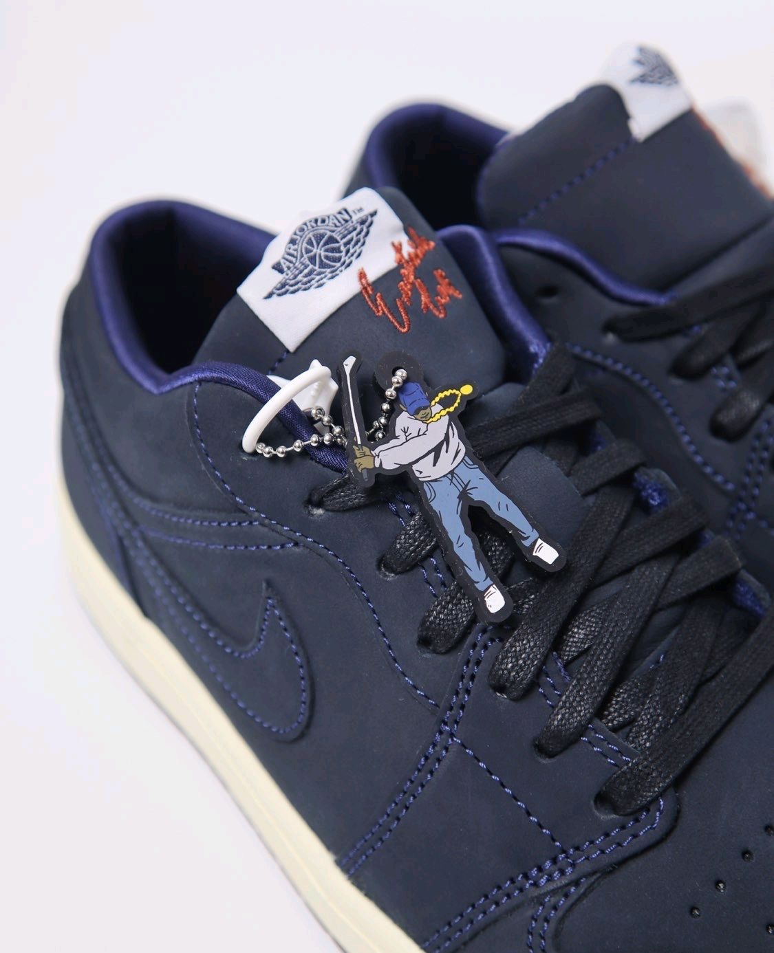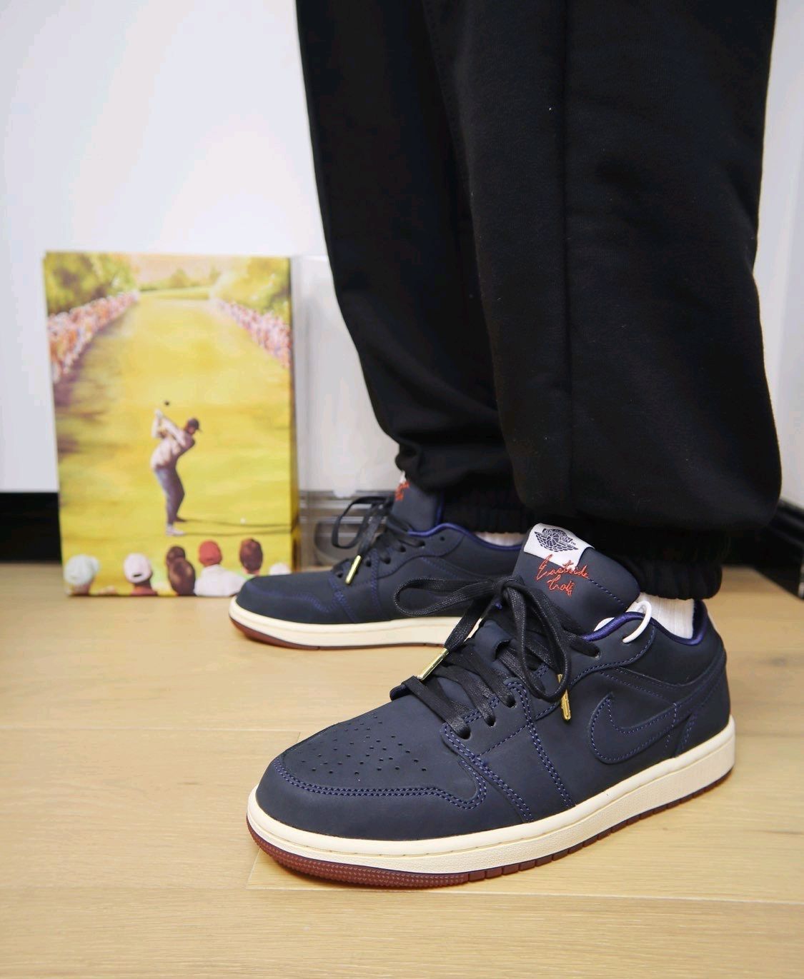 这双鞋热度并不高,但是质感真的不错,毕竟是双联名鞋款,原价1099,连鞋盒都是双层的,一层印有Jumpman logo,里面的则印有打高尔夫的场景图,这个规格还是很高的。 鞋身采用深蓝色牛巴革打造,鞋舌标边上还有红褐色Eastside Golf刺绣,左脚后跟为白色Eastside Golf刺绣,右脚则是打高尔夫🏌️的人形刺绣。半透明红褐色外底内部还分别写着“RED”和“CLAY”,组合起来就是红...