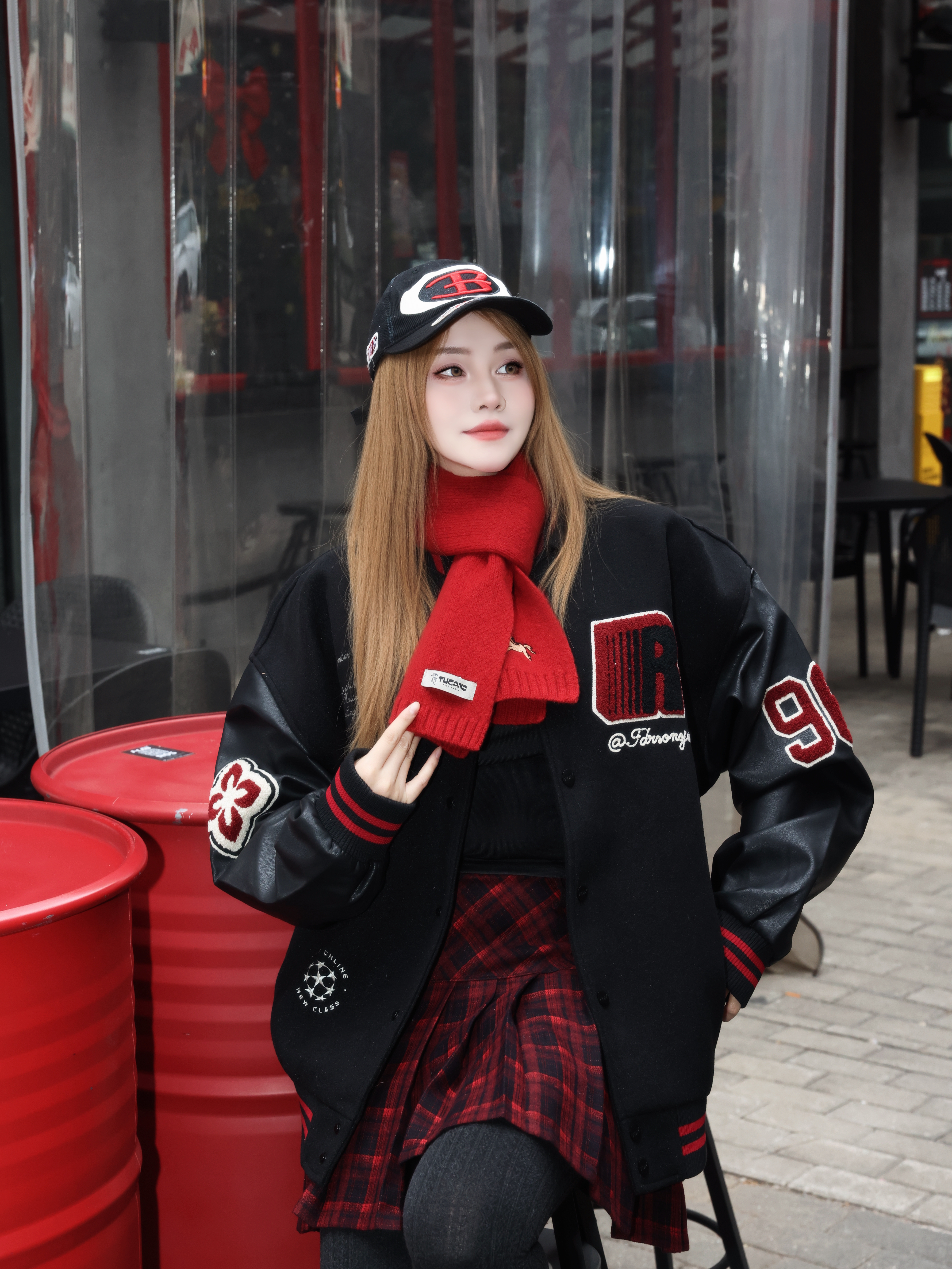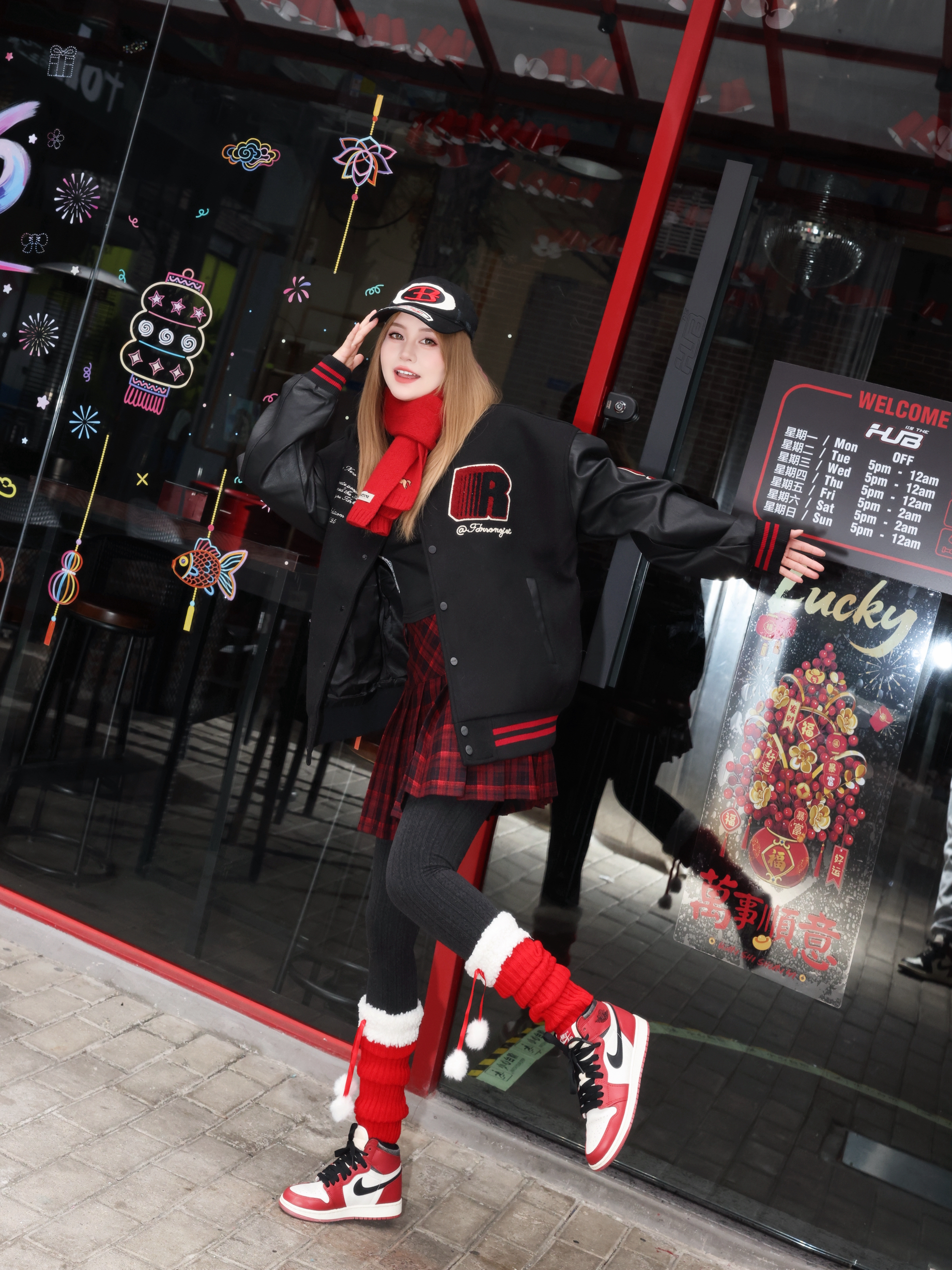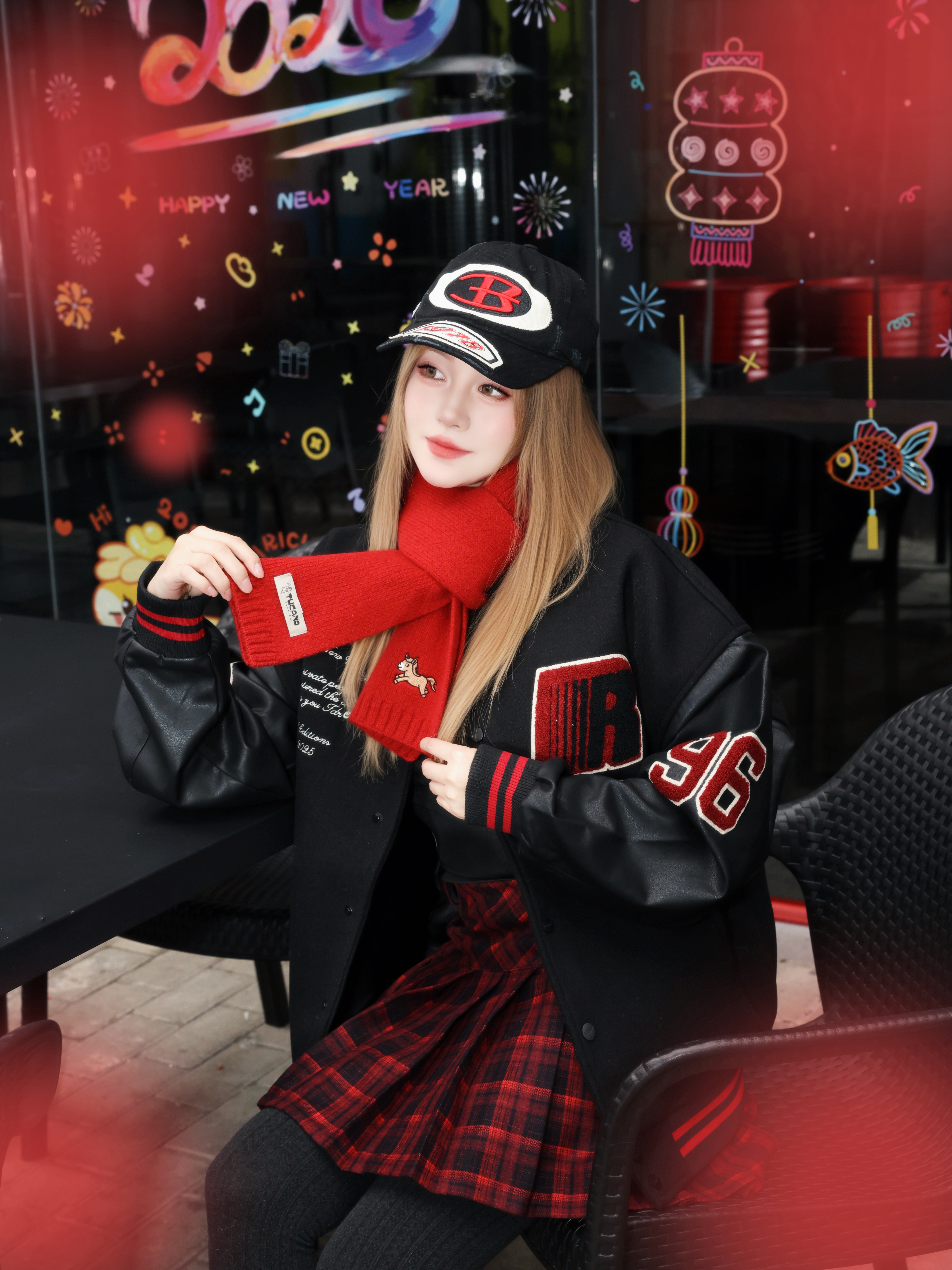 感觉下一秒就过年啦🧨 🐎马年开运穿搭 可以开始准备啦!! 身上搭的围巾🧣 配上礼盒设计真的好适合新年送礼啊! 100%纯羊毛+中国红的颜色❤️ 还有个可可爱爱的精致刺绣吉祥小马元素🐎 搭起来很显气色哦 一身酷酷的美式风夹克 搭今天的红黑色格纹裙 感觉就像是甜酷和学院风的结合 穿上同色系的AJ高帮球鞋会很有氛围哦