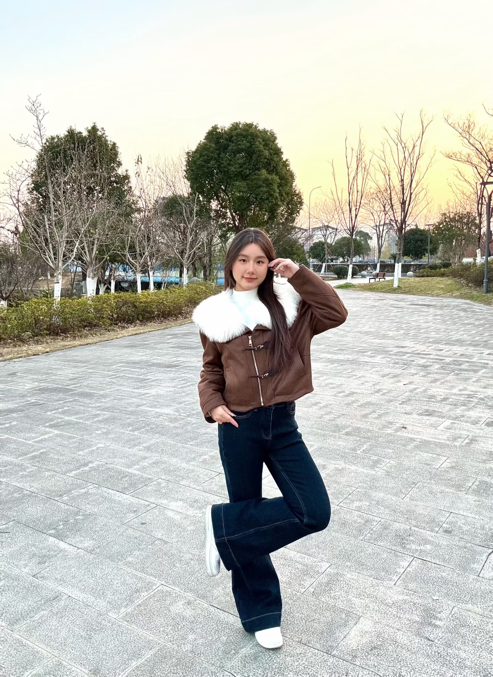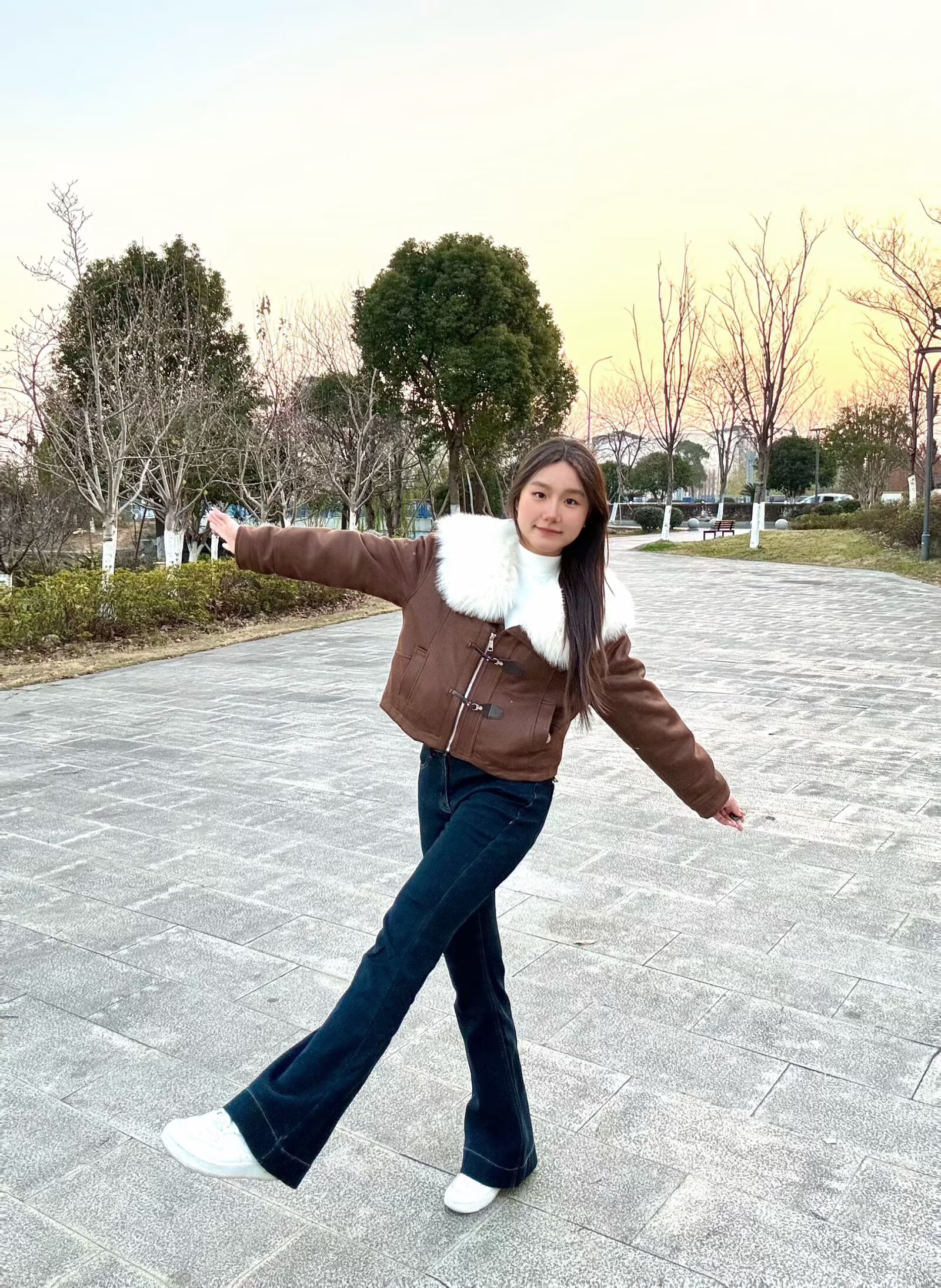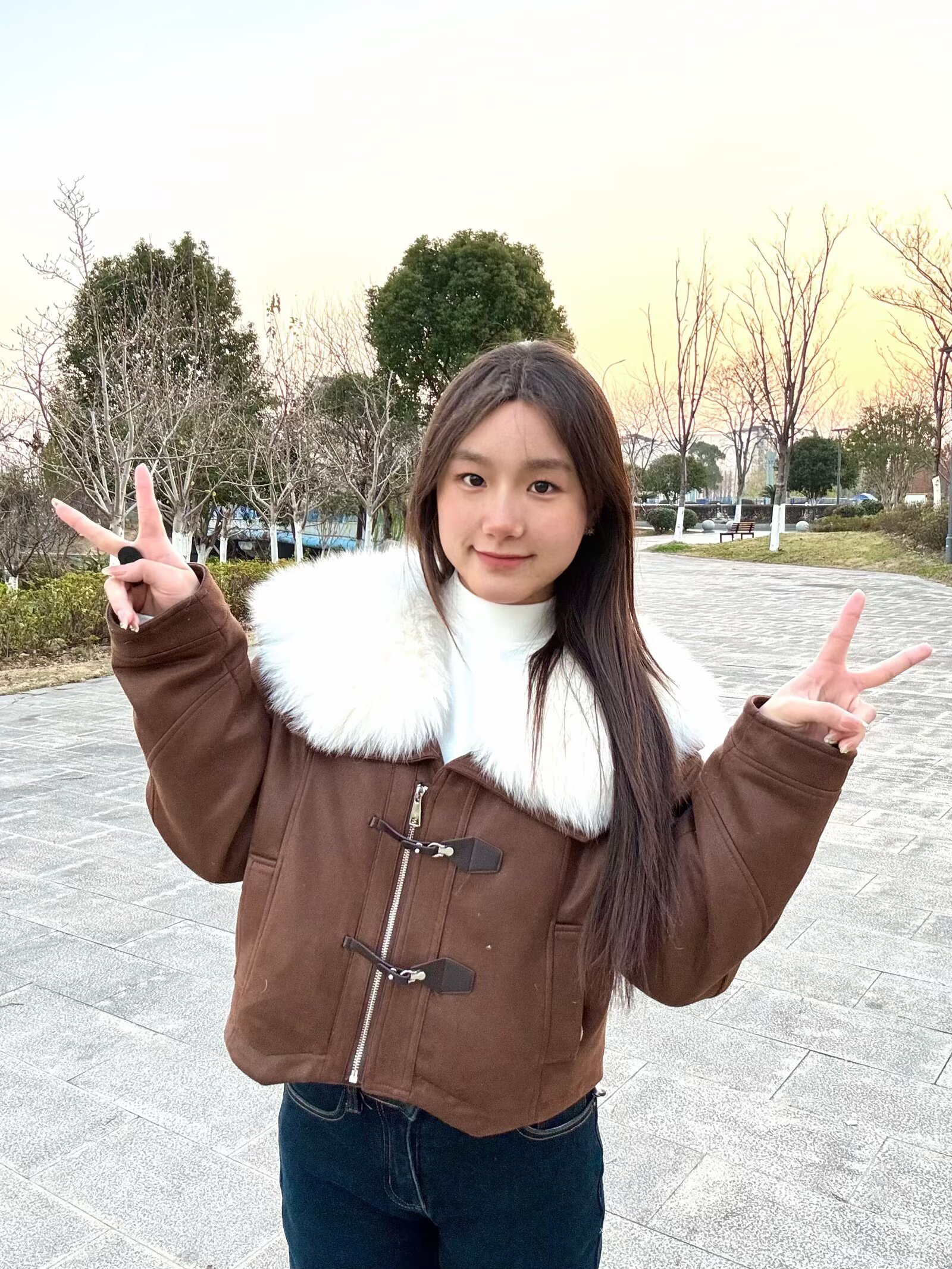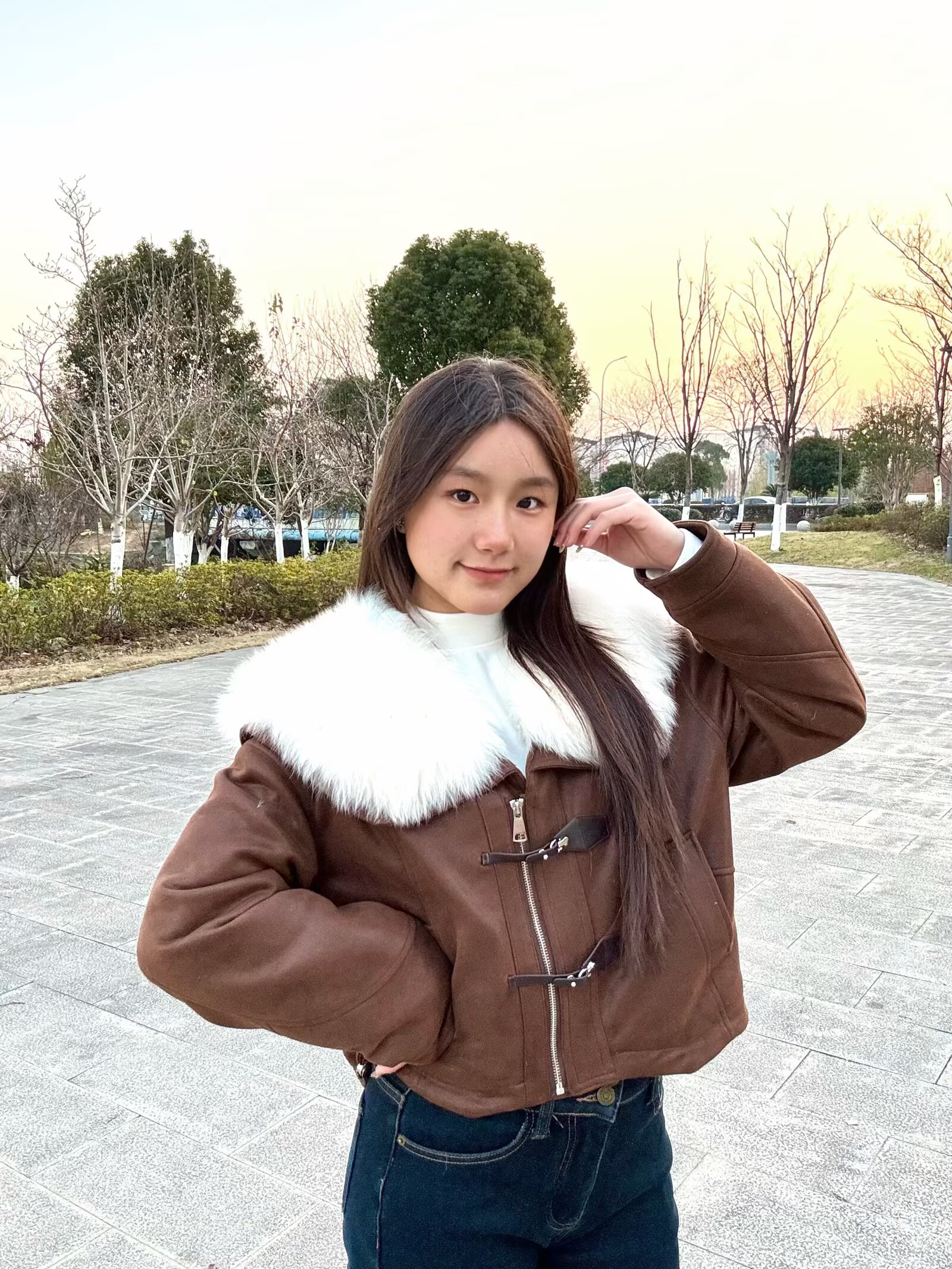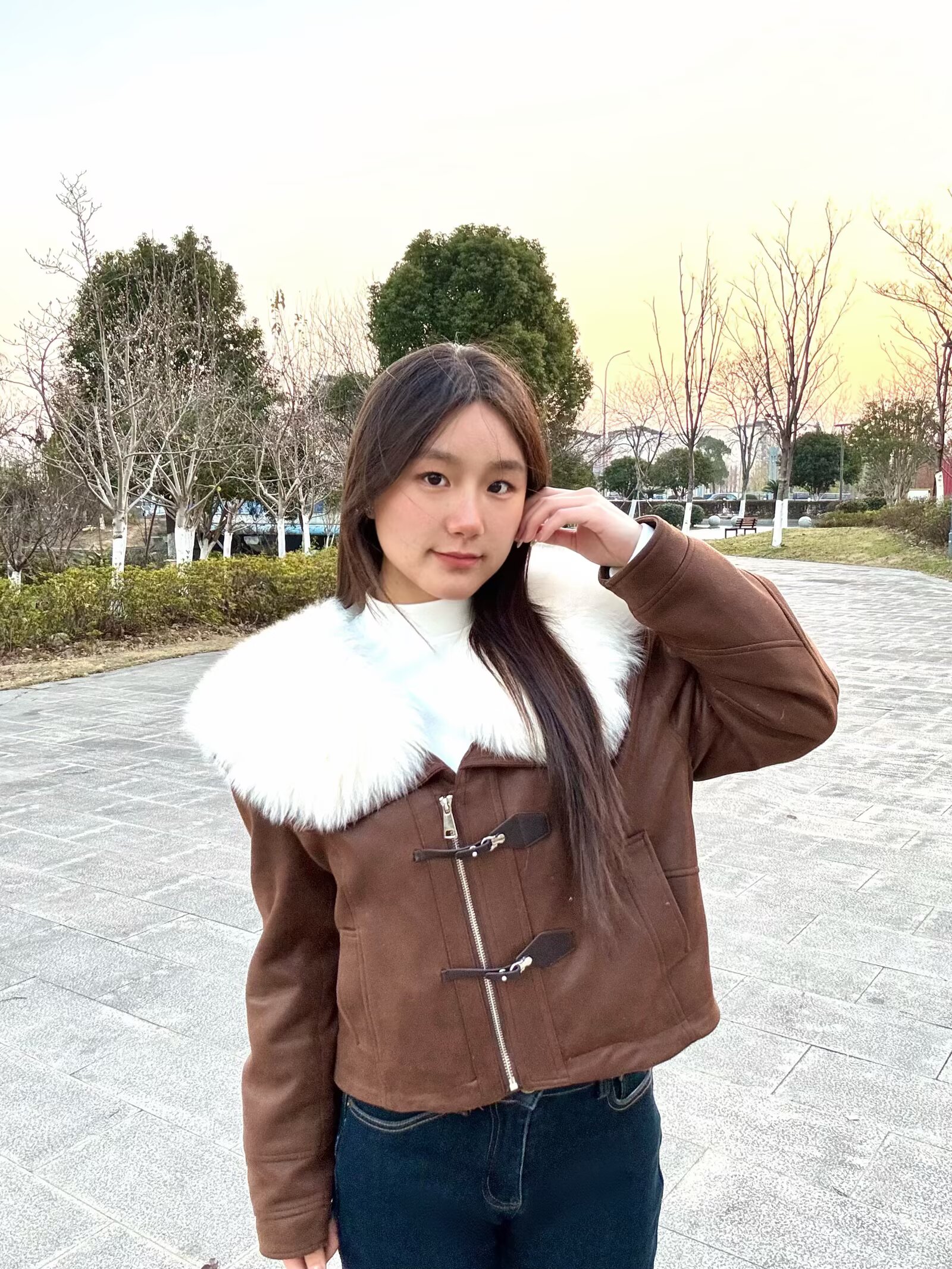 软乎乎的白色大毛领贴在脖颈处,暖呼呼的还特别显脸小,焦糖棕的色调温柔又复古,我搭了个白色高领内搭直接拿捏冬日韩系氛围感~🤩短款剪裁超显比例,对小个子也超友好,搭配微喇牛仔裤,腿立马显得长了😉面料是那种软软的麂皮感,摸起来质感超棒,牛角扣的设计还添了几分俏皮!日常穿真的好看又舒服~