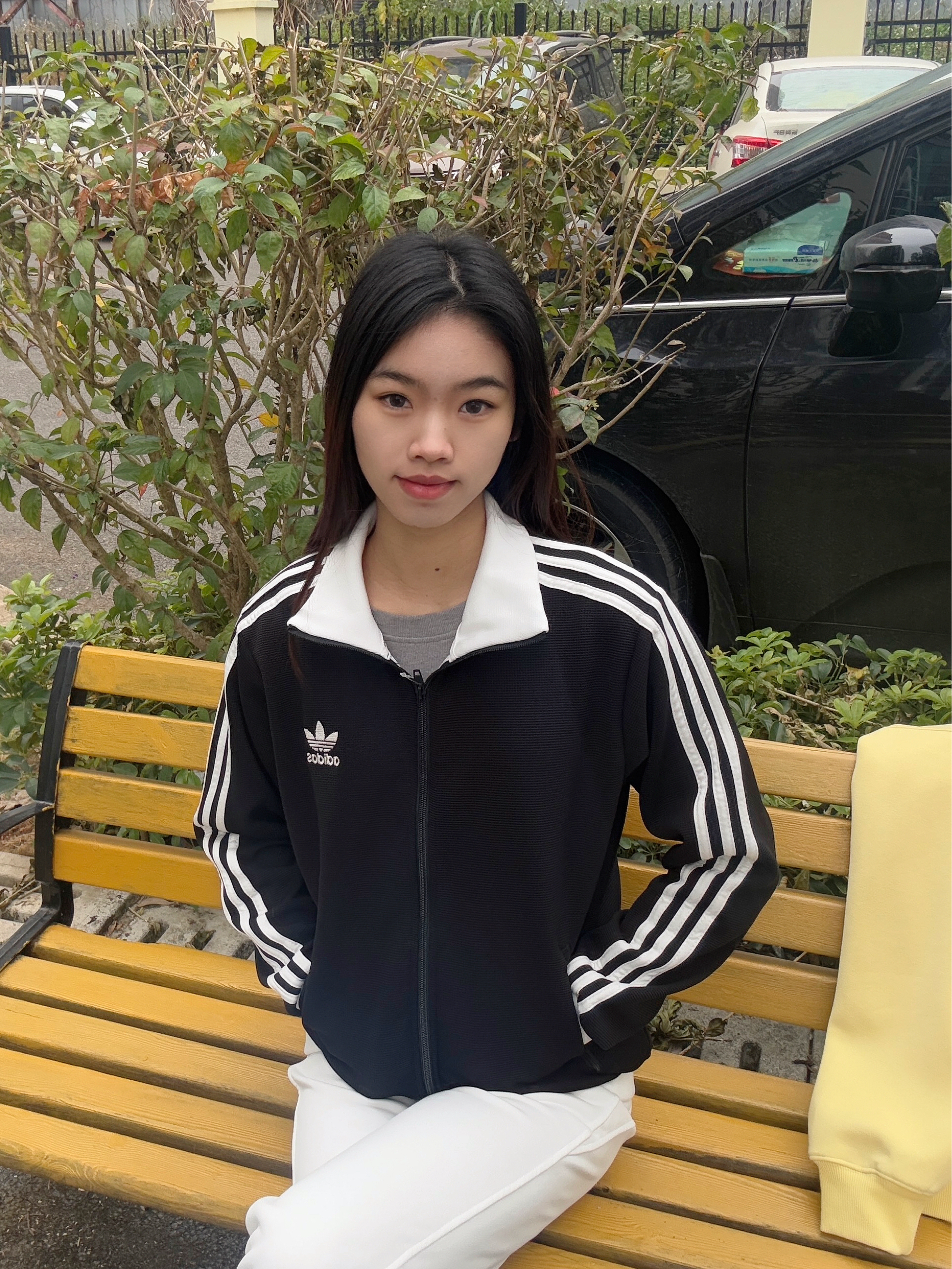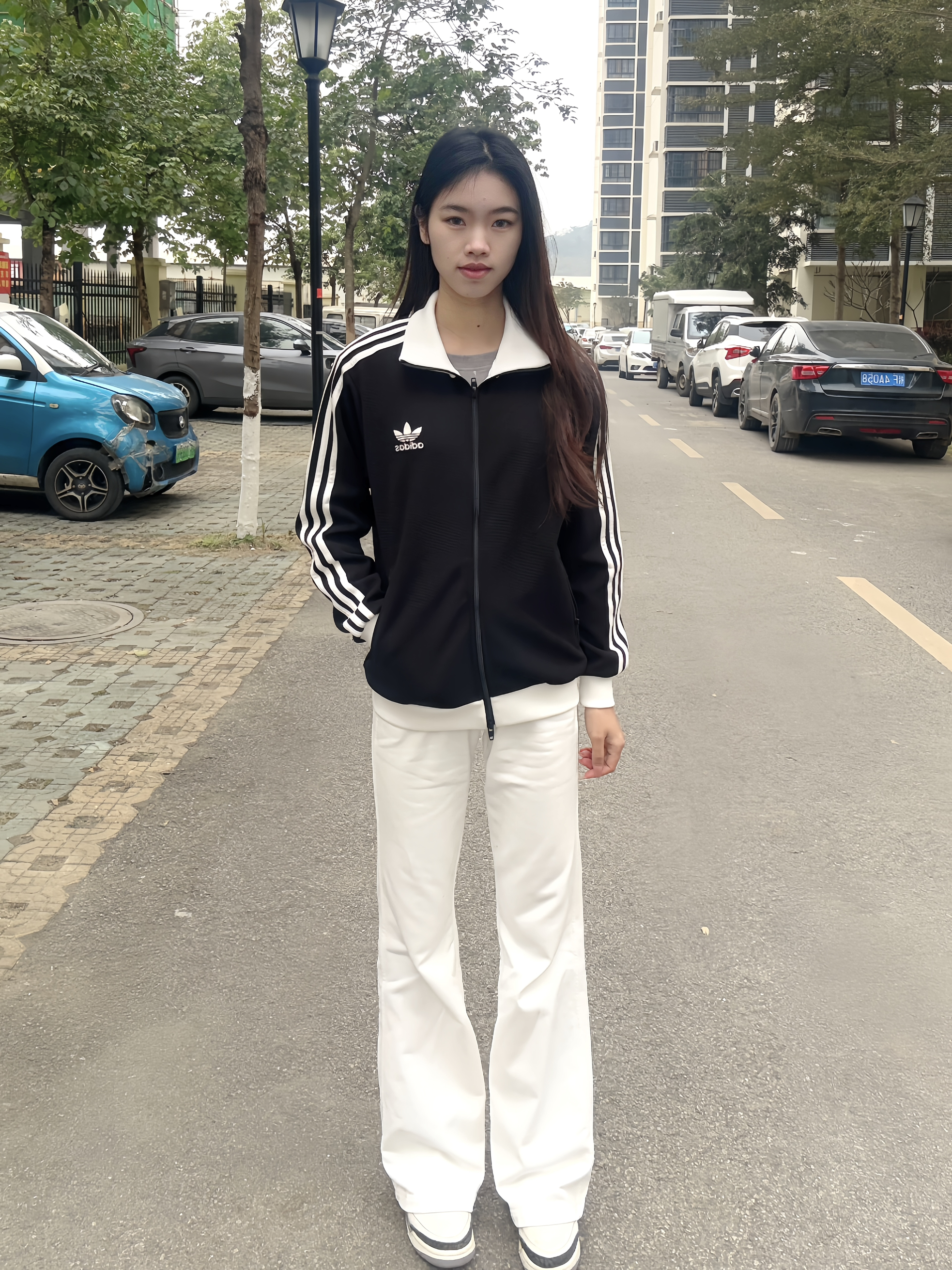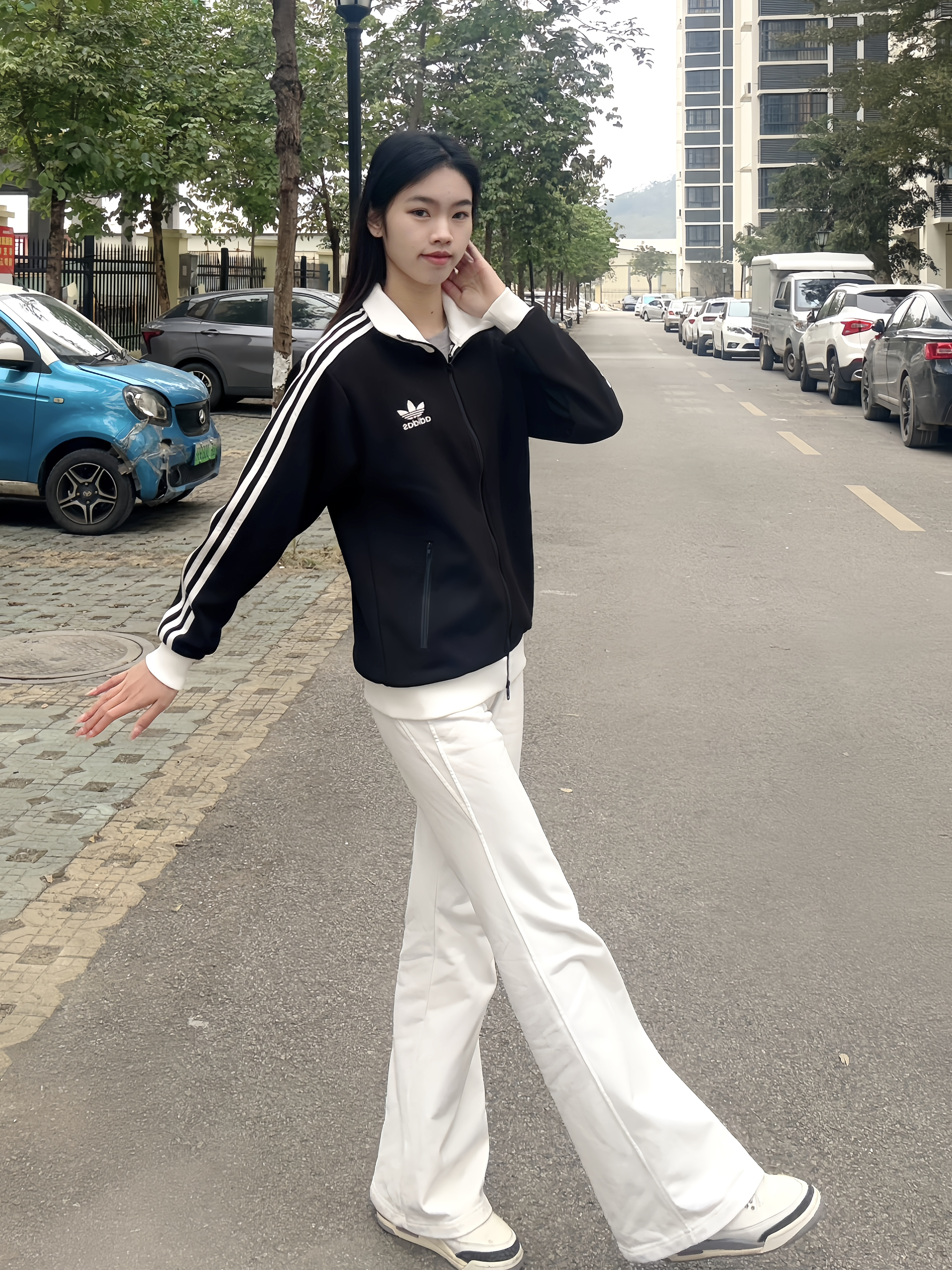 简约大方穿搭,干脆利落的外套🧥让人一眼看中🪄 贝贝们晚上好呀,今天出去玩穿的是经典阿迪外套🧥 面料很舒服,小logo设计很标准~~整体以黑色元素为主,白色元素为辅,回头率超高!🤩🤩 拉链设计是双开,袖子是收缩的很舒服自在💕💕 我选的是S码刚好合身,标准的尺码哦~ ✨✨💫 选中了白色卫裤作为搭档,一身下来显高又显气质呀~平常搭配其他裤子也很很酷,你们最喜欢怎么搭配呢?