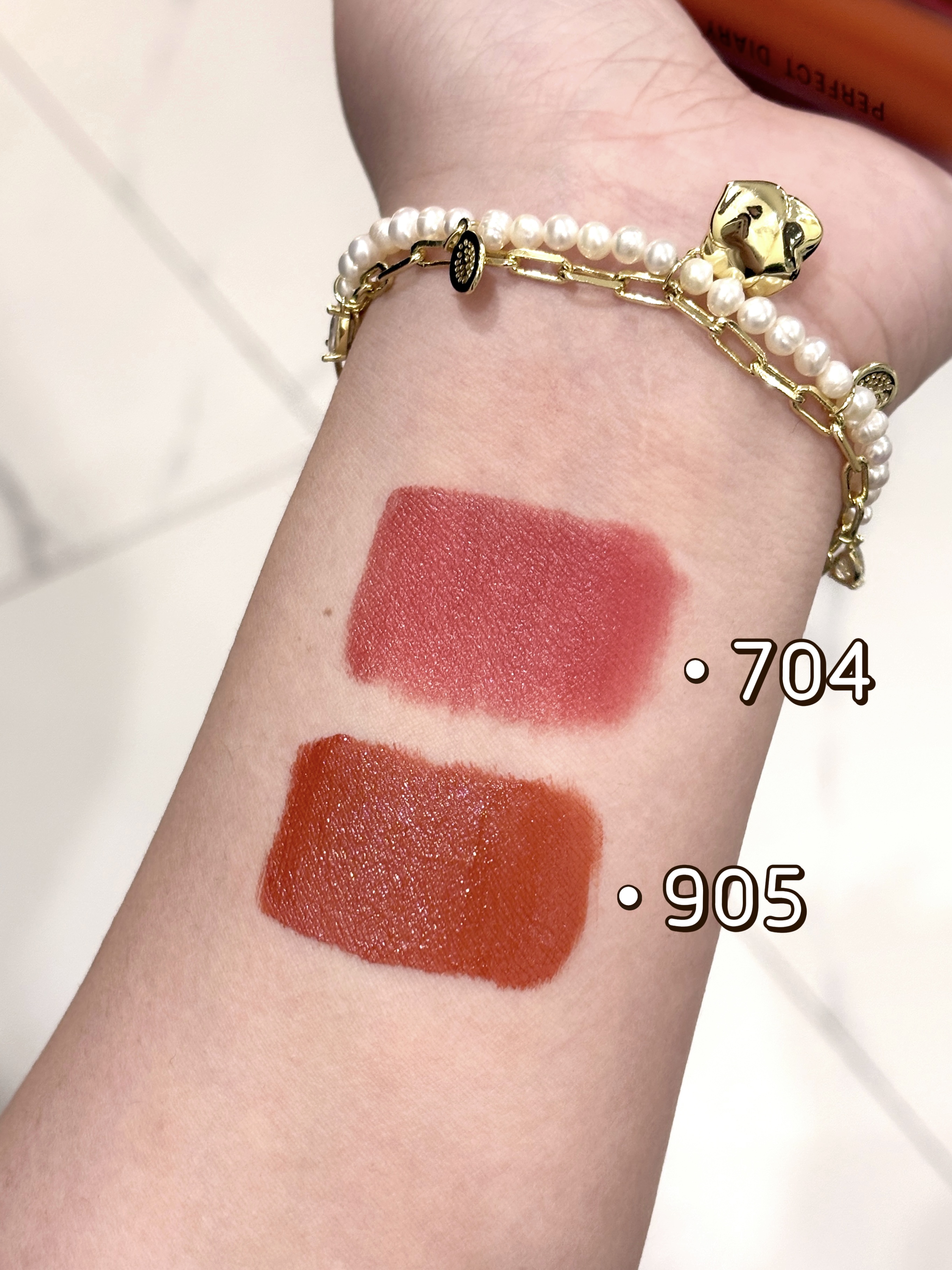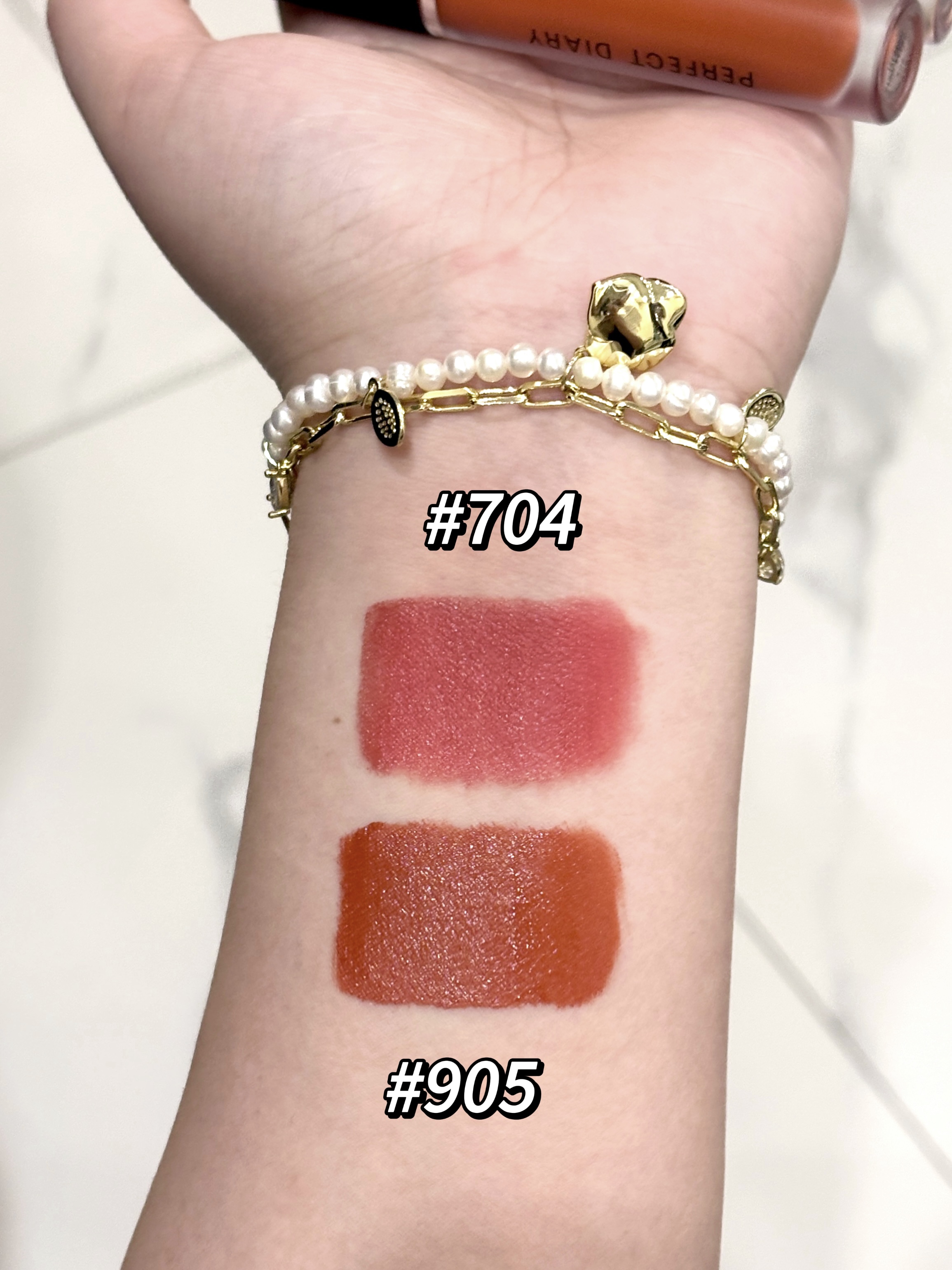 完美日记唇釉真把我惊艳到了 还有黑色的礼袋包装仪式感满满 我这两支色号是704和905 704是温柔豆沙色 905复古橘调 都是日常百搭的色号 显白不挑皮 它是丝绒哑光质地 敲击丝滑 柔雾的妆效 我这干唇涂也滋润 感觉挺适合春节约会时候涂的 自己用或者拿来送朋友也合适呢