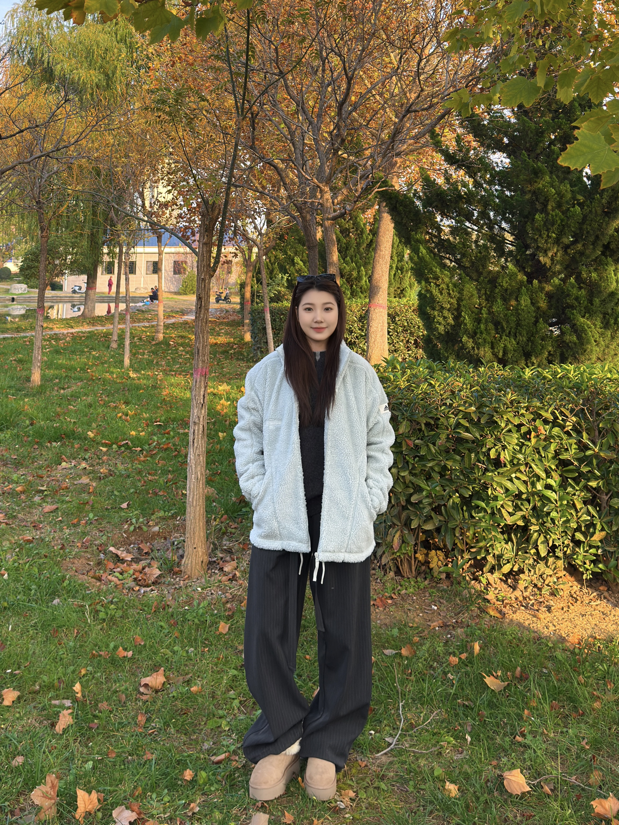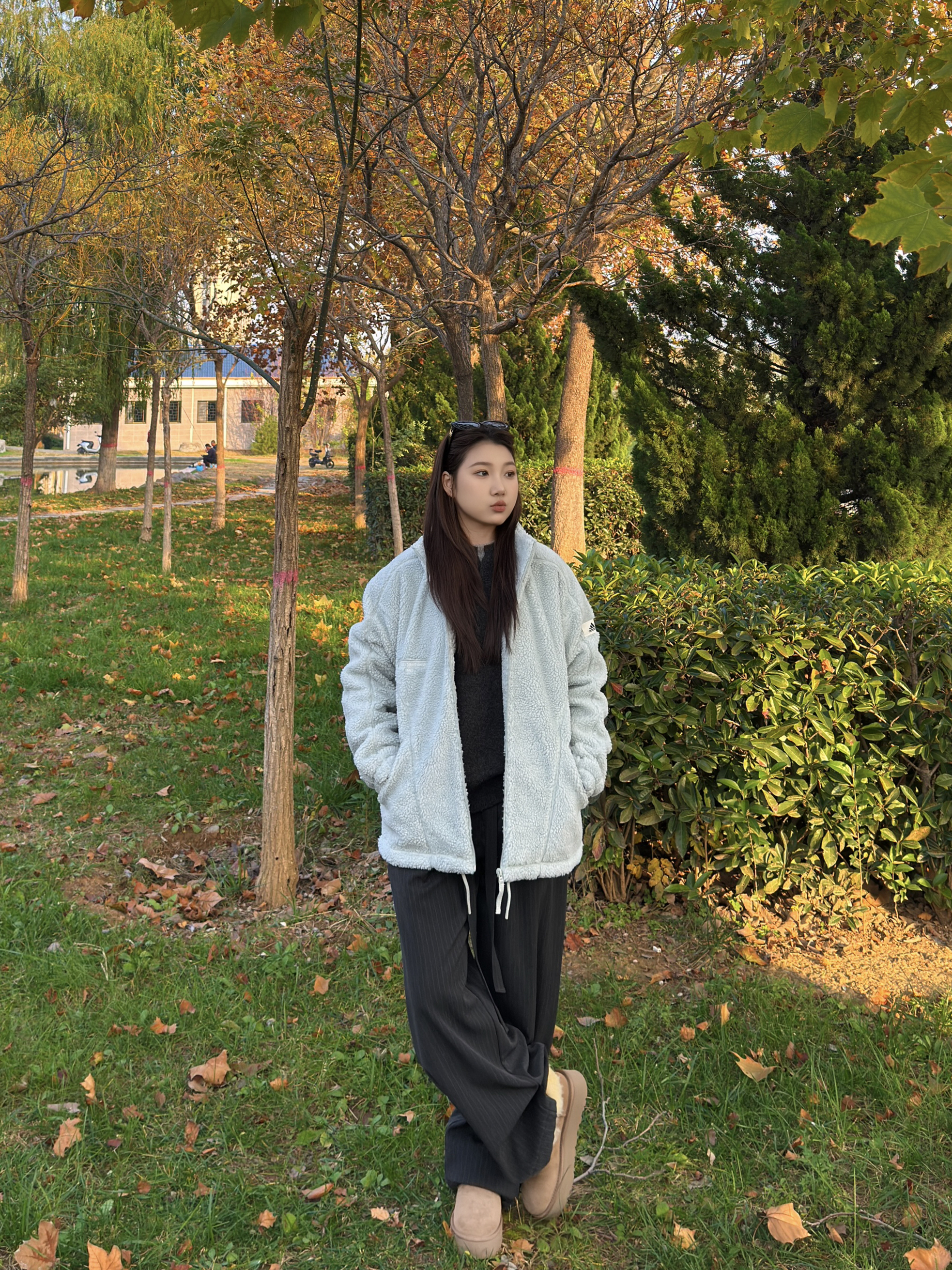 姐妹们!降温后的第一件外套我已经帮你们试过了! 这件奶蓝色的毛绒外套摸起来像把云朵穿在身上,保暖又不显臃肿。 里面随便搭一件深灰色打底衫就很有层次感。 下装配一条垂感满分的黑灰色坑条阔腿裤。 整套穿搭慵懒又显瘦~
